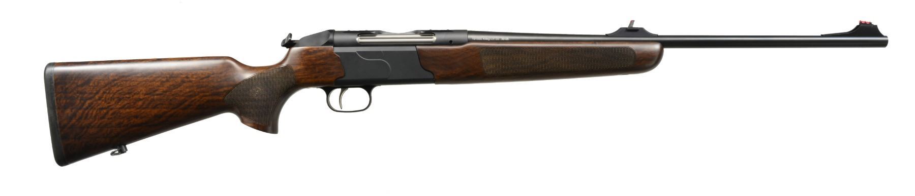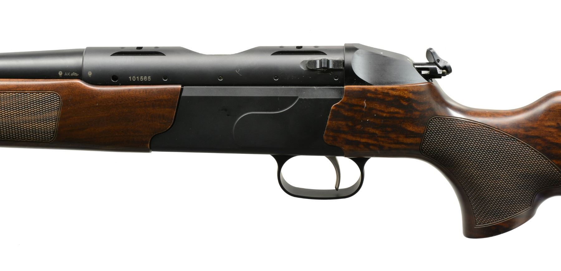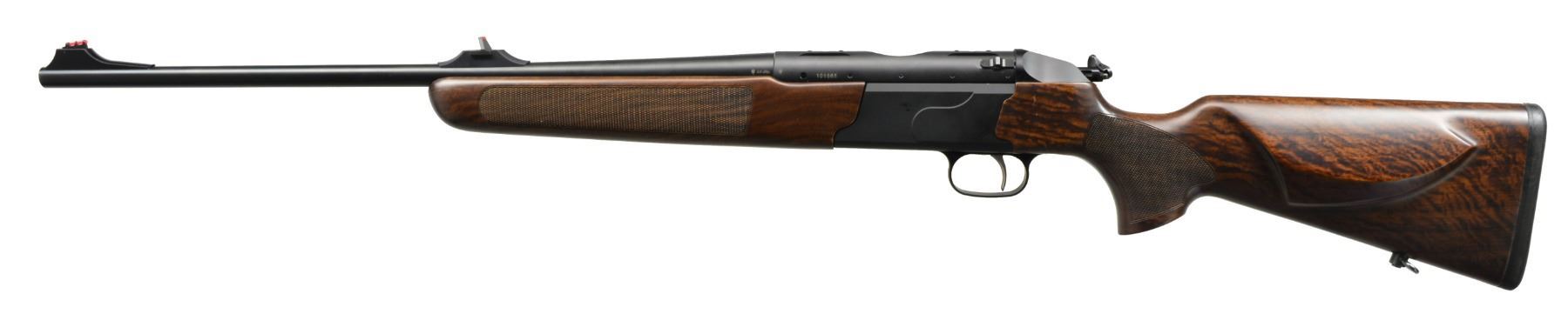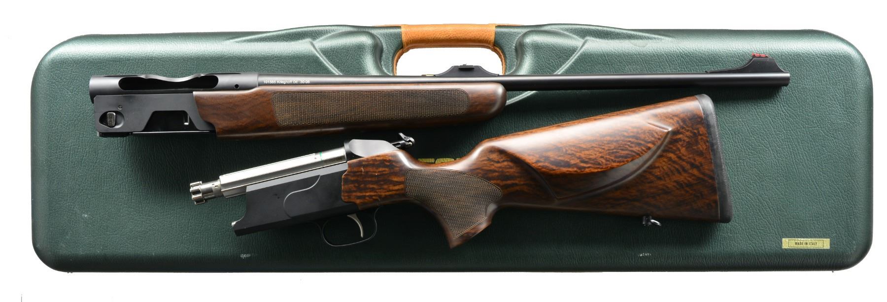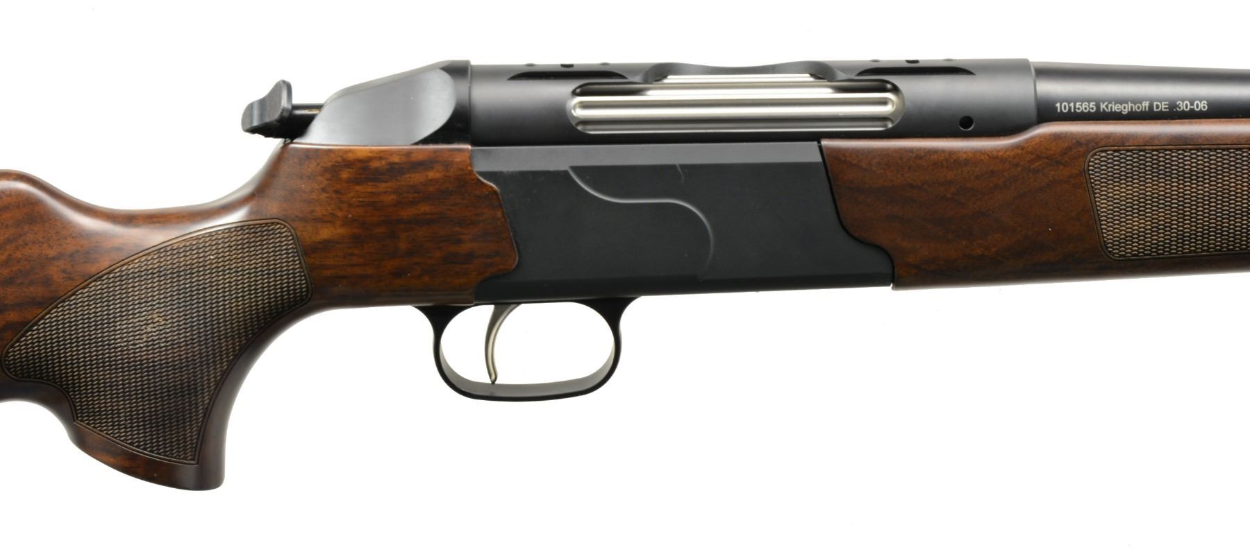 WITH CASE. Cal. 30-06. S# 101565. Innovative rifle w/ combination cocking device/safety, takedown feature, set trigger & detachable mag. Bbl. 21 1/2" fitted w/ light gathering open sighting system. Top of action is milled for Krieghoff scope rings. Pistol grip stock of unusually marbled European walnut measures 14 5/8" over black rifle pad & features modified Bavarian right hand cheekpiece, right hand palm swell & laser checkering. Forend is attached to front sliding bbl. assembly. WEIGHT: 8 lbs. 2 oz. UNATTACHED ACCESSORIES: green ABS factory case w/ stock tool, cleaning equipment, instruction booklet & test targets. CONDITION: very close to "as new" w/ only a few scattered handling & operation marks in black metal coating & in stocks. Case is very fine. Once one figures out all the levers & doodads on this rifle, it proves to be very smooth, effective & handles well. It retails at over $4,000.00. (20-330/MGM91). MODERN. $2, 500-4,000