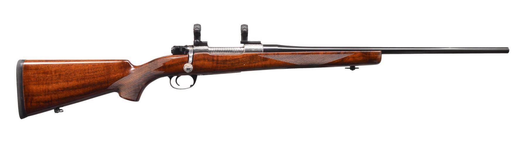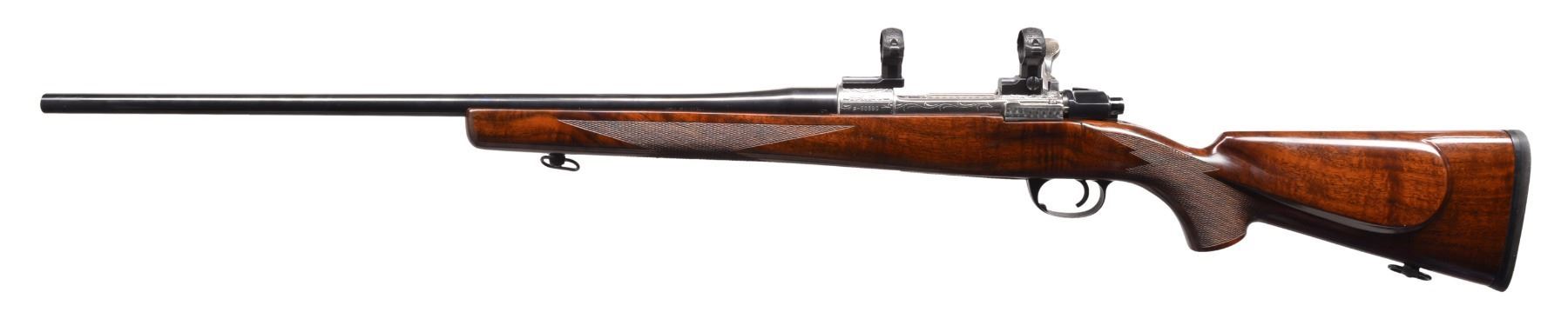 Cal. 30-06. S# P-60590. Bbl. 24" light sporter weight w/out sights. Left side of bbl. shank has "PM" in oval proof marking. Bright finished receiver w/ deep scroll engraving. Fitted w/ 2 Piece scope bases & engraved rings. Bolt body, extractor, feed rails & bolt release spring are jeweled. Bolt handle has 3 panel hand checkering. Model 70 style safety. Timney single stage trigger. QD floorplate w/ release in trigger guard bow. Distinctive floorplate of Damascus steel has bright polish. Classic style cheekpiece sporter stock of fancy walnut w/ borderless point pattern hand checkering. Push button quick release swivels. LOP: 13 1/2" over Pachmayr Presentation rifle pad. CONDITION: 98% metal finish. Stock shows a few sm. marks. Bore is bright w/ crisp rifling. (20-142/DS). MODERN. $900-1,500.