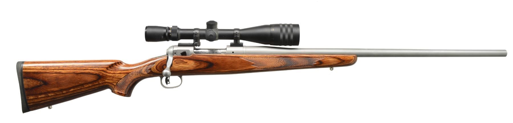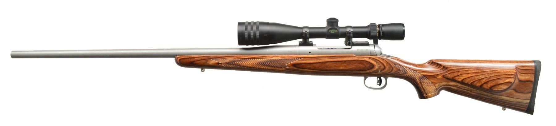 Cal. 223 Rem. S# ERS001337. Bbl. 26". Receiver marked on left side "E.R. Shaw Mk-VII". Bbl. marked on left side "223 REM". Mfg. by Shaw Precision Guns. Heavy Varmint weight bbl. w/ 11 degree crown. Receiver fitted w/ Leupold scope bases & Weaver 4-16x42 AO scope w/ fine crosshair. Metal is finished in dull matte gray. Has Accutrigger. Checkered laminated brown stock w/ cheekpiece & solid recoil pad. Blind mag. QD swivel studs. CONDITION: stock has scattered tiny handle marks. Metal has 95% finish w/ very light high point wear & near excellent shiny bore. Near excellent shiny bore. (20-512/RW). MODERN. $500-800.