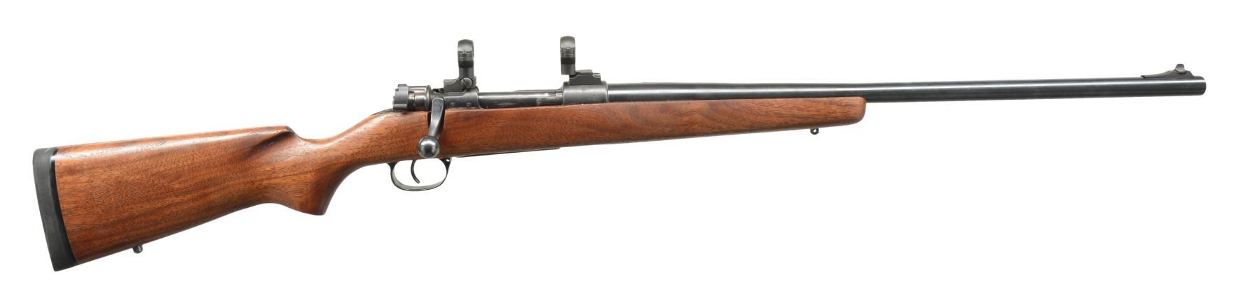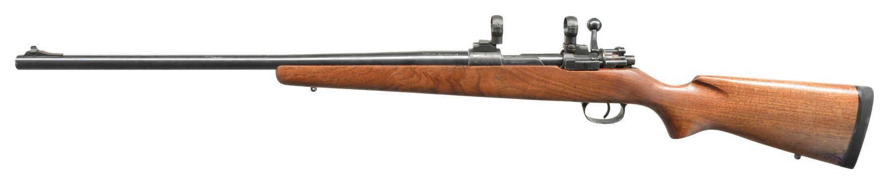 Cal. 6mm Rem. S# 6273. Bbl. 24 1/8". Receiver marked "GEW 98" on left rail. All visible numbers match. Receiver ring marked "V.C.R. SHILLING". Drilled & tapped for receiver sight. Fitted w/ High Leupold 1" rings w/ front extension & Leupold bases. Bolt handle has been altered for scope clearance. Has Timney Bueller style low scope safety. Quality Varmint weight bbl. fitted by noted gunsmith J White of Gilford, ME. Ramp front sight w/ white bead. Oil finished Brownell walnut sporter stock fitted w/ Pachmayr Decelerator pad & sling studs. Action & rear of bbl. have been glass bedded. UNATTACHED ACCESSORIES: includes near new in box Lee Pacesetter Dies w/ shell holder & tapered crimp die. Box of 100 Hornady Interlock 100 gr. BTSP bullets. Box of 100 new 6mm Rem. brass. CONDITION: stock has several tiny handling marks. Rifle has 90% custom reblued finish w/ slight loss of blue on bolt due to cycling. Near excellent shiny bore, consignor states test fired only. (20-1257/RW). MODERN. $500-700.