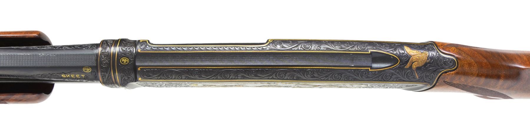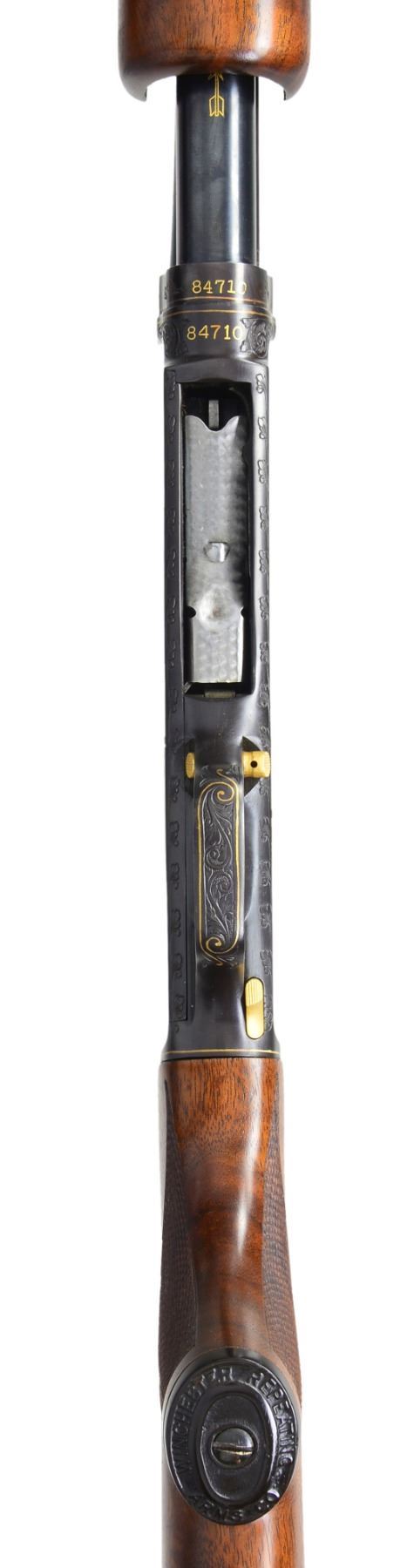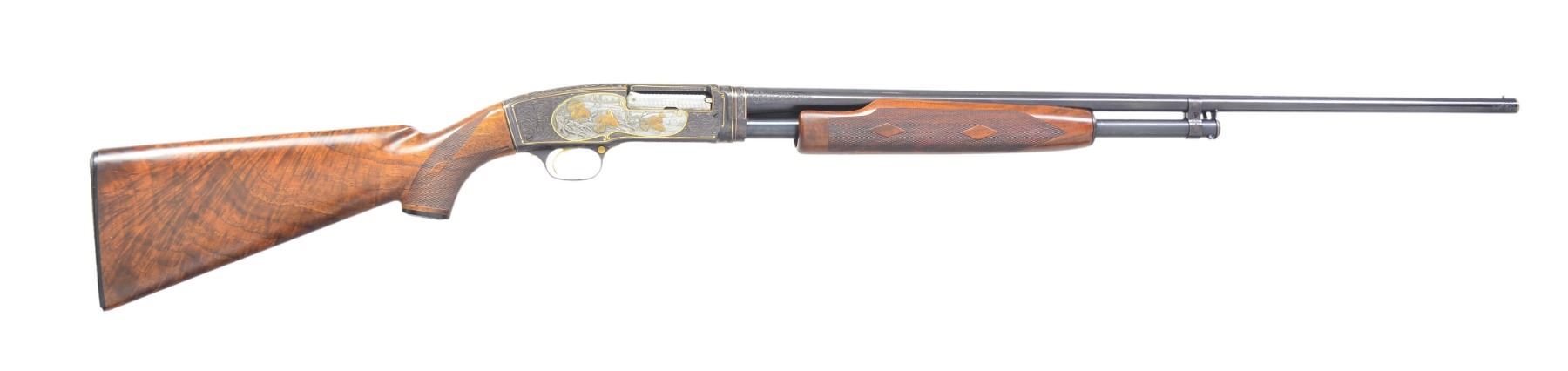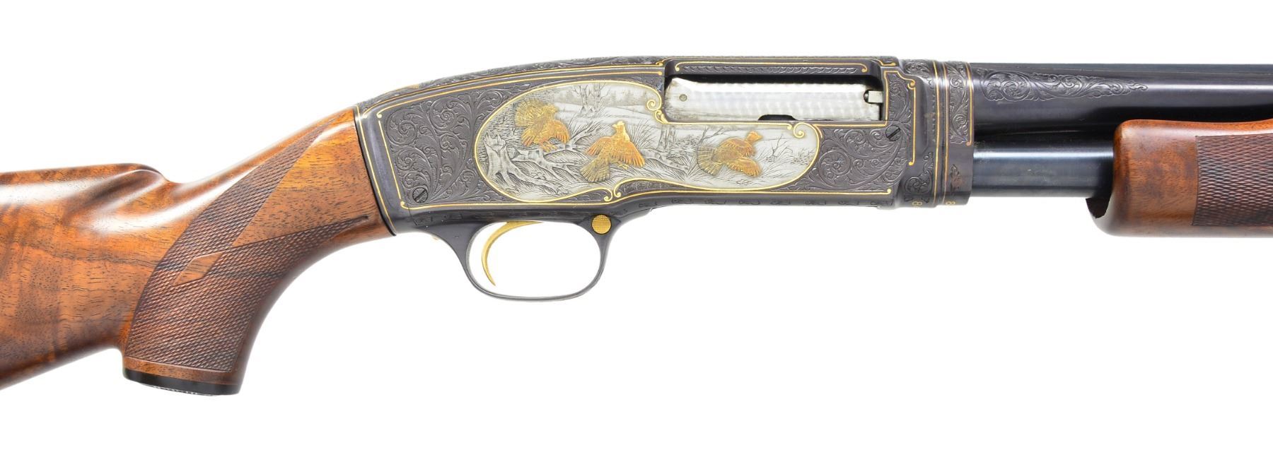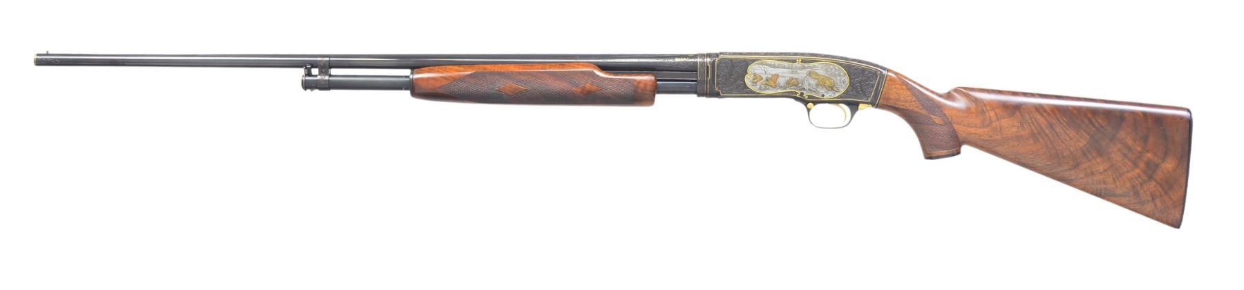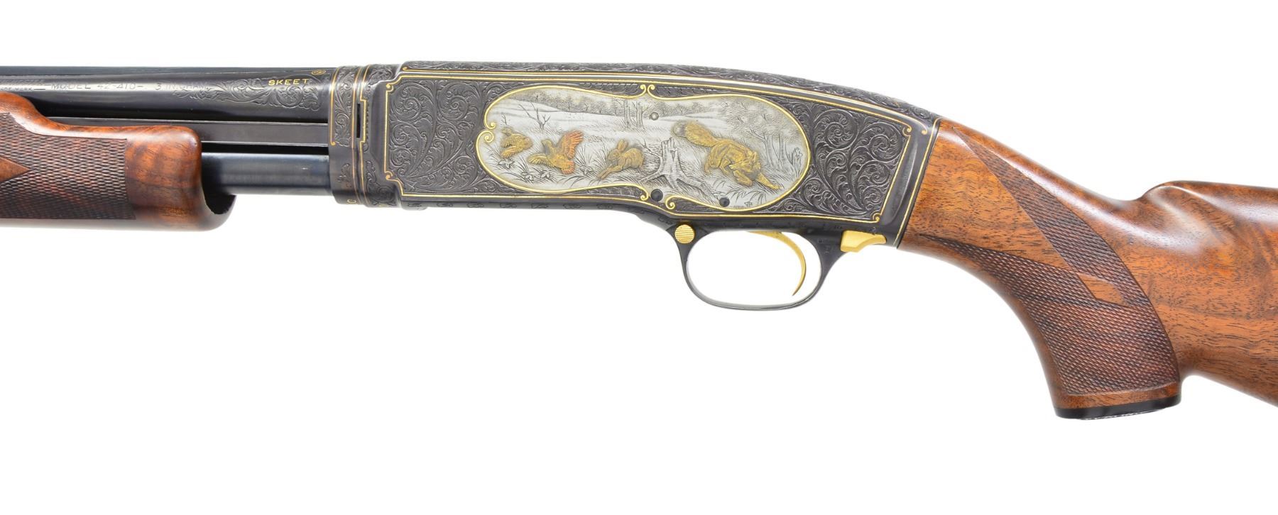 ENGRAVED PUMP SHOTGUN. Cal. 410, 3". S# 84710. Bbl. 28" solid rib. w/ steel bead. Fixed Skeet choke. Outstanding upgraded gun w/ engraving by Belgium trained Master Engraver Angelo Bee. Game scenes feature bicolored gold inlays of 3 flushing grouse on right side w/ fox, rabbit & 2 flushing quail on left side. Satin finished scenes are bordered by gold wire which extends to all edges of receiver & bbl. extension. Balance of action is blued w/ full coverage vine type foliate scroll & punch dot backgrounds that extends to receiver top, bottom, trigger guard bow, receiver extension as well as breech & muzzle end of bbl. Top of receiver has inlaid woodcock. Proof marks, choke marking & S#'s are gold inlaid. "A.BEE" signature & bee trademark at lower left corner of left side game scene. Checkered trigger, safety button & slide lock are gold plated. Carrier & bolt have fine hand jeweling. Beavertail forearm & hard rubber capped Skeet style stock of satin finished fancy walnut. Borderless dbl. diamond deluxe style hand checkering. LOP: 14 1/2" over Win. marked buttplate. CONDITION: over 98% fine custom blue showing sm. marks on rib & receiver top. Wood has very good finish. Action is not opening properly when slide lock is depressed. Very good bright bore. (19-4332/DS). CURIO. $5,000-8,000.
