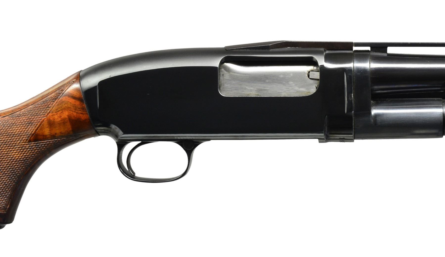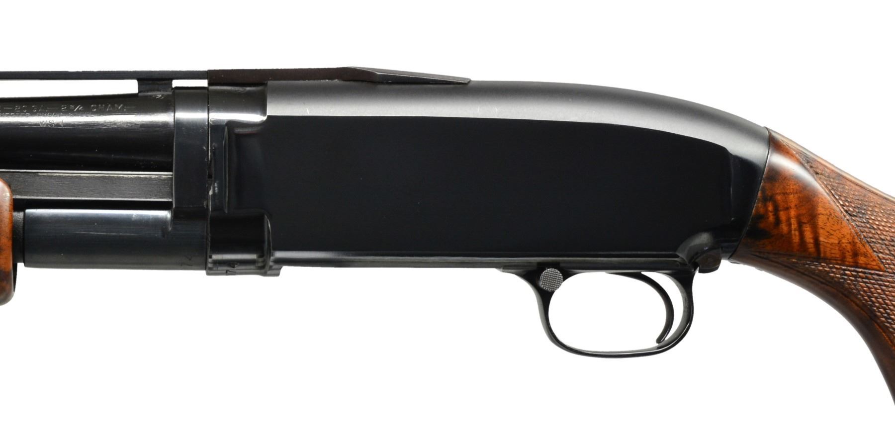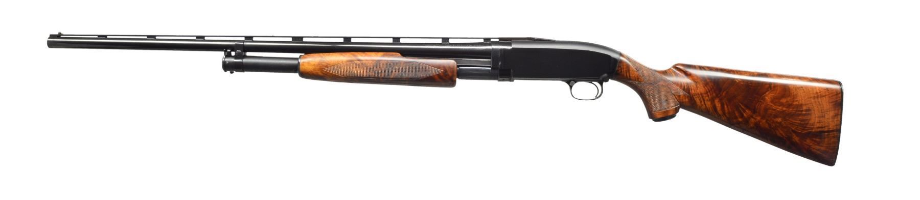 SHOTGUN. Cal. 20 Ga., 2 3/4". S# 1935074. Bbl. 26" w/ new style 3 pin VR having duck bill extension. Fixed WS-1 choke. White target front sight w/ white mid bead. Beavertail forearm & steel capped pistol grip stock of very fancy black walnut have Pigeon grade checkering w/ 3 diamonds on bottom of forearm. LOP: 14" over original buttplate. UNATTACHED ACCESSORIES: hand written letter from George Madis author of "The Winchester Book" giving his assessment of the gun & the condition it was in at the time. CONDITION: metal retains over 90% original blue. Stock & forearm are sanded & have semi gloss refinish. Very good bright bore. (19-4335/DS). CURIO. $2,000-4,000.