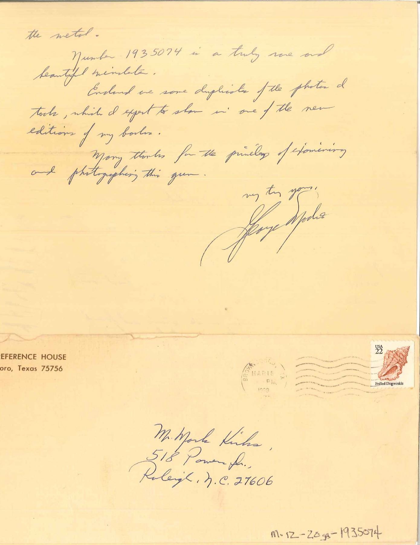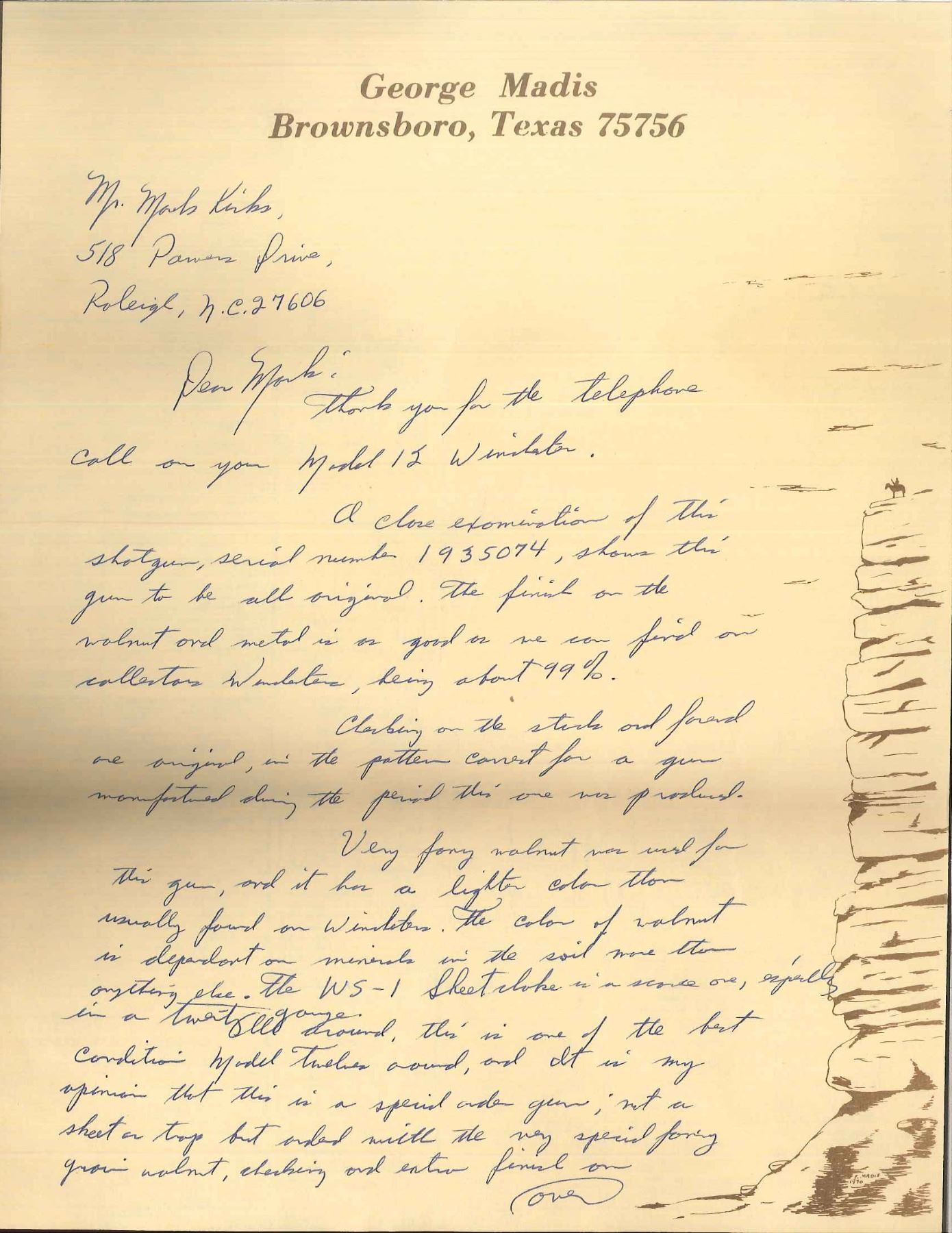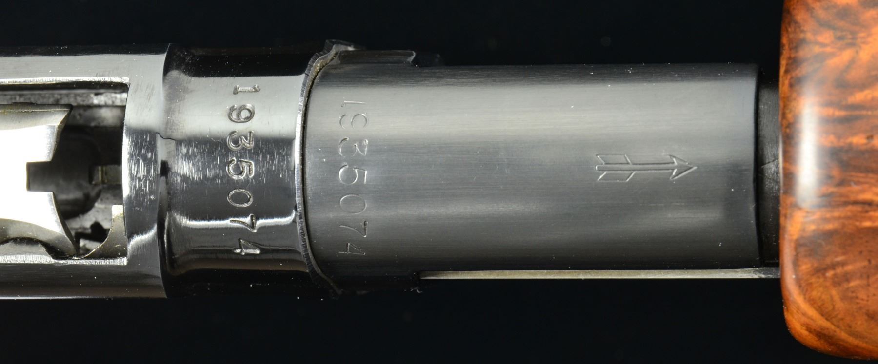 SHOTGUN. Cal. 20 Ga., 2 3/4". S# 1935074. Bbl. 26" w/ new style 3 pin VR having duck bill extension. Fixed WS-1 choke. White target front sight w/ white mid bead. Beavertail forearm & steel capped pistol grip stock of very fancy black walnut have Pigeon grade checkering w/ 3 diamonds on bottom of forearm. LOP: 14" over original buttplate. UNATTACHED ACCESSORIES: hand written letter from George Madis author of "The Winchester Book" giving his assessment of the gun & the condition it was in at the time. CONDITION: metal retains over 90% original blue. Stock & forearm are sanded & have semi gloss refinish. Very good bright bore. (19-4335/DS). CURIO. $2,000-4,000.