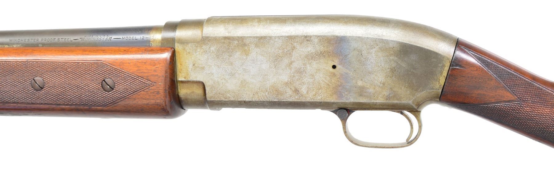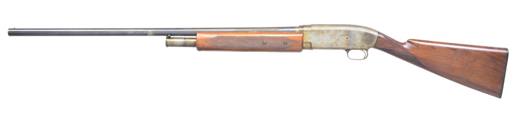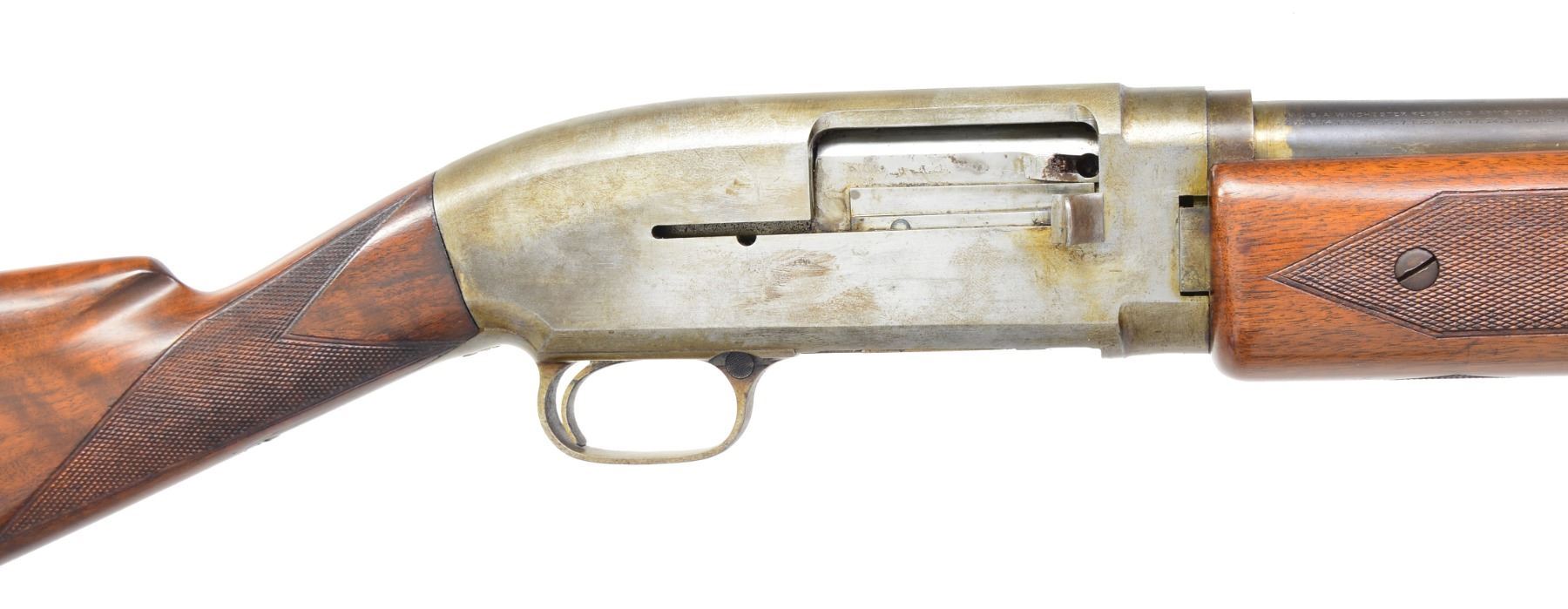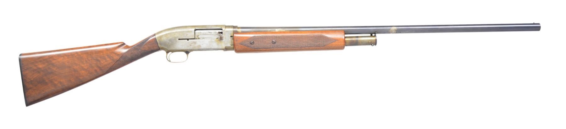AUTO SHOTGUN. Cal. 12 Ga., 2 3/4". S# 4. Unusual experimental auto using a receiver w/ Model 12 contours. Action is unfinished & in the white. Bbl. is 29 1/2" plain of "Winchester Proof Steel" w/ standard Model 12 markings. Fixed Full choke & steel front bead. Mag. tube extends 3 1/8" past the 10 1/4" forearm & uses Model 12 style mag. cap & pin. Heavy walnut forearm is hand checkered & attached by 2 screws on each side. Carrier, trigger guard & breech bolt assemblies exhibit features of the Model 40 & the later Model 50. Straight grip checkered walnut stock. LOP: 13 3/4" over Win. buttplate. Consignor supplied information states that he purchased the gun from Norm Flayderman who purchased it from the Winchester Museum collection in the 1970's & further relates it was built by Gustav Swabilius, a Winchester employee. This gun became the prototype for what was to become the Model 50. UNATTACHED ACCESSORIES: rectangular aluminum identification plate marked "W. 804". CONDITION: bbl. has 80% dull fading blue showing bright polish spots & areas of discoloration. White finished action shows some heat markings w/ a general light tarnish & corrosion. Exposed part of mag. tube shows rings of heat coloration & tarnish. Stocks have lightly worn finish showing scattered handling marks. Good bright bore. (19-4212/DS). MODERN. $1,000-2,000.