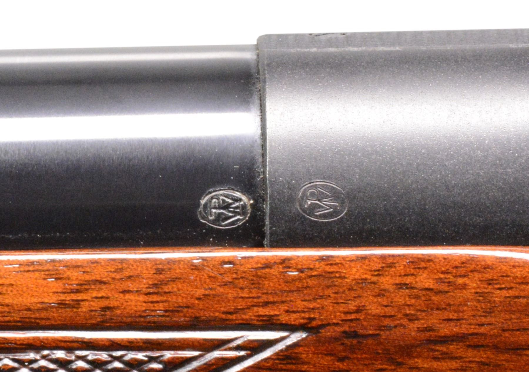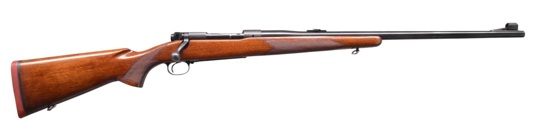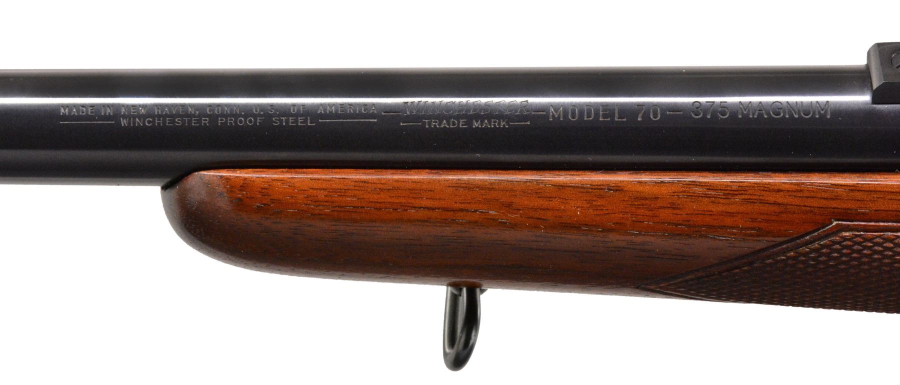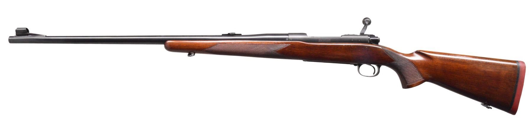 Cal. 375 H&H Mag. S# 154487. Bbl. 25". Hooded ramp bead front sight w/ Lyman No. 6W on special 2 screw base. Bolt bodied is S# to rifle. Straight comb walnut stock w/ hand checkering & sling swivels. LOP: 13 1/2" over solid red pad. Mfg.1950. CONDITION: over 95% blue showing scope base wear lines on action. Refinished stock shows scattered marks. Bright near excellent bore. (20-5/DS). CURIO. $2,750-3,500.