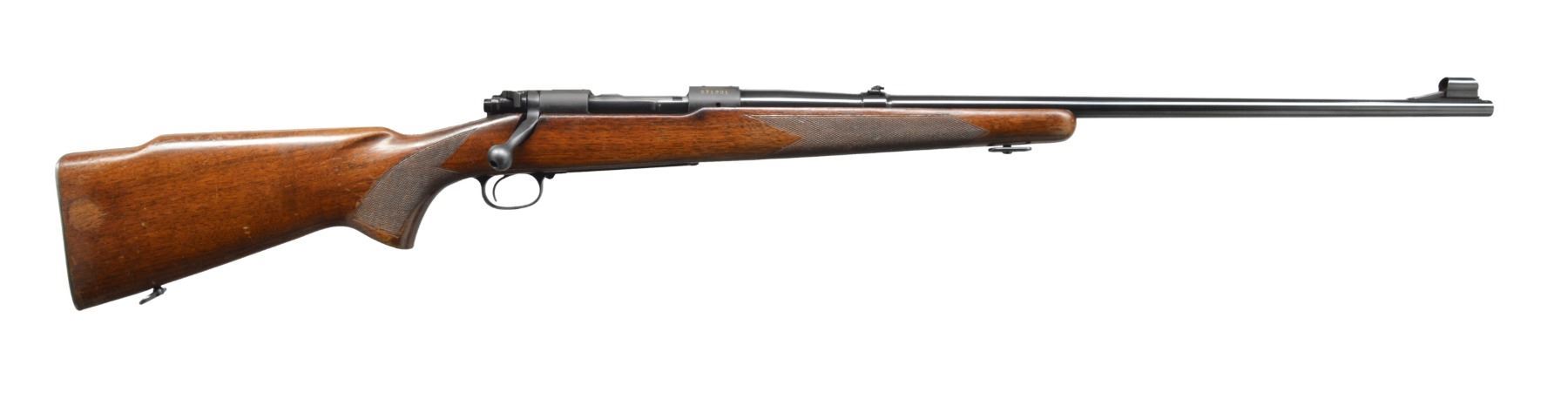 Cal. 338 Win Mag. S# 571201. Bbl. 25". Hooded ramp bead front sight & folding leaf rear sight. Bolt body is numbered to rifle. Monte Carlo walnut stock w/ wide pattern hand checkering, sling swivel & checkered steel buttplate. Mfg. 1963. CONDITION: 97% original blue. Receiver & bbl. markings have added Bonanza gold highlighting. Stock has worn finish showing finish wear & chips w/ numerous scratches, handling marks & dents. Leading edge of pistol grip has sm. chips. Bore is bright w/ strong rifling. (19-4632/DS). CURIO. $1,800-2,500.
