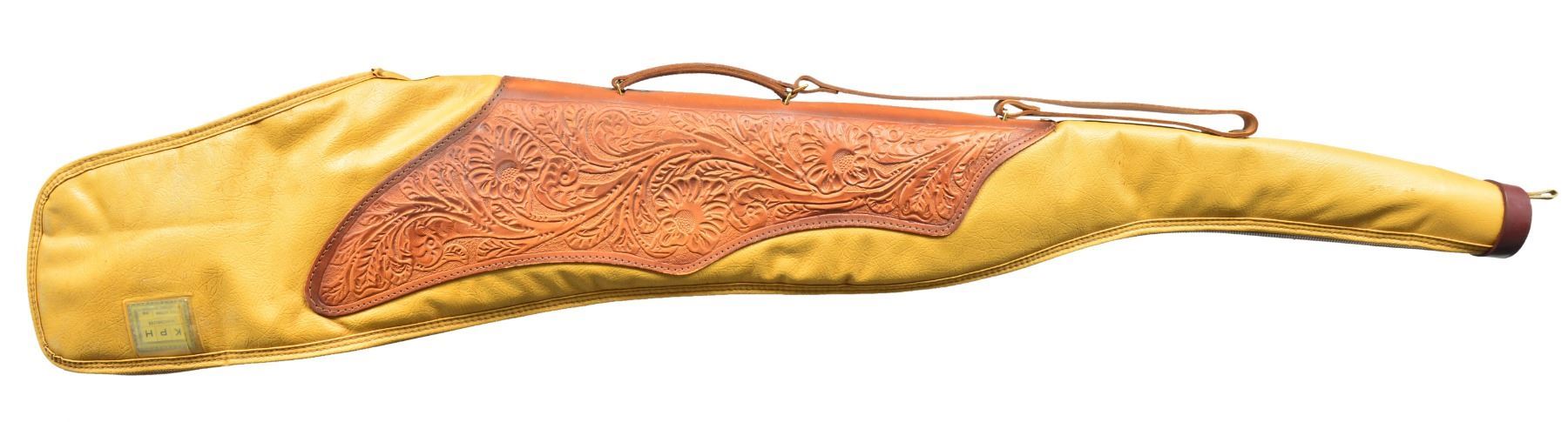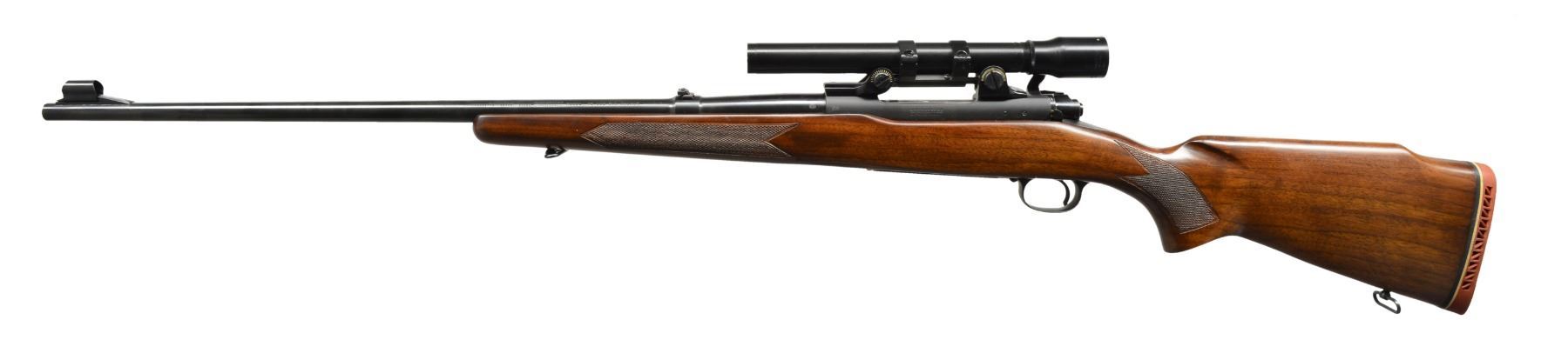 RIFLE. Cal. 338 Win. Mag. S# 520460. Bbl. 25" w/ hooded ramp front sight & folding leaf rear. Mfg. 1961 w/ checkered Monte Carlo stock having factory installed red, White Line recoil pad & swivels. Matching numbered bolt. Top quality, period correct Bausch & Lomb Balfor 2.5 power crosshair reticle scope in B&L 2 piece base set utilizing optional quick change plunger ring set. UNATTACHED ACCESSORIES: original scope box & packaging plus good zippered rifle case of tan vinyl & flower patterned tooled leather. CONDITION: collector quality w/ all aspects of rifle near excellent including bore. Nitpicking yields sm. marks on forend from swivel loop, sm. mark on floorplate resulting from full open stoppage against front piece & very faint mark about 2" behind checkering on right side of buttstock. Scope set has 2 very sm. marks on top of rear ring & all other scope aspects near excellent as well. (20-386/NW). CURIO. $1,500-2,200.