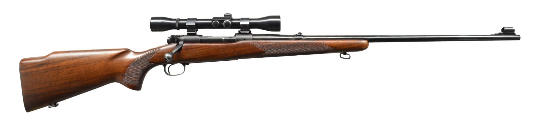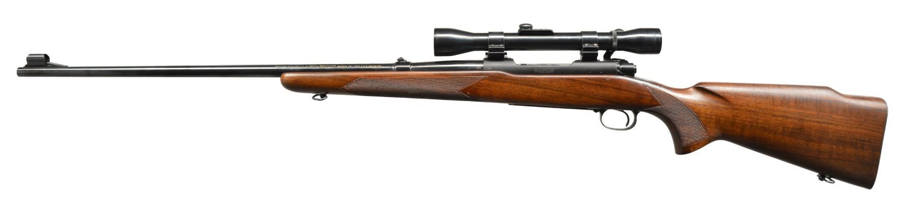Cal. 300 H&H Mag. S# 405511. Bbl. 26" w/ hooded ramp bead front sight & folding leaf rear sight. Weaver KV60 scope w/ post reticle on Weaver pivot mts. Bolt is numbered to rifle. Monte Carlo walnut stock w/ hand checkering, sling swivels & checkered steel buttplate. CONDITION: over 98% original blue. Original stock finish shows a few scattered scratches & marks. Very good bright bore. Scope has clear optics. (20-823/DS). MODERN. $1,000-1,400.