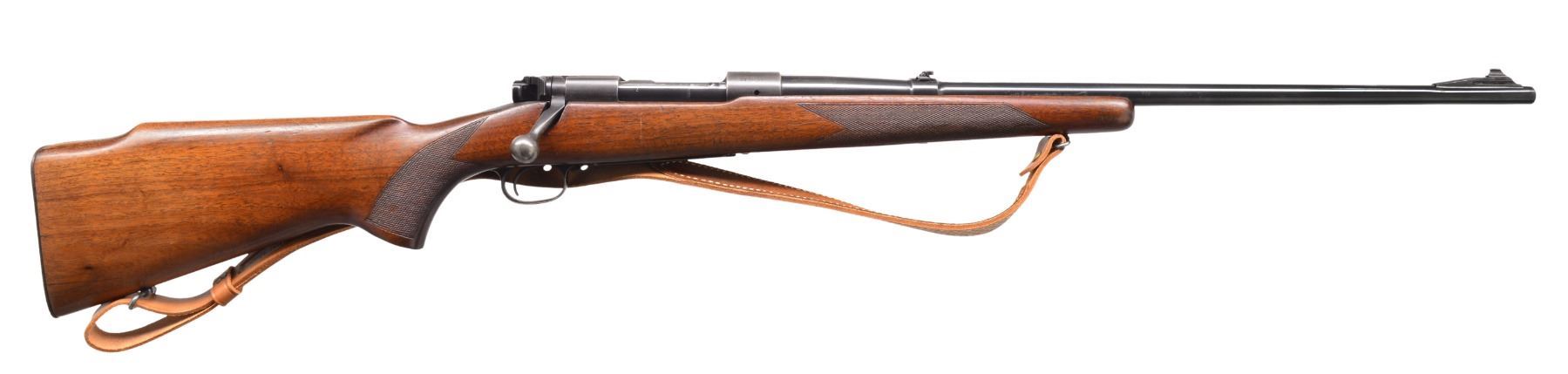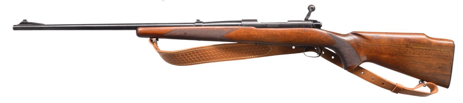 Cal. 30-06. S# 213832. Bbl. 24" w/ ramp mounted bead front sight & folding leaf rear sight. Bolt has partially visible number matching action. Monte Carlo walnut stock w/ hand checkering, steel buttplate & original swivels holding a leather beavertail sling. CONDITION: bbl. & receiver retain over 80% lightly faded blue. Bottom metal retains 30% faded blue. Refinished stock shows scattered scratches & handling marks. Toe of stock has an open 2" crack. Buttplate has proud fit. Bore retains sound rifling. (20-137/DS). CURIO. $700-1,000.