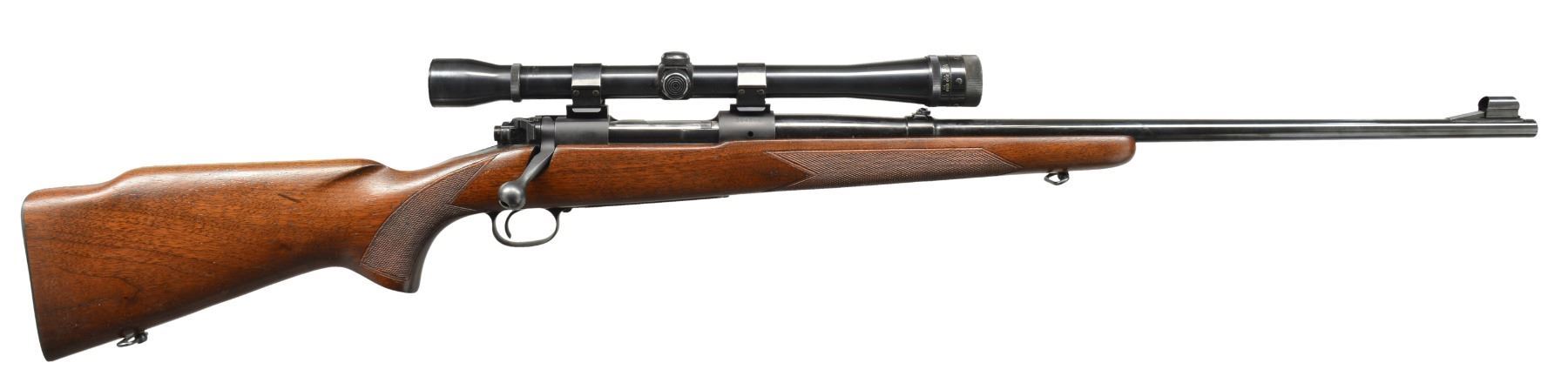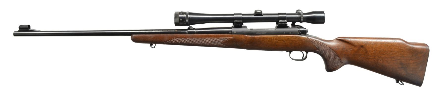 RIFLE. Cal. 243 Win. S# 394300. Bbl. 24" w/ hooded ramp bead front sight & folding leaf rear sight. Weaver K10 60-B gloss finished scope w/ AO & standard crosshairs on Weaver pivot mts. Bolt is numbered to action. Walnut Monte Carlo sporting stock w/ hand checkering, sling swivels & checkered steel buttplate. CONDITION: 98% original blue. Original stock finish shows a few sm. marks & wear spots. Bore is bright w/ strong rifling. Scope has clear optics. (20-821/DS). CURIO. $700-1,000.