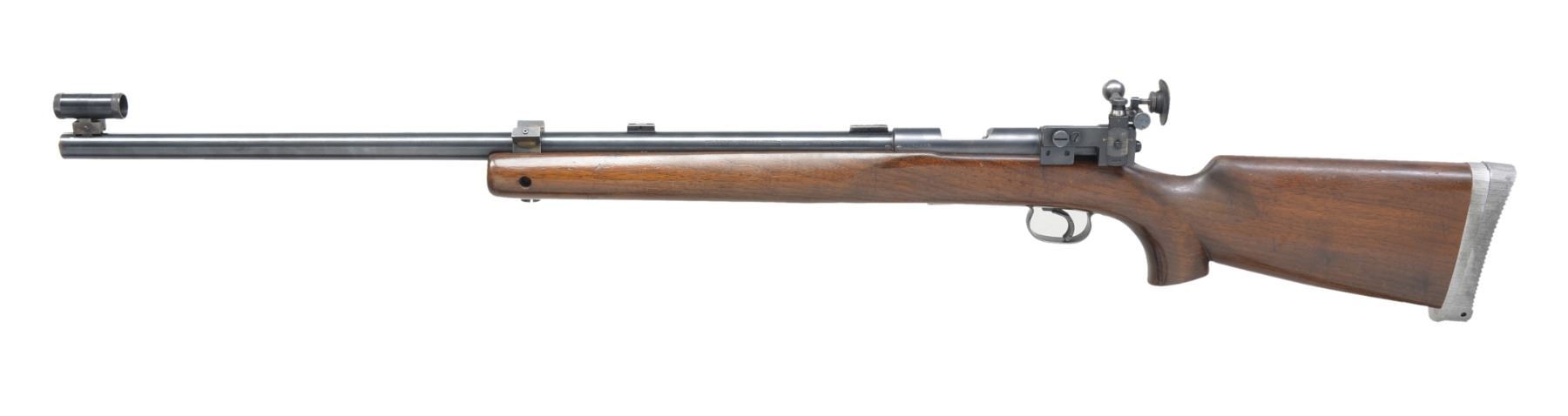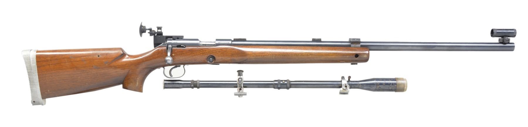 Cal. 22 LR. S# 69469B. Bbl. 26" heavy weight. Lyman Model 525 target receiver sight w/ Vaver globe front sight. J. W. Fecker 10x target scope S# 12840 w/ standard crosshair on bbl. target blocks. Trigger is fitted w/ wide shoe. Flat on right side of ejection port stamped "EM". Walnut target stock has adj. aluminum buttplate, aluminum accessory rail & forearm. Toeline of stock has cut square for 5" forward of the buttplate, w/ 2 open screw holes & is stamped "AHB". Bbl. is fitted w/ an adj. band for hand rest attachment that extends through bottom of forend. MAGS: 1 single shot adapter. CONDITION: 70% lightly worn blue. Stock has worn finish w/ numerous scratches & handling marks, reshaping around comb & wrist. Bore is bright w/ strong rifling. Scope has clear optics w/ exterior showing scattered areas of red rust. Front aluminum cap is missing. (19-5603/DS). CURIO. $500-700.