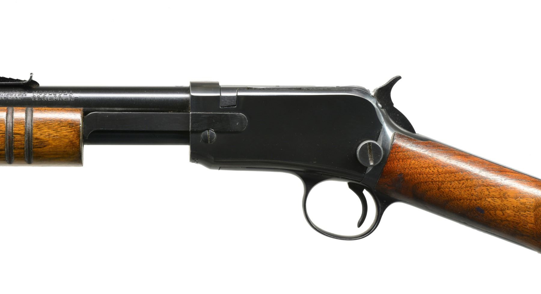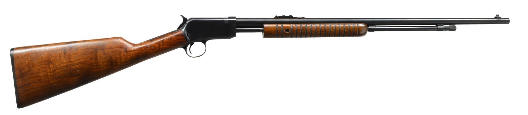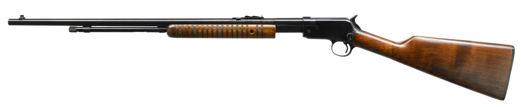 Cal. 22 S, L, LR. S# 316754. Bbl. 23" rnd. w/ standard sporting sights. Tubular mag. Flat bottom grooved forearm & straight grip stock of nicely grained walnut w/ original plastic buttplate. Mfg. 1954. CONDITION: retains over 97% original blue showing light pump handle wear. Wood has very good original finish showing a few sm. handling marks. Bright near excellent bore. (20-443/DS). CURIO. $600-900.