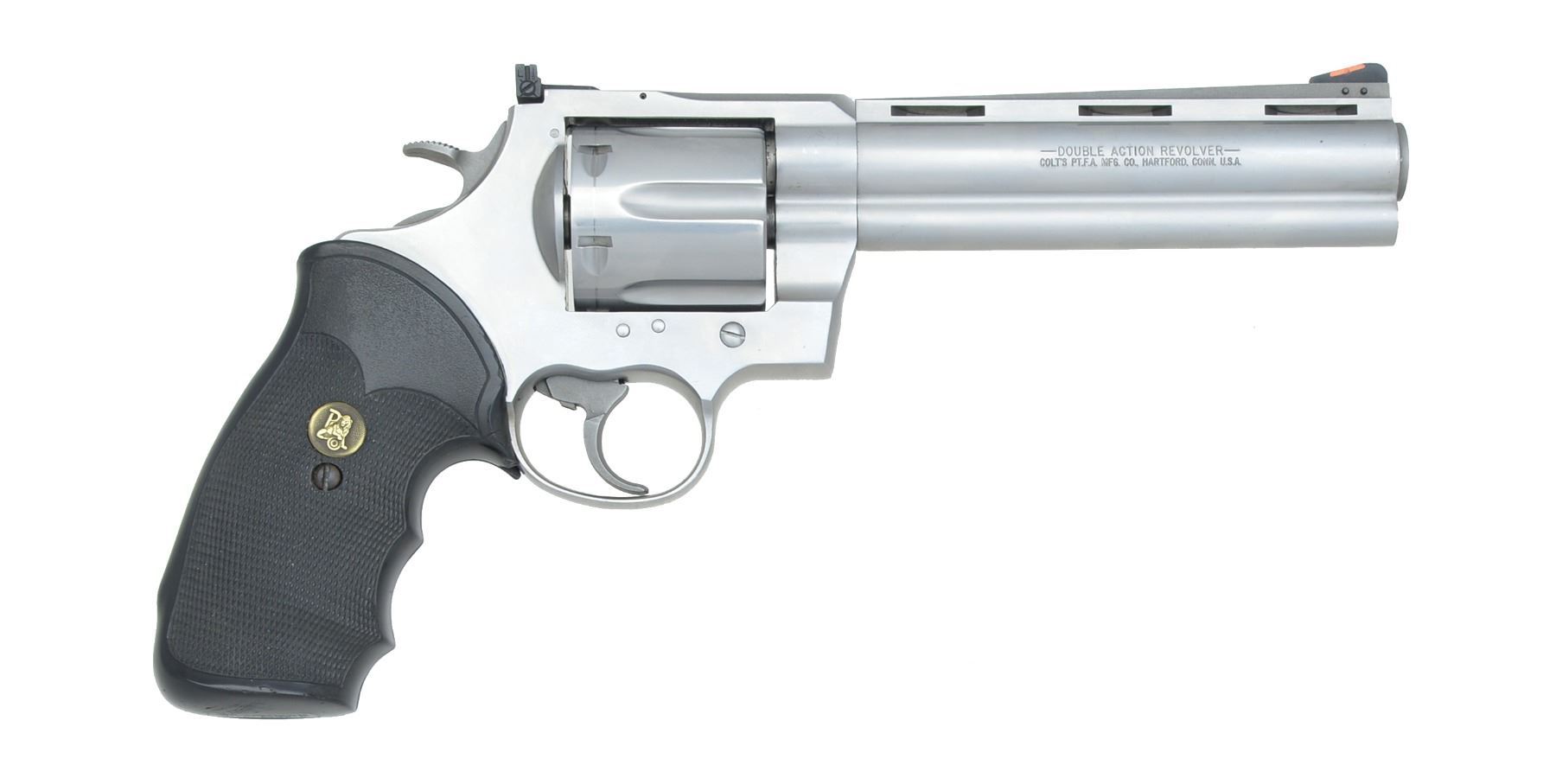 Cal. 44 Mag. S# MM15237. Bbl. 6" VR w/ full lug. Red ramp pinned blade front sight w/ white outline square notch adj. rear sight. 6 Shot fluted cyl. Stainless steel construction. Pachmayr Combat rubber grips. Mfg. 1992. CONDITION: polished stainless finish shows a faint cyl. drag line & a few scuffs. Very good grips. Bright near excellent bore. (20-151/DS). MODERN. $1,250-1,750.