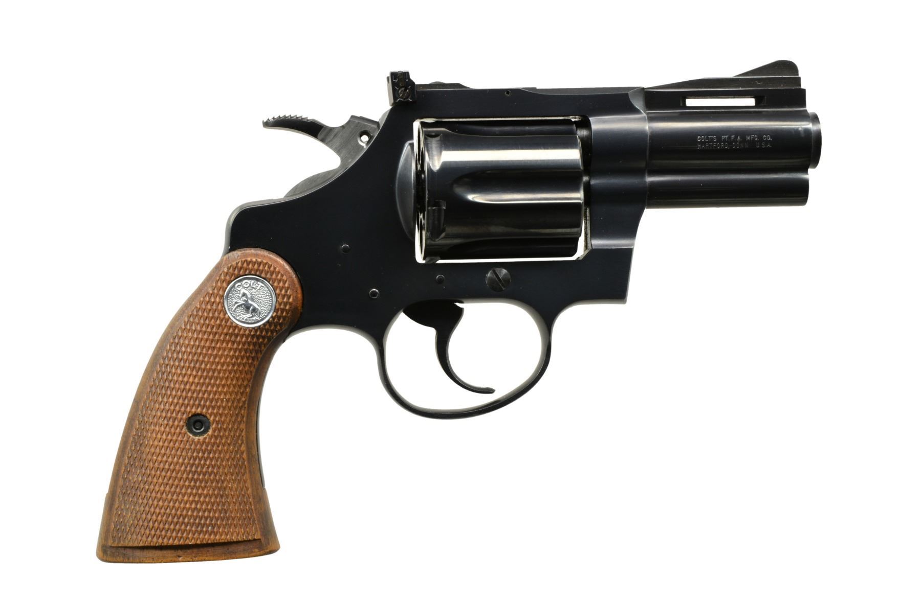 Cal. 38 Spl. S# D1958. Bbl. rare 2 1/2" VR w/ serrated ramp front blade & Accro frame mounted rear. Mfg. 1966 w/ blued finish & checkered walnut service grips having silver Colt medallions. Very desirable model in uncommon bbl. length having Python appearance. CONDITION: all aspects near excellent w/ unfired appearance. (20-550/NW). MODERN. $1,000-1,500.