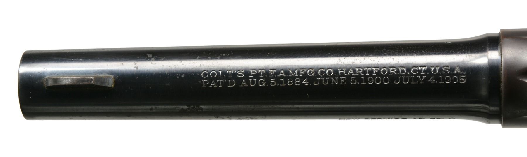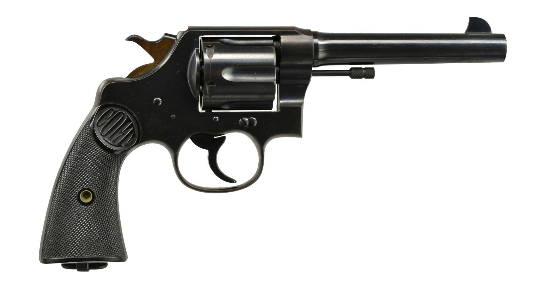 Cal. 45 Colt. S# 326477. Bbl. 5 1/2" w/ blade front sight & frame notched rear. Mfg. 1927 w/ blued finish, matching numbered Colt logo checkered hard rubber grips & lanyard swivel in butt. Checkered squared cyl. latch, smooth faced trigger & checkered hammer. Left front by trigger guard w/ VP proof plus 3 at rear. CONDITION: good plus overall appearance w/ areas of cleaned peppery oxidation being most vivid on front half of bbl.; especially bottom. All areas of frame have scattered spots of pinprick or peppery oxidation w/ grip straps & bottom of cyl. frame having slight patina appearance. Near excellent grips, bore & chambers. (20-556/NW). CURIO. $900-1,400.