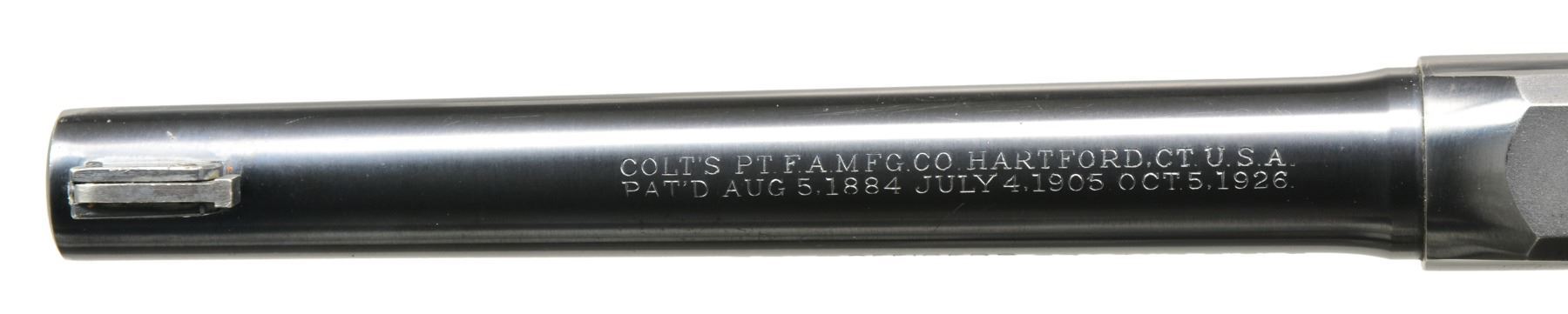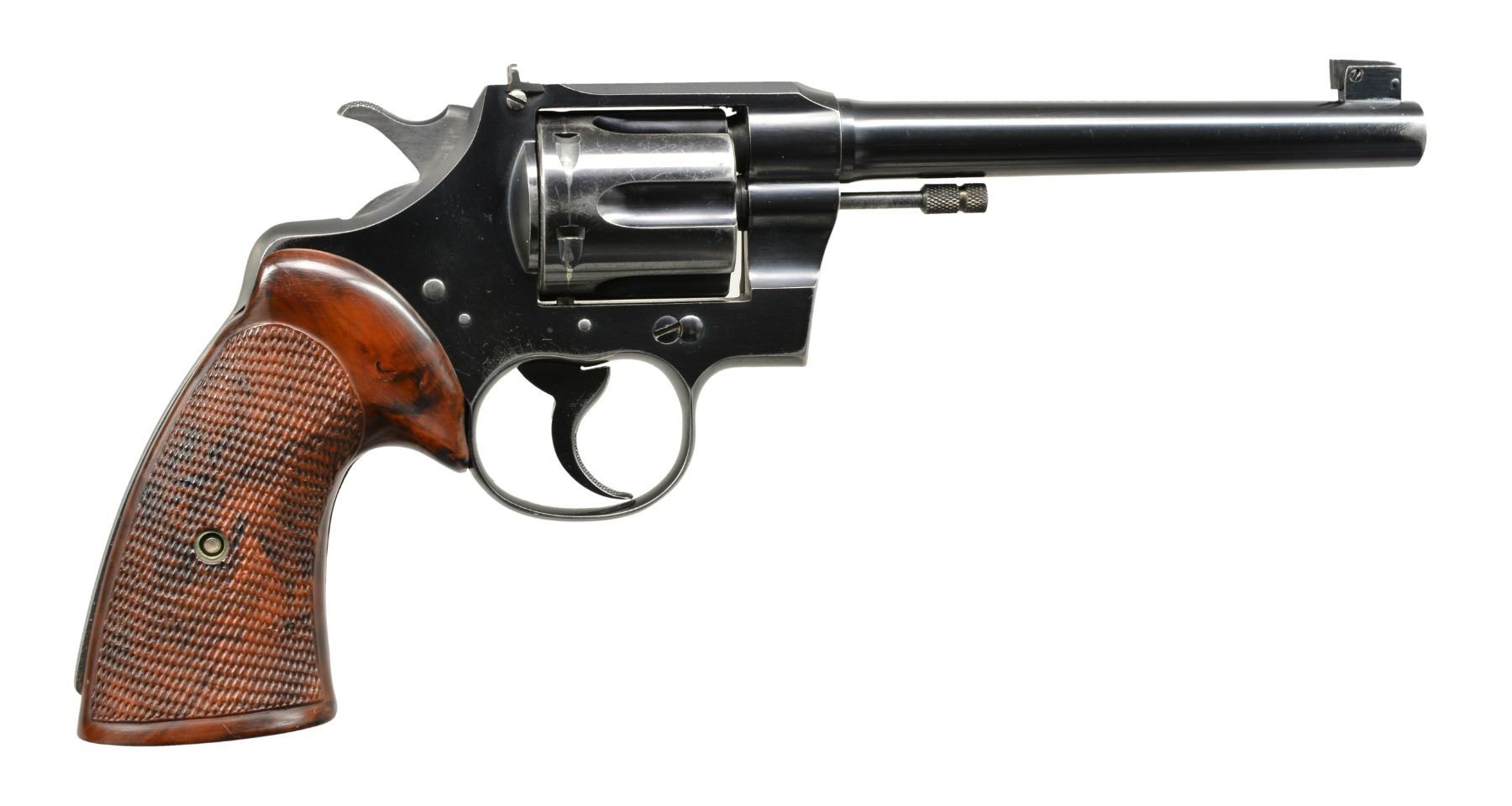 Cal. 22 LR. S# 9484. Bbl. 6"tapered w/ elevation adj. Patridge front sight plus windage adj. frame mounted rear. Mfg. 1935 (1930-1949) w/ blued finish plus checkering on cyl. release, hammer, trigger, ejector rod head & backstrap. 6 Rd. fluted cyl. w/ improvement at rear encasing cartridge heads. Checkered Franzite mottled brown plastic target grips w/ thumbrest for RH use. CONDITION: good overall appearance w/ high point holster like wear, some pinprick oxidation & occasional light marks. Turn line on cyl. especially noticeable in leades. Gripstrap wear including front from use w/ different grips. Thinning on bottom front of trigger guard. Very good appearing grips w/ separation at frontstrap going into taper at butt. Near excellent bore. (20-423/NW). CURIO. $500-700.