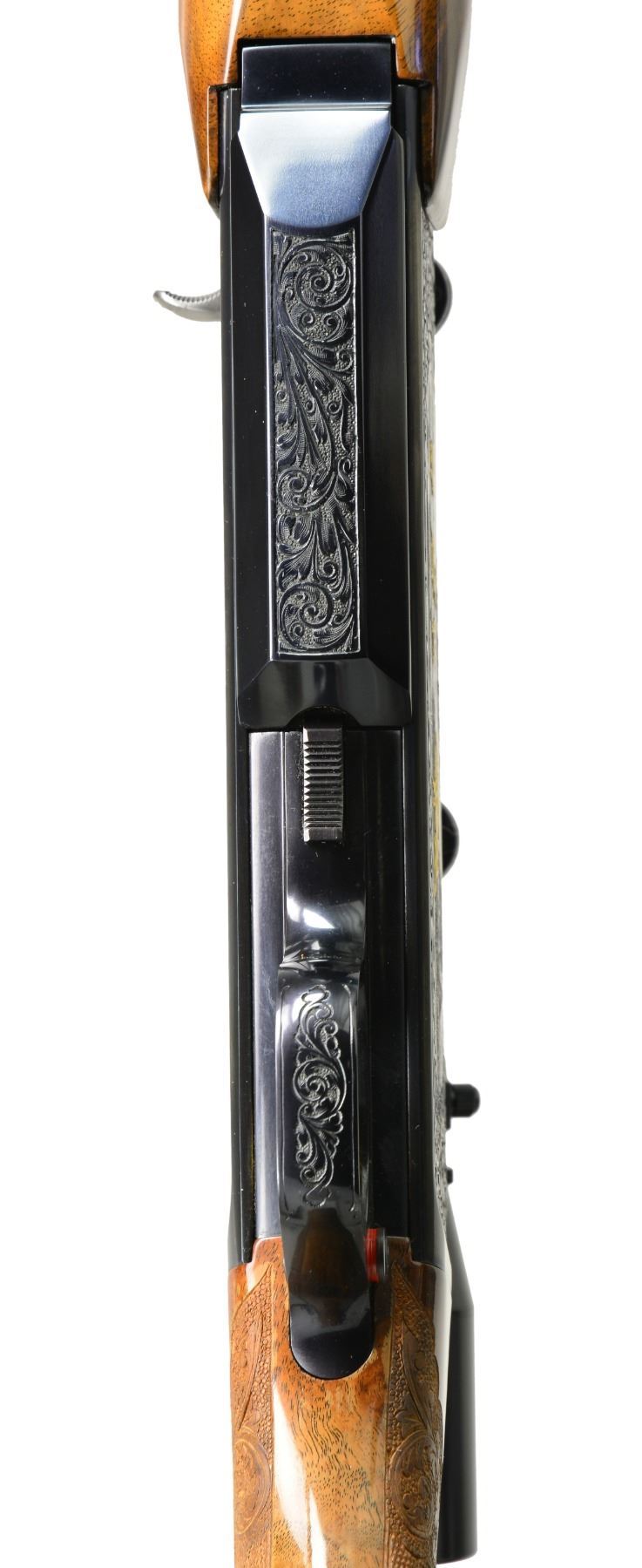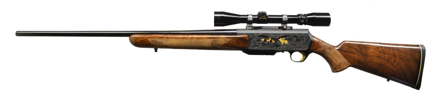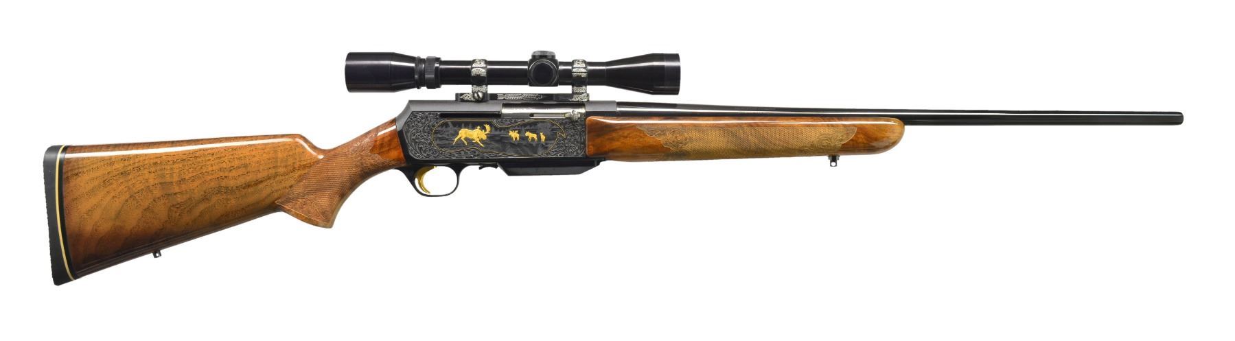 Cal. 338 Win. Mag. S# 73541M71. Bbl. 24" rnd. w/out sights. Blue finished action features gold bordered game scenes featuring 4 moose on right side & 4 elk on left side. Engraving is surrounded by full coverage foliate scroll that continues to trigger guard bow & bottom of mag. box. Engraver's signature "J. Baerten" found at bottom of left game scene. Gold finished trigger. Forearm & straight comb stock of gloss finished fancy walnut having burl & fiddle figure. Stock & forearm have fine hand checkering surrounded by foliate carving & punch dot backgrounds. Stock is fitted w/ sling eyes. LOP: 13 3/4" over original black Browning rifle pad. 3x-9x Browning scope held by custom engraved Browning 1 piece base & rings. 1971 Belgium mfg. MAGS: 1 enclosed 3 rnd. detachable. UNATTACHED ACCESSORIES: black Browning envelope containing operation & care booklet. CONDITION: metal retains over 99% original finish. Wood shows spots of blistered finish on right side of forearm & right side of stock near action. Near excellent bore. Scope has bright optics. (20-440/DS). MODERN. $3,750-5,000.
