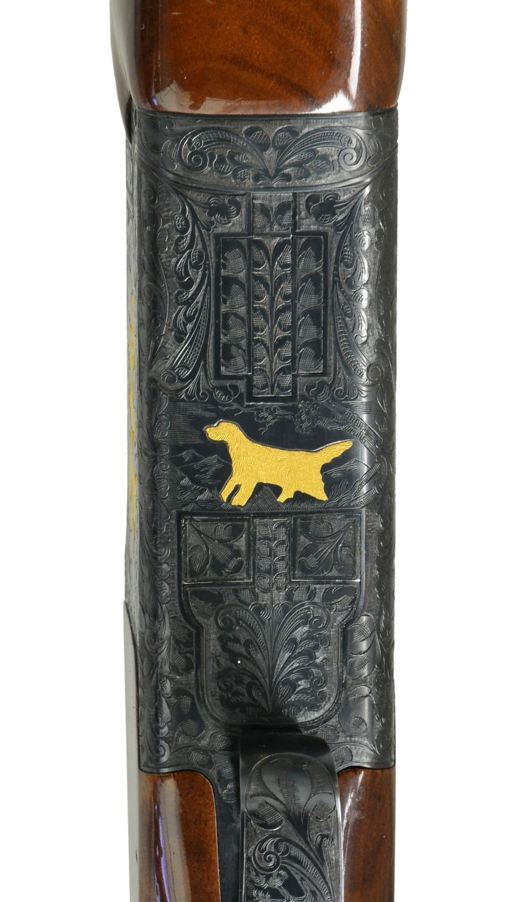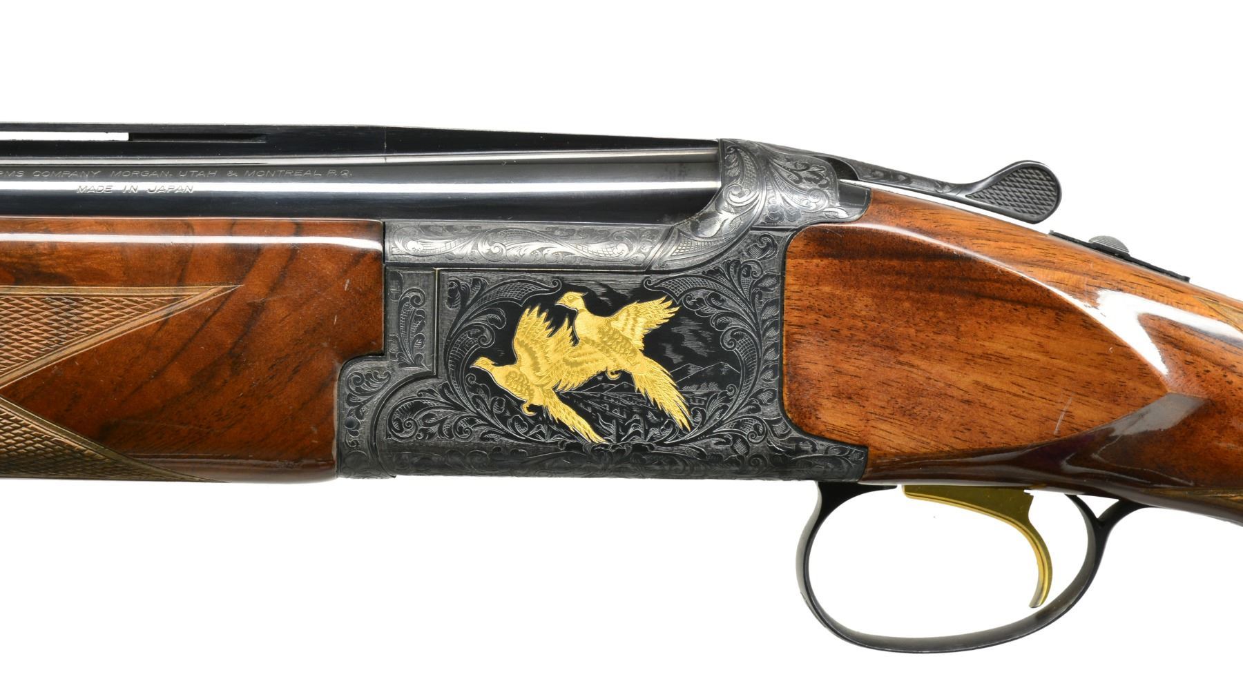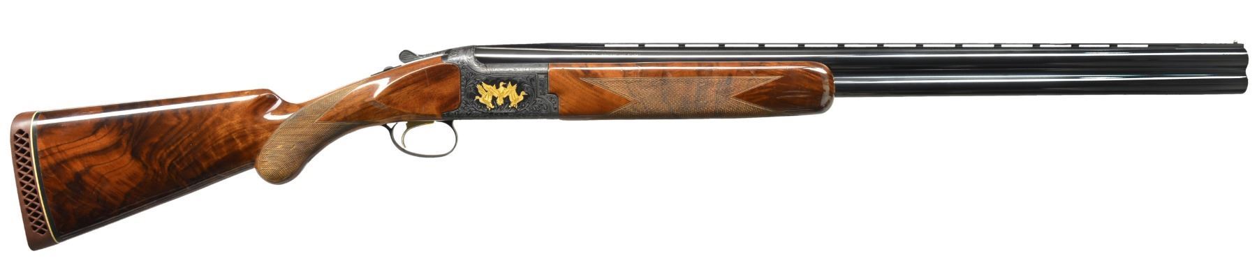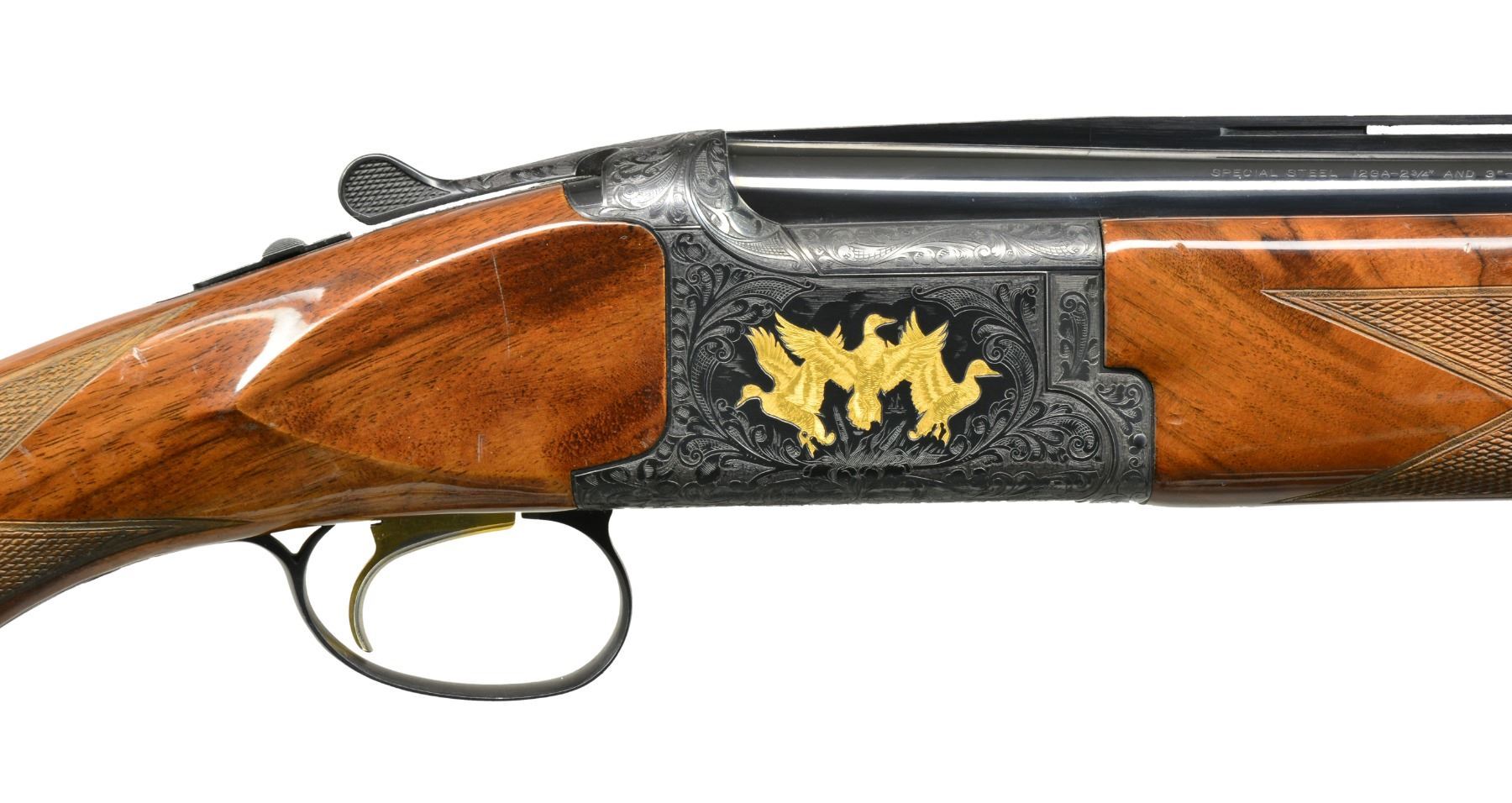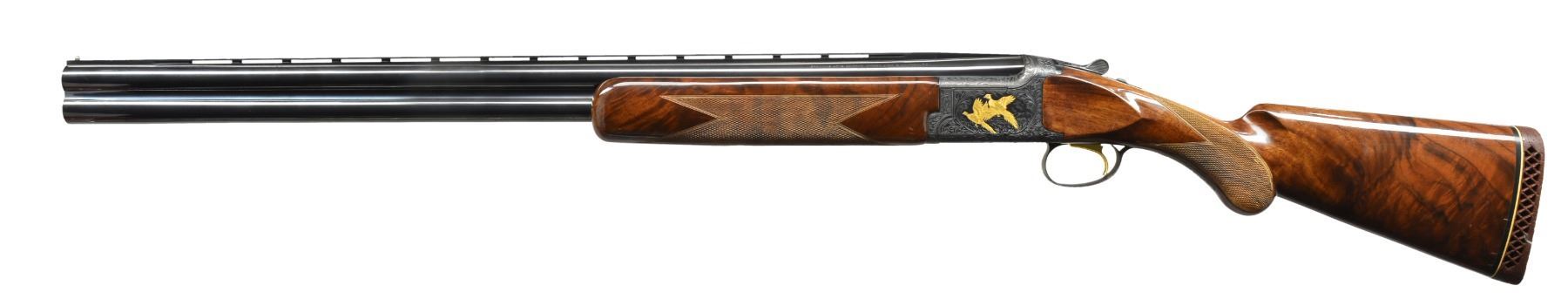 Cal. 12 Ga., 2 3/4" & 3". S# 16107NZ953. Bbls. 28" VR w/ Invector chokes: 2 Imp. Cyl., 2 Mod. Blued boxlock action w/ full coverage engraving that consists of vine type scroll surrounded game scenes & gold figures. Right sight of action features 3 flying mallards, 2 flying pheasants on right side w/ pointing setter on floorplate & flying quail on trigger guard. Gold plated SST. Selective ejectors. Lightning forearm & rnd. knob long tang stock of checkered gloss finished fancy walnut. LOP: 13 1/2" over Browning ventilated pad. UNATTACHED ACCESSORIES: 2 spare chokes. CONDITION: metal retains over 98% blue. Stock & forearm show numerous scratches & handling marks. Checkering shows a few chipped diamonds. Recoil pad is hard & cracking. Bores are generally bright showing sm. spots of plastic fouling. (20-1179/DS). MODERN. $2,000-2,750.
