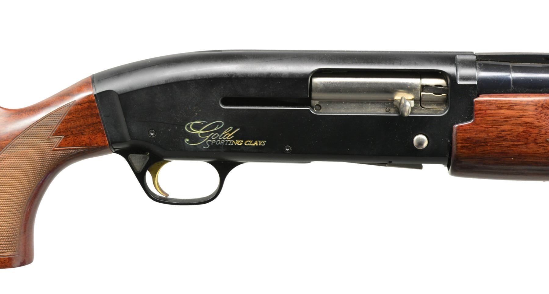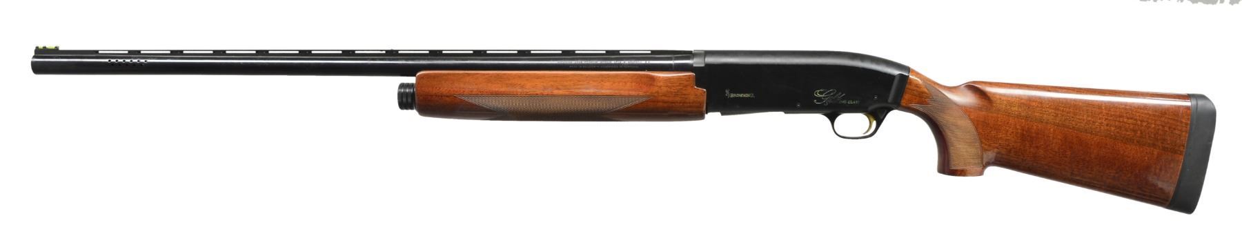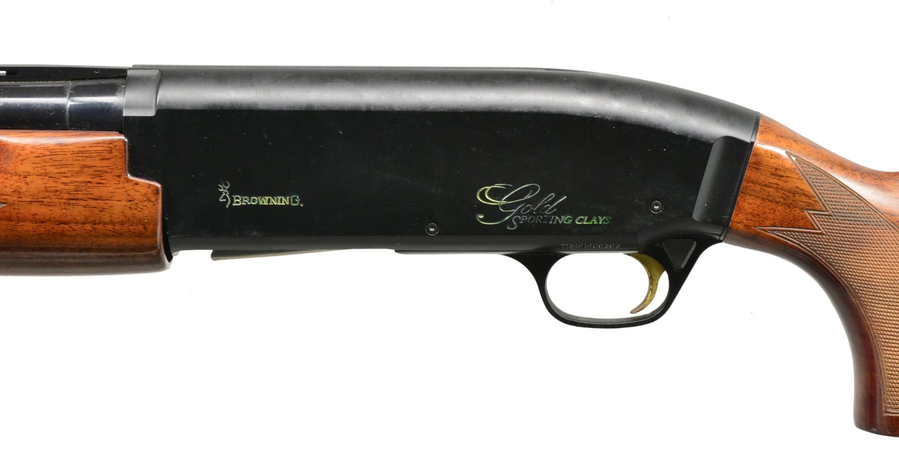 Cal.12 Ga. S# 113MM06262. Bbl. 28" ported VR bbl. fitted, fiber optic front sight & fitted w/ Browning interchangeable chokes; Plus Mod. tube included. Receiver marked "GOLD SPORTING CLAYS" on both sides w/ gold enhanced lettering. Bbl. markings include "BROWNING ARMS COMPANY MADE IN BELGIUM ASSEMBLED IN PORTUGAL". Gold colored trigger. Walnut stock set has cut checkering & solid recoil pad. CONDITION: stock set has light wear & scattered sm. handling marks. Bbl. has light wear, scattered spots of oxidation & very fine pitting throughout. Trigger has oxidation & fine pitting. Very good shiny bore w/ streaks of fouling near muzzle. (20-786/RW). MODERN. $600-900.