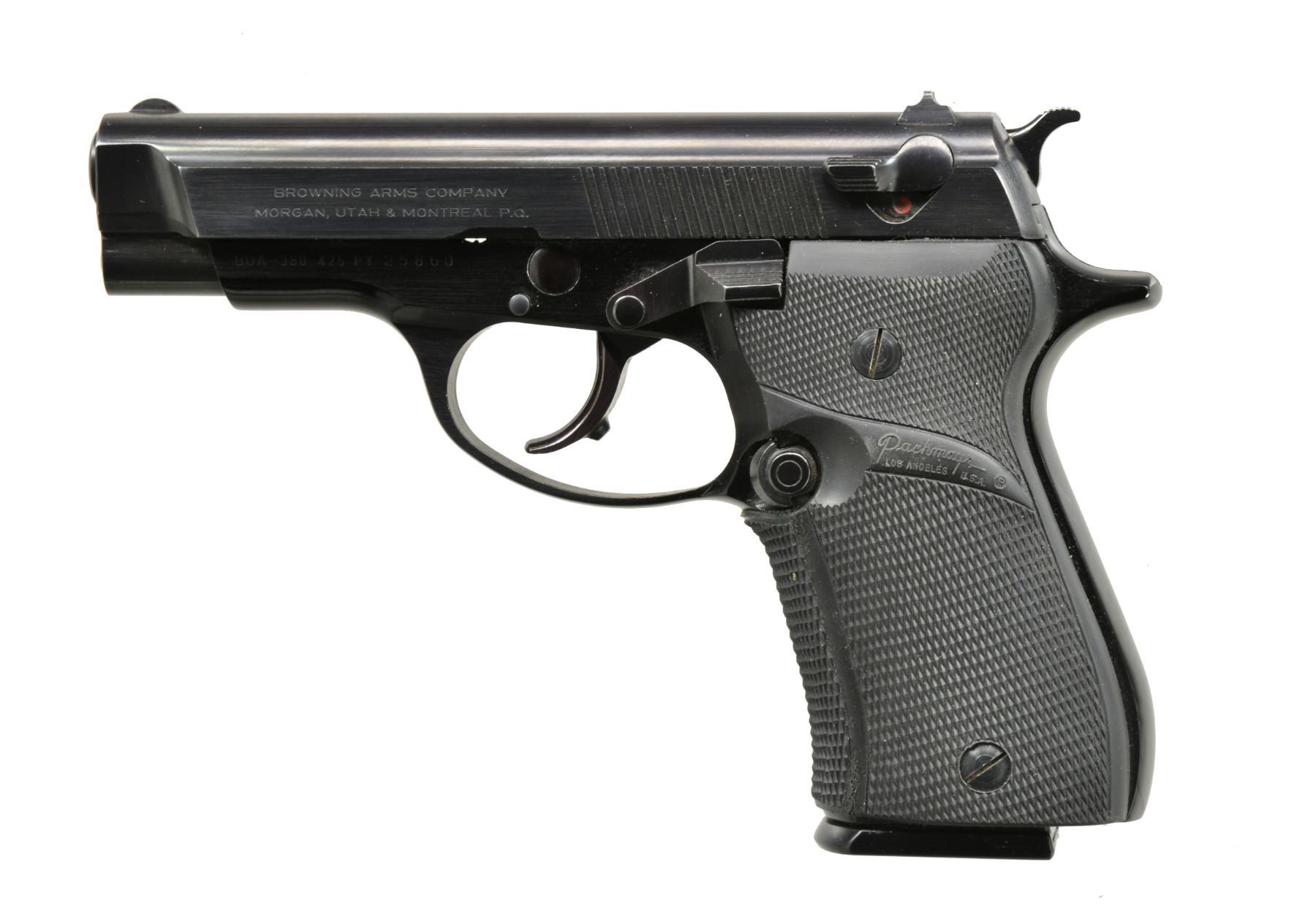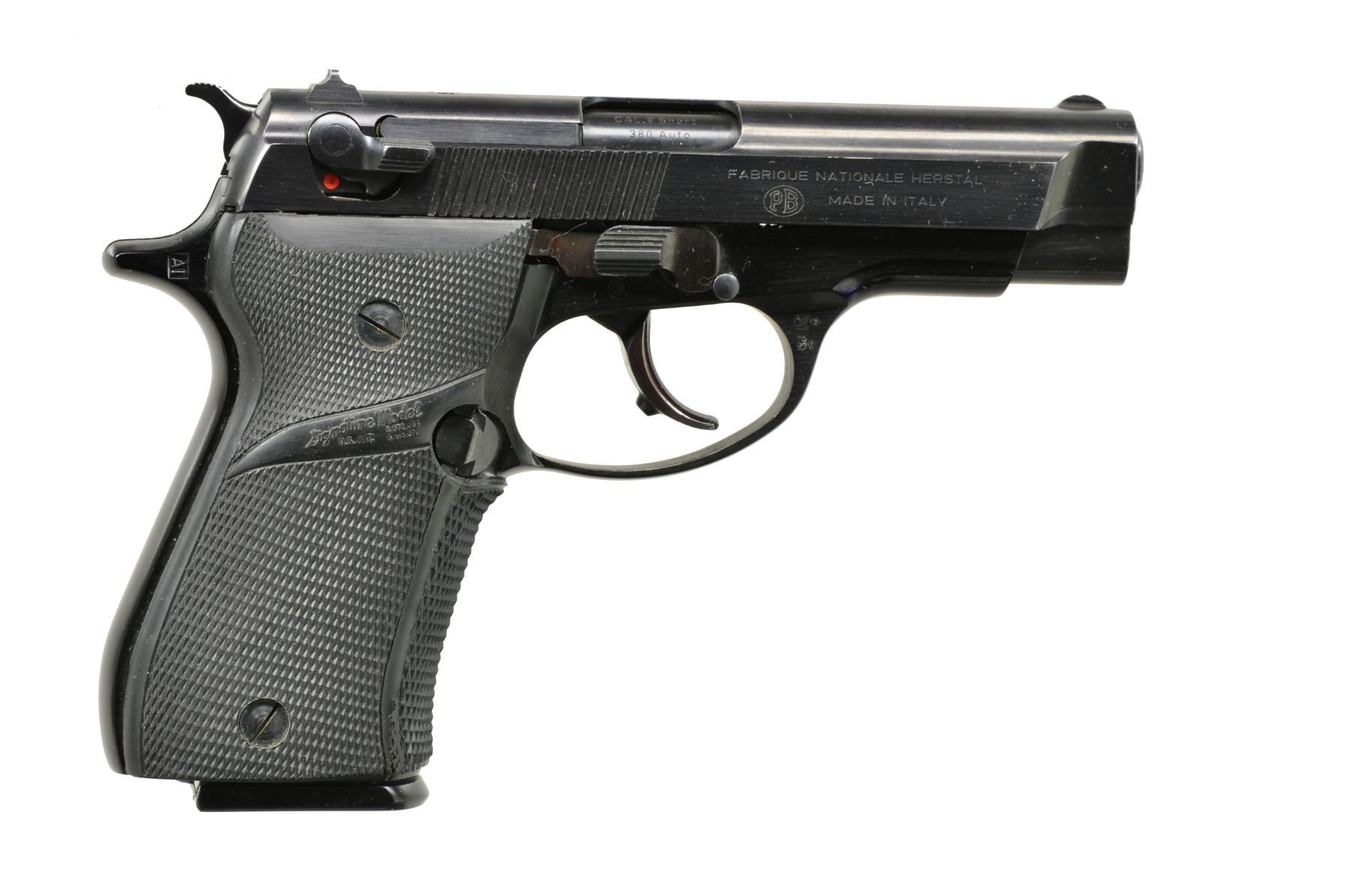 Cal. 380 ACP. S# 425 PY 25860. Bbl. 3 13/16". Mfg. 1982 (1978-1997) by Beretta for Browning. BDA (Browning Double Action) having ambidextrous slide & mag. safeties. Top of slide flattened w/ fixed front sight & drift adj. rear. Pachmayr Signature wrap around rubber grips. MAGS: 2 factory w/ alloy push button bases; 1 blued "ITALY" marked 13 rd. & 1 matte blued "PB" marked 10 rd. CONDITION: generally very good to near excellent w/ only faintest of marks or wear. Bore appears near excellent w/ slight leading appearance in edges of grooves. Near excellent grips. (20-754/NW). MODERN. $400-600.
