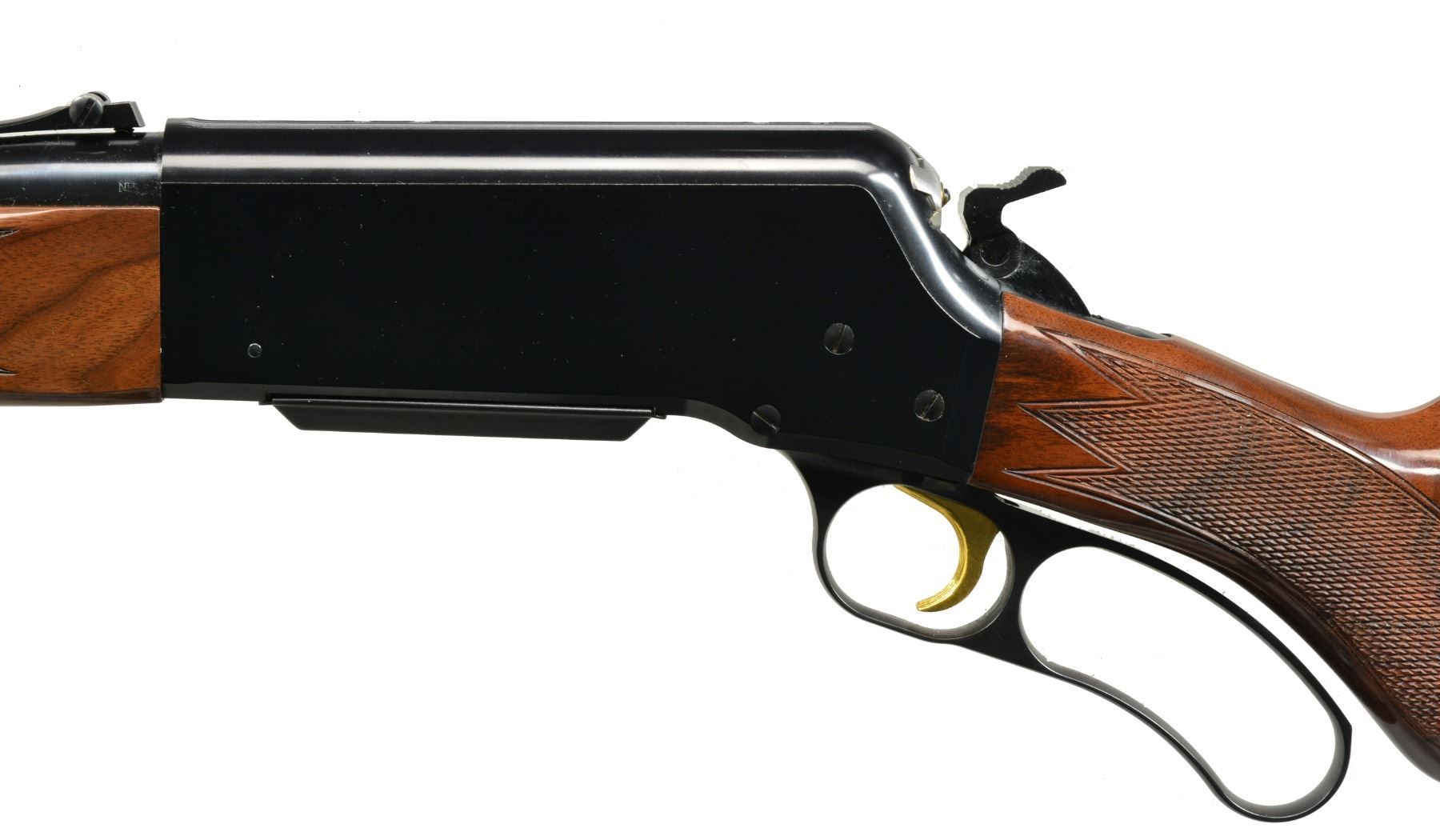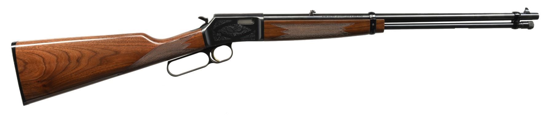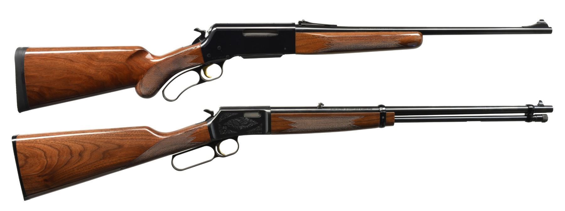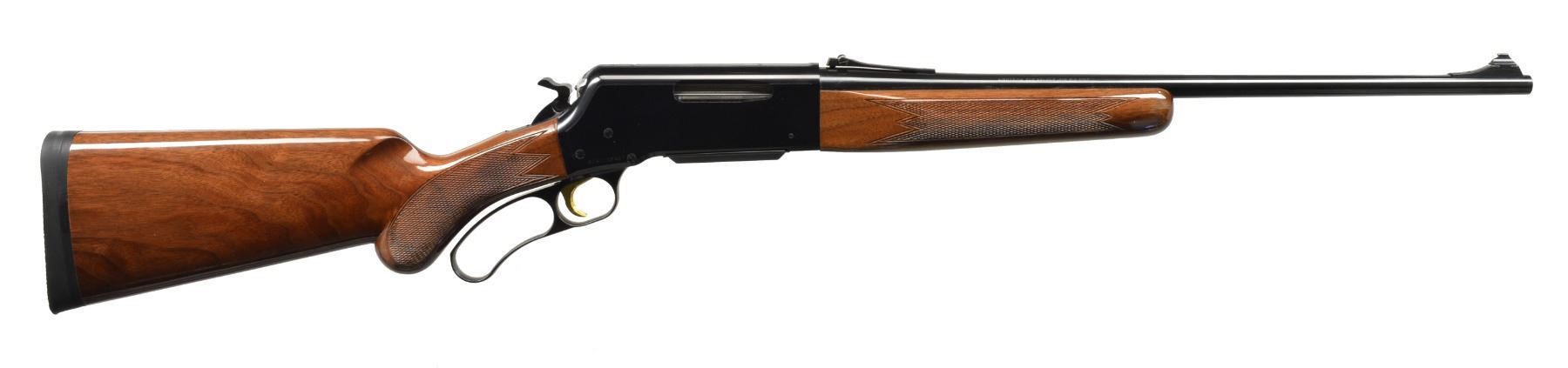 1) BLR SHORT ACTION LIGHTNING. Cal. 308 Win. S# 02471NP427. Bbl. 20" w/ ramp mounted bead front sight & adj. rear sight. Black finished aluminum alloy action w/ rack & pinion gear slide, fold down hammer & gold finished trigger. Gloss finished walnut forearm & rnd. knob pistol grip stock w/ cut checkering & solid black Browning pad. CONDITION: near excellent retaining 99% wood & metal finish. Near excellent bore. (20-1363/DS). 2) BL-22 GRADE II. Cal. 22 S, L, LR. S# 02781NN242. Bbl. 20" w/ blade front sight & folding leaf rear sight. Full length tubular mag. Blued steel action has scroll ornamentation, grooved receiver & gold finished trigger. Band fastened forearm & straight grip stock of gloss finished walnut have cut checkering & original plastic buttplate. CONDITION: near excellent retaining over 99% metal finish. Stock shows sm. scuffs. Near excellent bore. (20-1389/DS). $700-1,050.