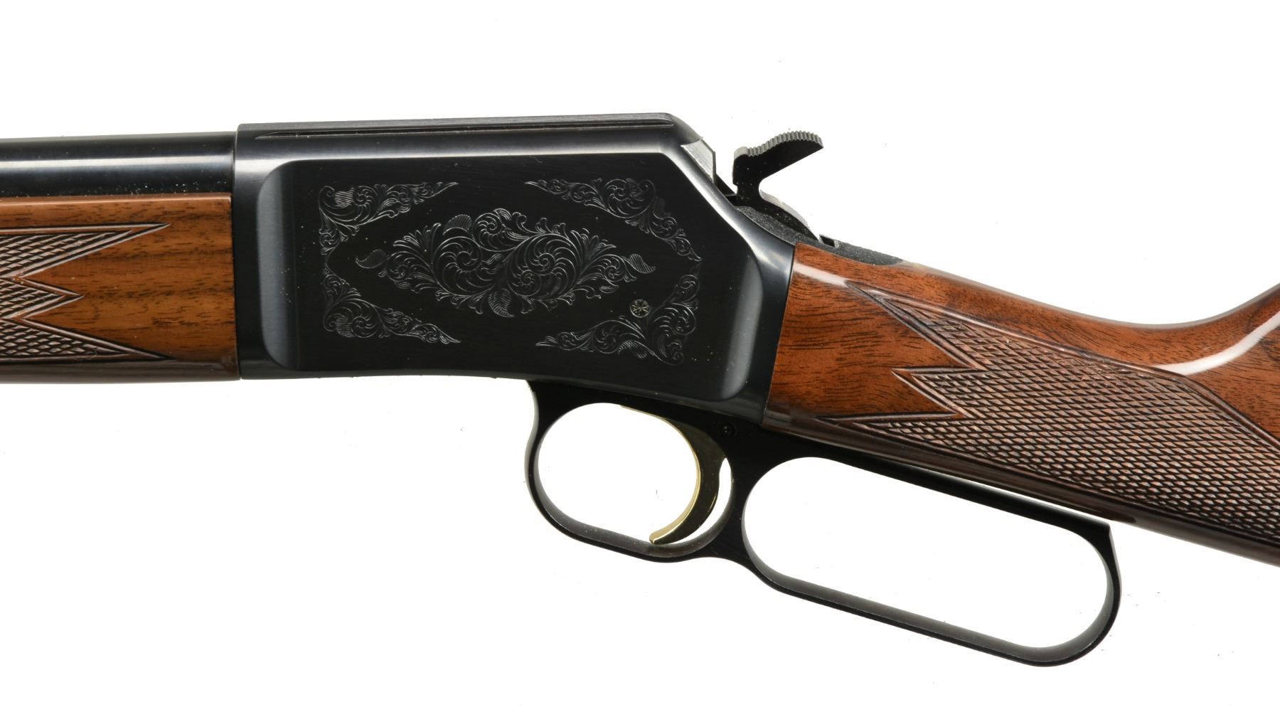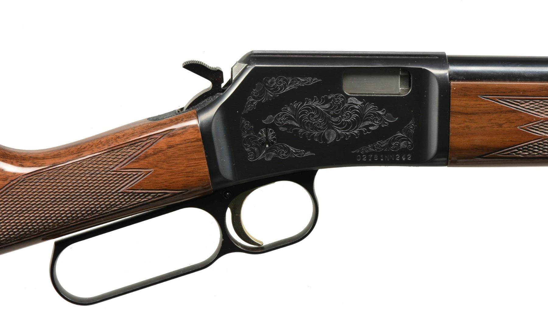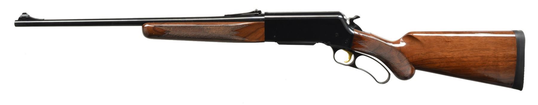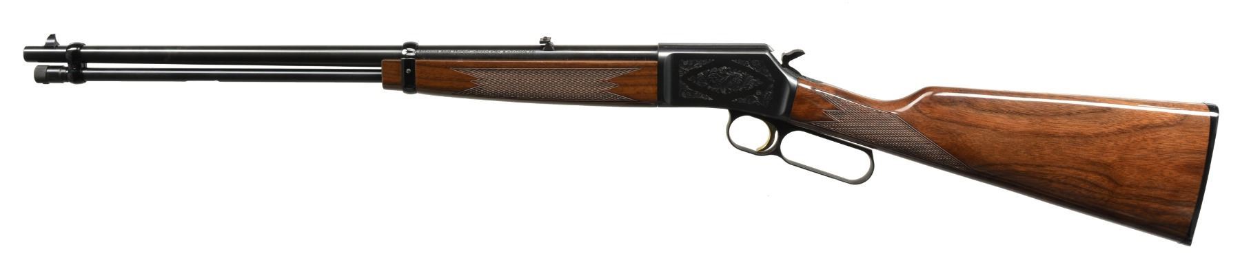 1) BLR SHORT ACTION LIGHTNING. Cal. 308 Win. S# 02471NP427. Bbl. 20" w/ ramp mounted bead front sight & adj. rear sight. Black finished aluminum alloy action w/ rack & pinion gear slide, fold down hammer & gold finished trigger. Gloss finished walnut forearm & rnd. knob pistol grip stock w/ cut checkering & solid black Browning pad. CONDITION: near excellent retaining 99% wood & metal finish. Near excellent bore. (20-1363/DS). 2) BL-22 GRADE II. Cal. 22 S, L, LR. S# 02781NN242. Bbl. 20" w/ blade front sight & folding leaf rear sight. Full length tubular mag. Blued steel action has scroll ornamentation, grooved receiver & gold finished trigger. Band fastened forearm & straight grip stock of gloss finished walnut have cut checkering & original plastic buttplate. CONDITION: near excellent retaining over 99% metal finish. Stock shows sm. scuffs. Near excellent bore. (20-1389/DS). $700-1,050.