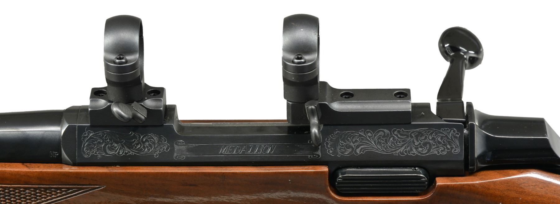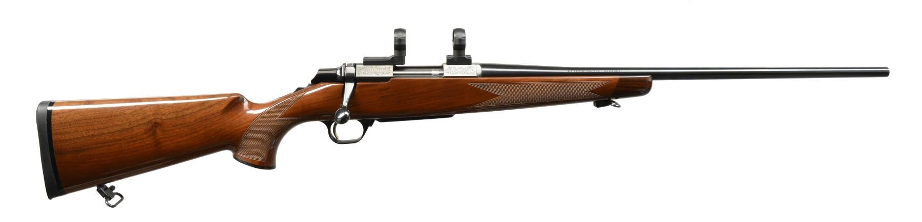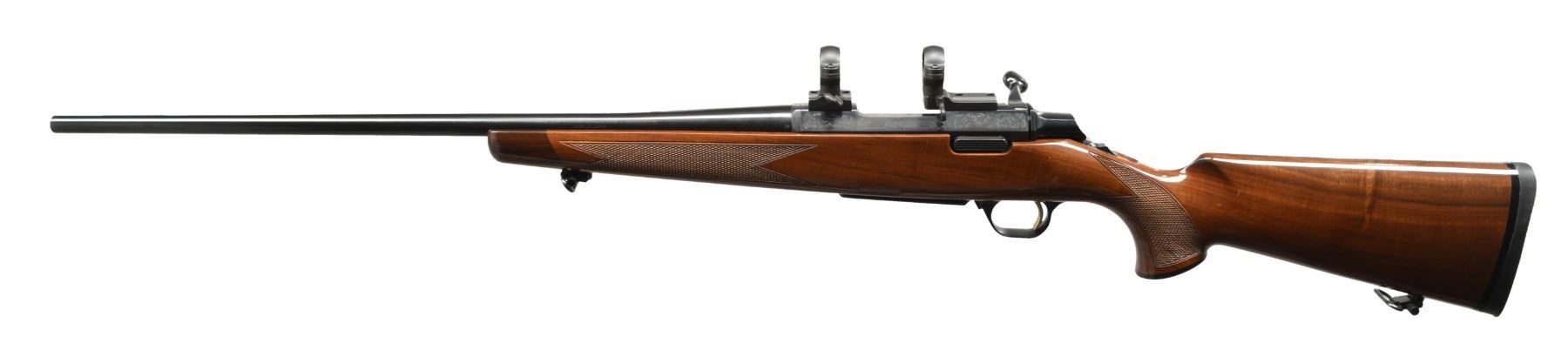 Cal. 284 Win. S# 86639NZ217. Bbl. 22" w/out sights. Short throw 3 lug action featuring cocking indicator, top tang safety & gold finished trigger. Floorplate & receiver have scroll ornamentation. Receiver equipped w/ 2 piece matte finished QD scope bases & rings. Classic style gloss finished walnut stock w/ cut checkering, contrasting forearm tip & grip cap having QD sling swivels. LOP: 13 1/2" over original solid black browning pad. MAGS: 1 detachable 4 rd. enclosed by floorplate. CONDITION: over 98% metal finish. Stock shows a few scratches along left side. Near excellent bore. (20-313/DS). MODERN. $450-650.