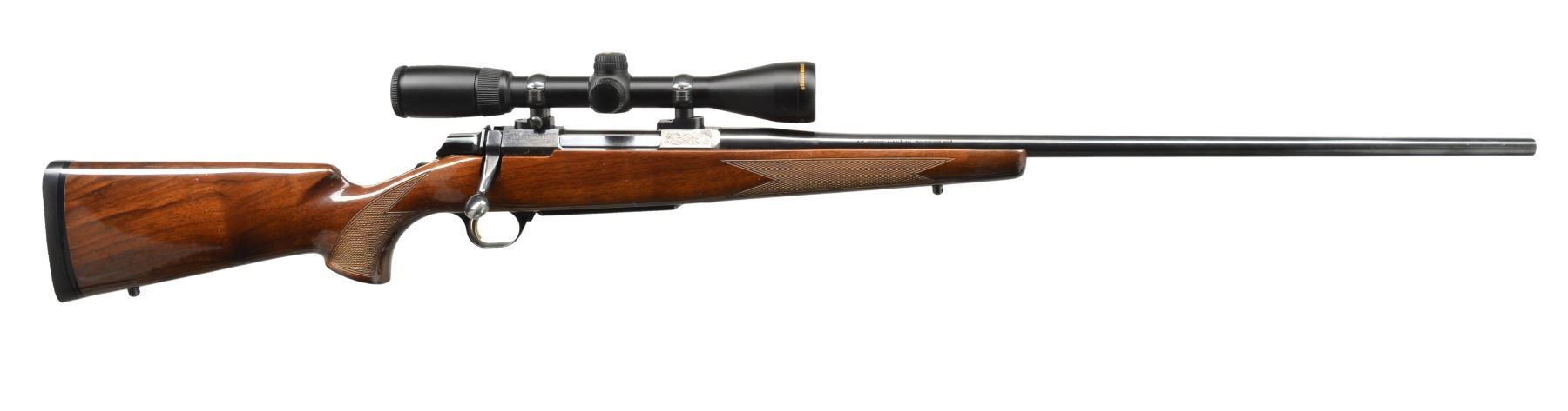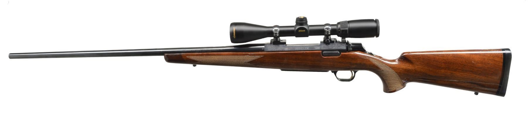 Cal. 7mm Rem. Mag. S# 18444MM351. Bbl. 26" w/ out sights. Nikon Buckmasters 3x-9x matte finished scope w/ duplex reticle on Browning mts. Blued action w/ scroll ornamentation on receiver & floorplate. 3 Lug short throw bolt w/ top tang safety. Classic straight comb walnut stock w/ contrasting forearm tip & grip cap, cut checkering, swivel bases & solid black Browning pad. MAGS: 1 detachable 3 rd. held inside hinged floorplate. CONDITION: over 90% blue. Stock shows scattered scratches & marks. Bore is bright w/ strong rifling. Scope has clear optics. (20-1321/DS). MODERN. $450-650.