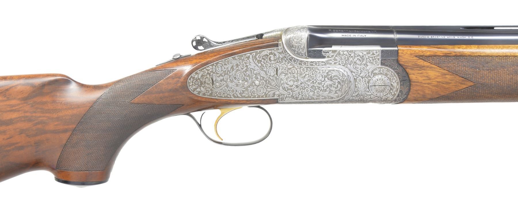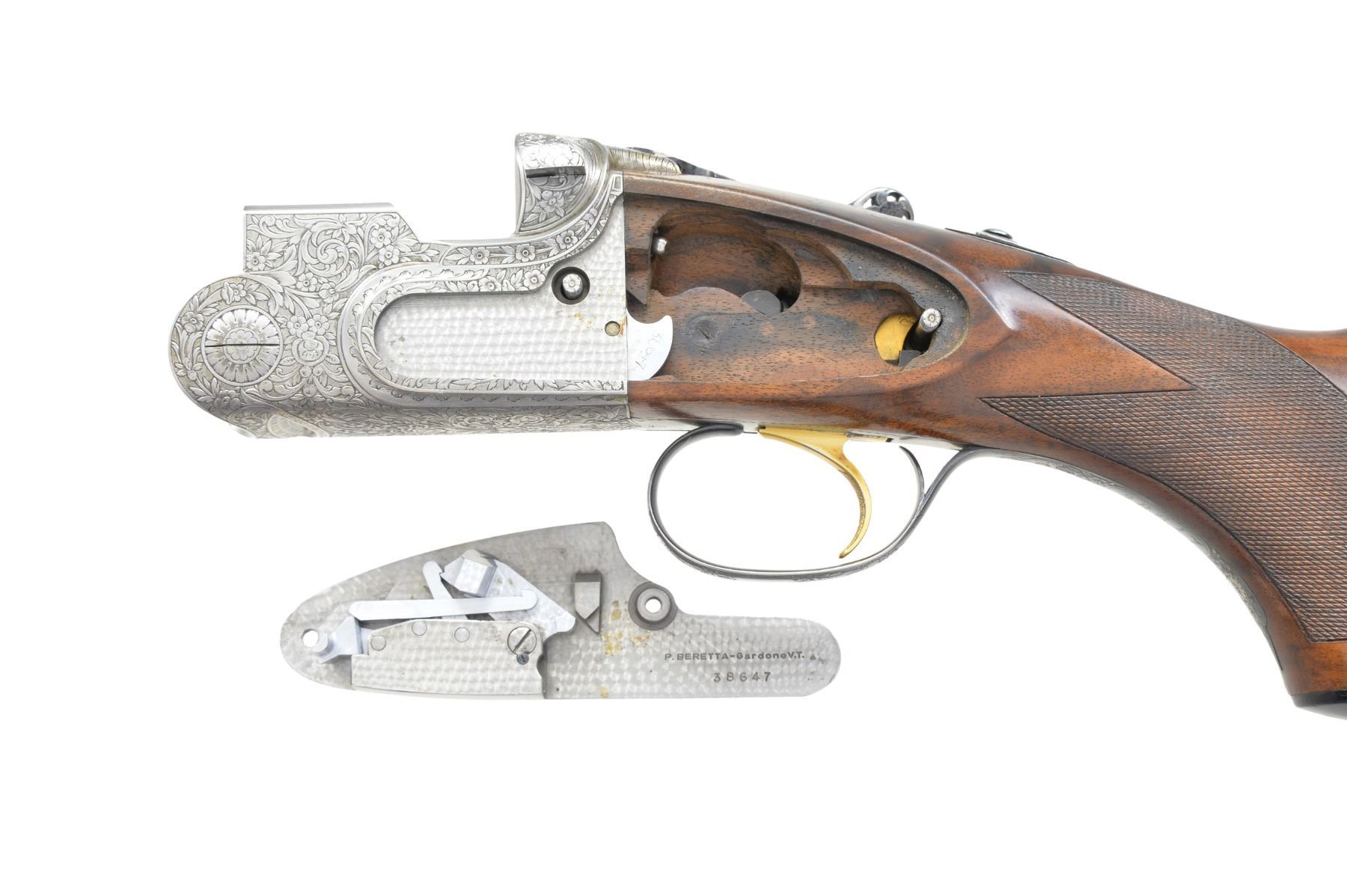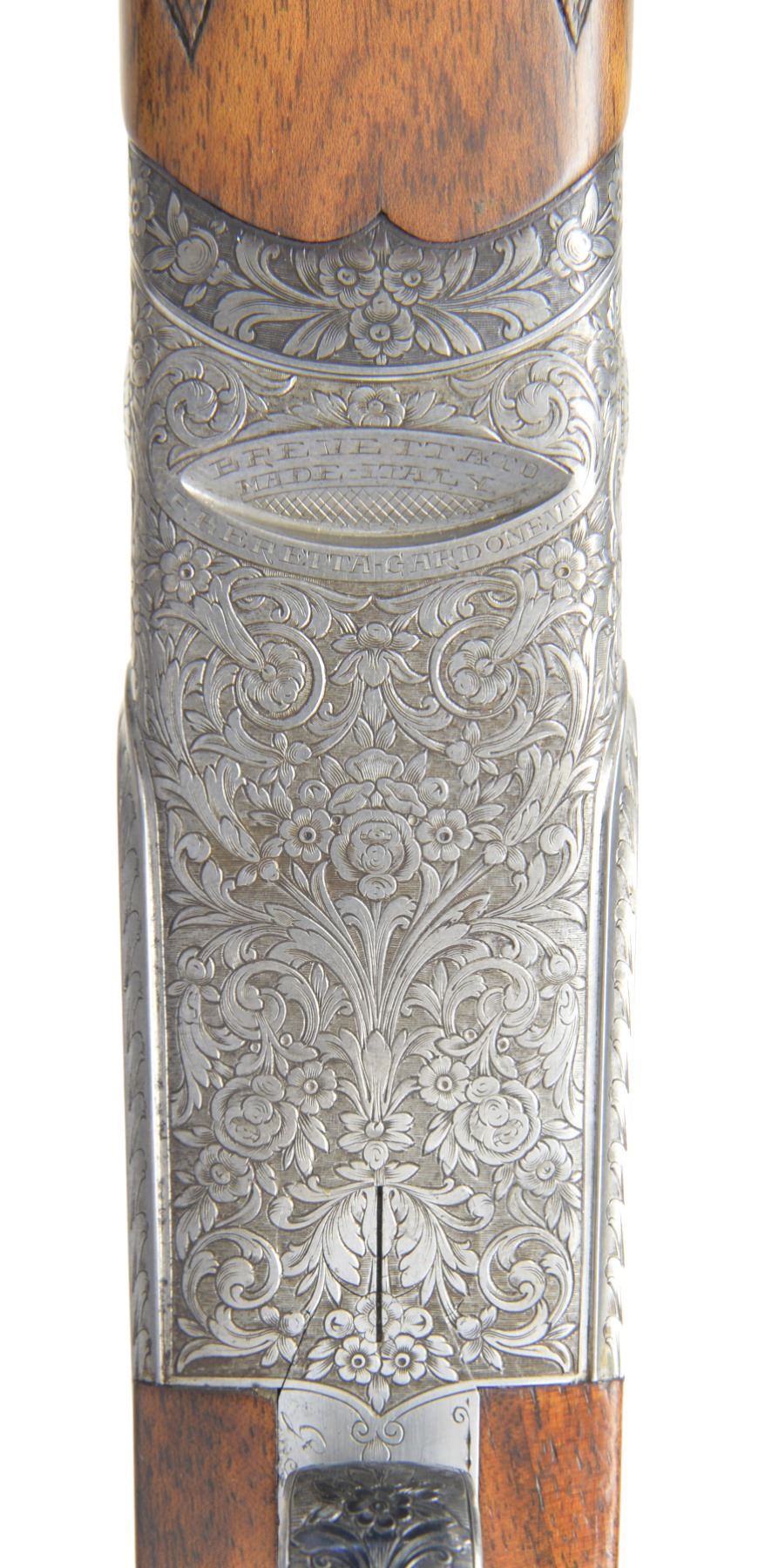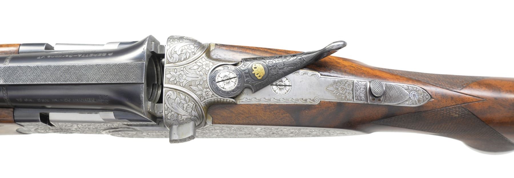 Cal. 12 Ga., 2 3/4". S# 38647. Bbls. 26" VR of Bohler Antinit steel. Fixed IC. & IM. chokes. Hand detachable sidelock action w/ Kerstan dbl. bolt locking. Action, trigger guard, forearm iron & breech section of bbls. have full coverage vine type foliate engraving. Bottom of water table & right side of trigger plate have Beretta Gardone VT markings. Blued pierced top lever is ornamented w/ gold inlaid crown. Gold finished hand checkered SST. Selective ejectors. Sides of breech end of bbl., inside of forearm, as well as insides of locks & receiver have fine machine jeweling. Ejector hammers are gold finished. Trim hunting style forearm & capped pistol grip stock of exhibition quality European walnut having very nice marbling & color contrasts. LOP: 14 1/8" to checkered butt. DAC: 1 5/8". DAH: 2 1/8". Stock has slight cast off. WEIGHT: 7 lbs., 3.4 oz. Italian proof dates gun to 1971 mfg. UNATTACHED ACCESSORIES: leather covered luggage case containing Beretta instructions & warranty card, snap caps & case key. CONDITION: bbls. retain 90% lightly faded blue showing slight muzzle wear. Coin finished action shows areas w/ slightly darkened appearance. Stock has coat of added varnish over light wear & shows a few scattered handling marks. Very nice bright bores. (19-4477/DS). MODERN. $8,000-12,000.