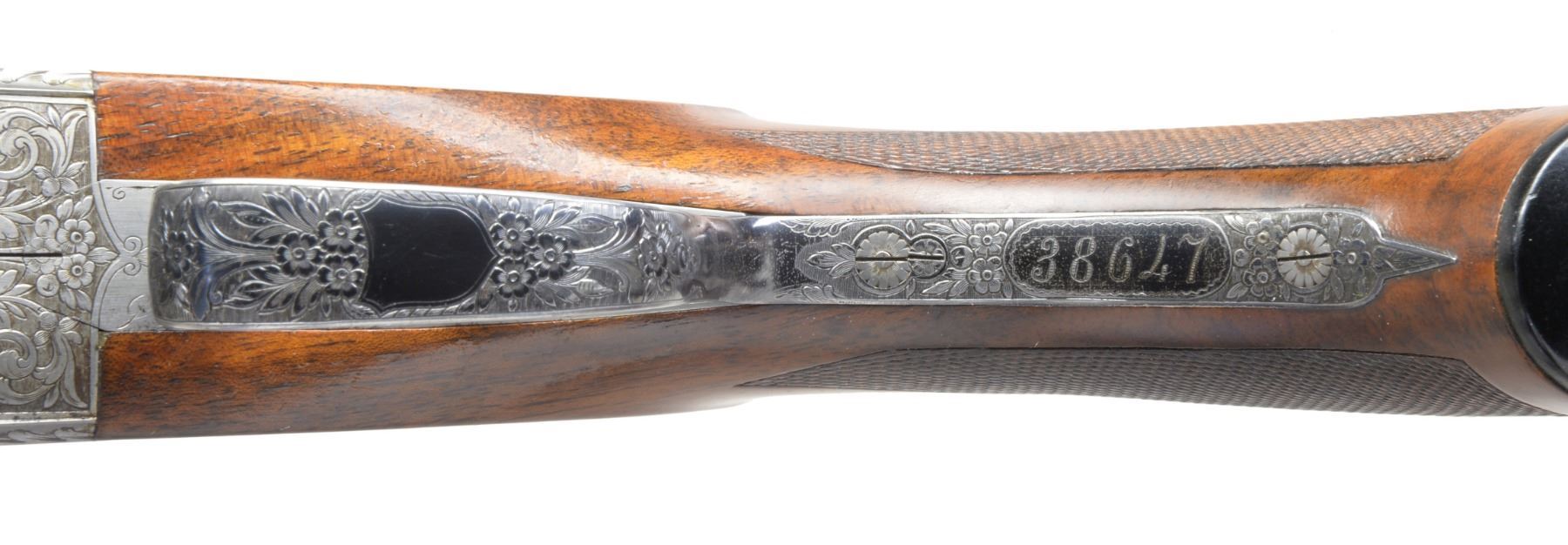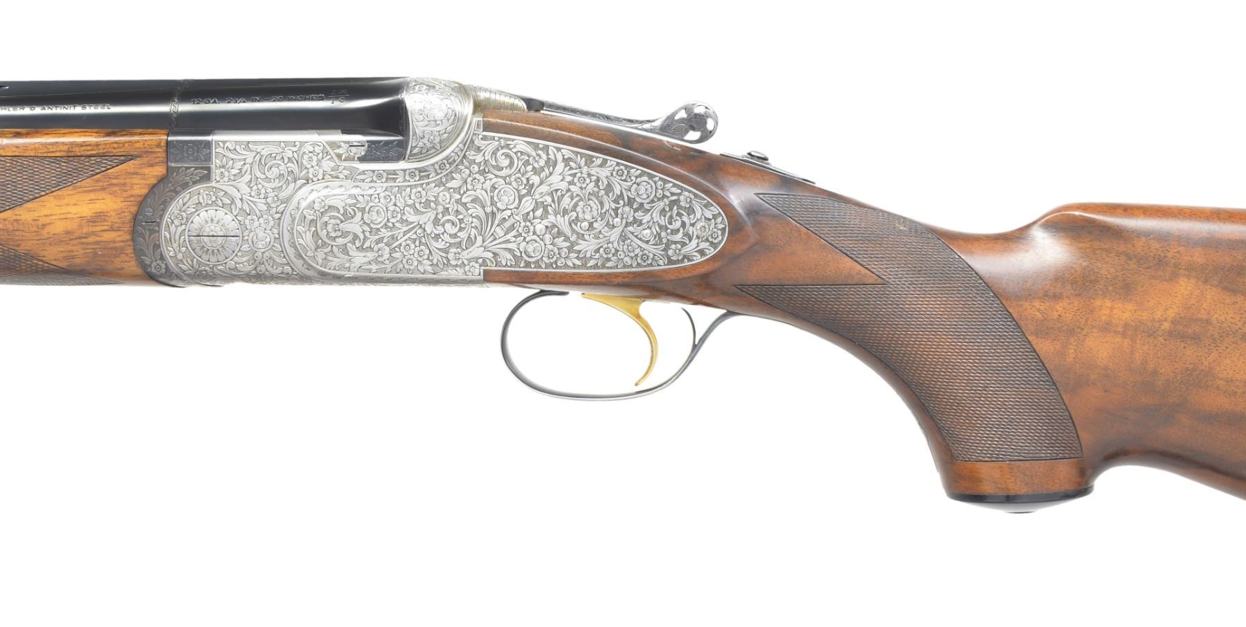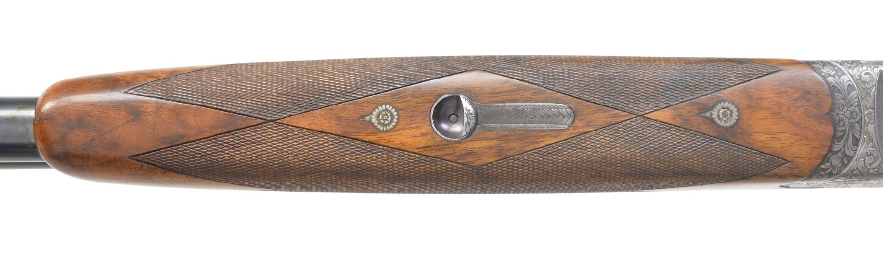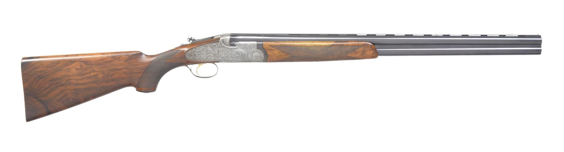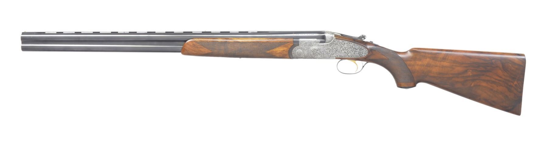 Cal. 12 Ga., 2 3/4". S# 38647. Bbls. 26" VR of Bohler Antinit steel. Fixed IC. & IM. chokes. Hand detachable sidelock action w/ Kerstan dbl. bolt locking. Action, trigger guard, forearm iron & breech section of bbls. have full coverage vine type foliate engraving. Bottom of water table & right side of trigger plate have Beretta Gardone VT markings. Blued pierced top lever is ornamented w/ gold inlaid crown. Gold finished hand checkered SST. Selective ejectors. Sides of breech end of bbl., inside of forearm, as well as insides of locks & receiver have fine machine jeweling. Ejector hammers are gold finished. Trim hunting style forearm & capped pistol grip stock of exhibition quality European walnut having very nice marbling & color contrasts. LOP: 14 1/8" to checkered butt. DAC: 1 5/8". DAH: 2 1/8". Stock has slight cast off. WEIGHT: 7 lbs., 3.4 oz. Italian proof dates gun to 1971 mfg. UNATTACHED ACCESSORIES: leather covered luggage case containing Beretta instructions & warranty card, snap caps & case key. CONDITION: bbls. retain 90% lightly faded blue showing slight muzzle wear. Coin finished action shows areas w/ slightly darkened appearance. Stock has coat of added varnish over light wear & shows a few scattered handling marks. Very nice bright bores. (19-4477/DS). MODERN. $8,000-12,000.