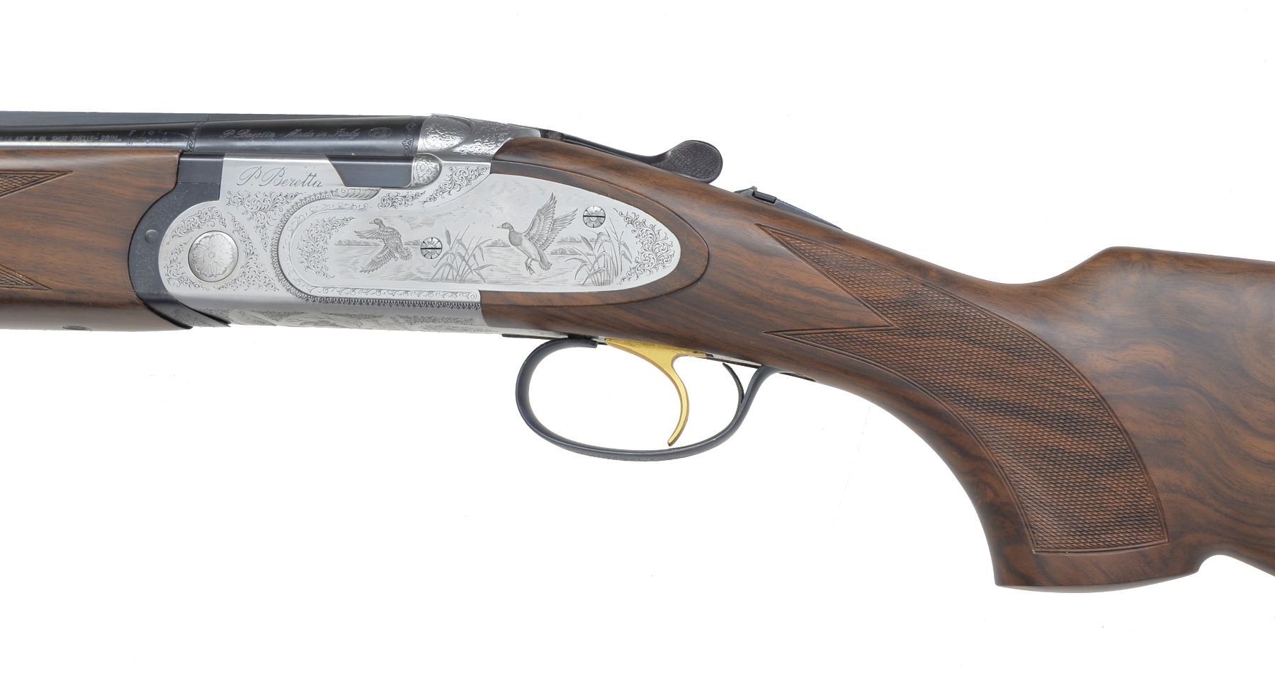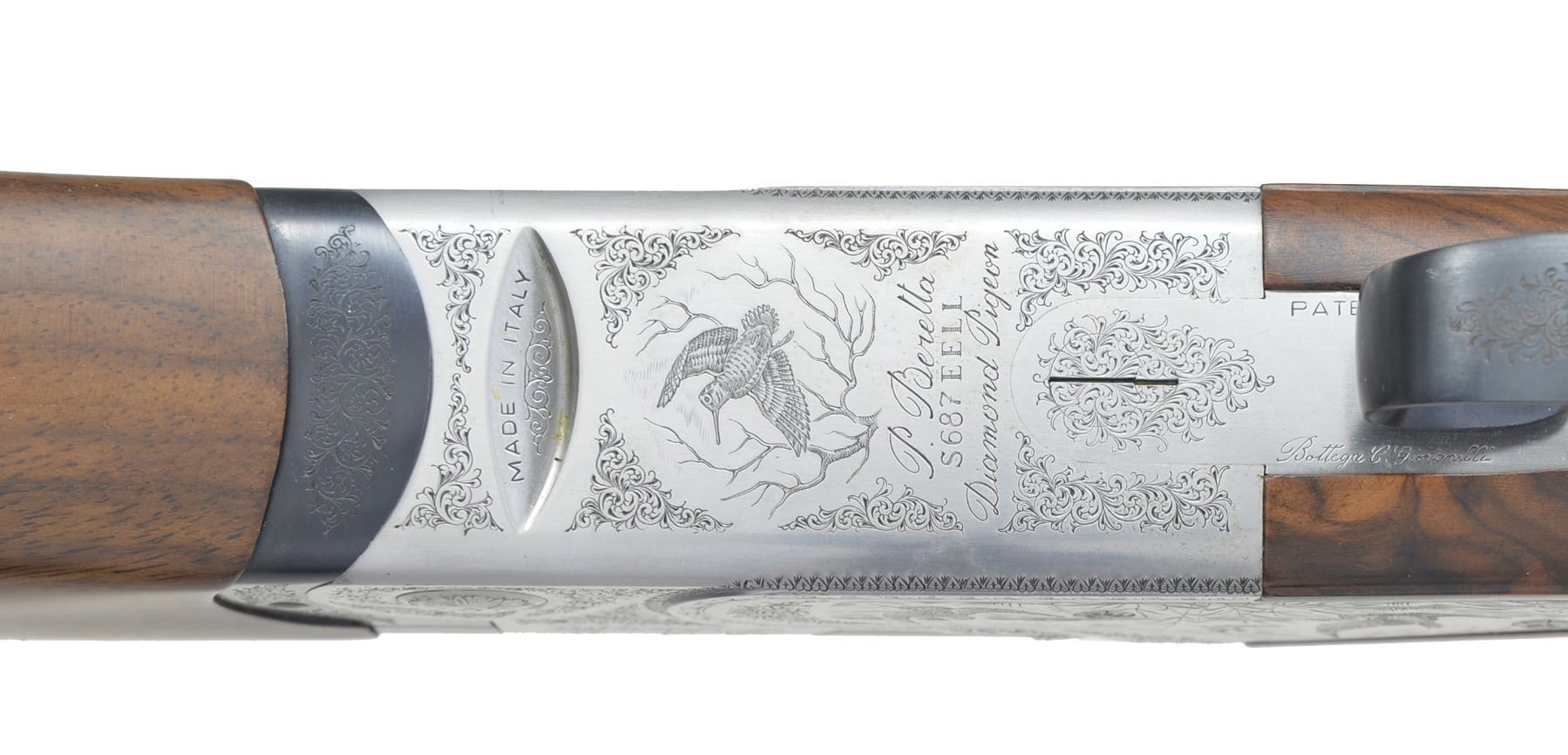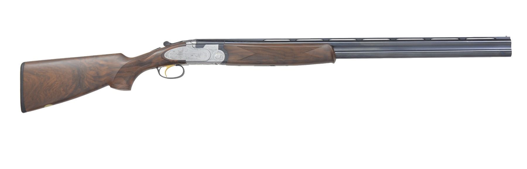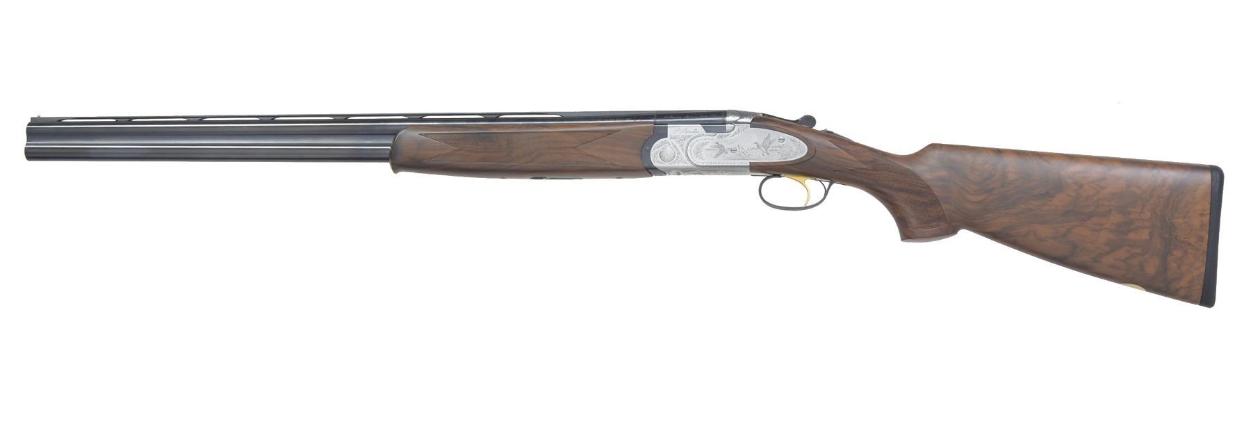 Cal. 12 Ga., 2 3/4". S# M41810B. Bbls. 28" VR of Excelsior High Strength Alloyed Steel. Fixed Fixed Mod. & Full chokes. Satin finished sideplated action w/ full coverage engraving signed by Botega C Giovanelli. Engraving feature game scenes of snipe on the right side plate, mallards on the left w/ a woodcock on the floorplate. Balance of action has generous coverage of vine type foliate scroll. Gold plated SST. Selective ejectors. Schnabel tipped forearm & field dimension pistol grip stock of satin finished Presentation grade walnut w/ point pattern hand checkering. Toe line of stock has gold name plate. LOP: 14 3/8" over thin solid black pad. UNATTACHED ACCESSORIES: molded blue case containing gun covers, owner's manual, registration card, case information & sling swivel set. Case exterior shows scuffs & light wear. CONDITION: near excellent retaining over 98% wood & metal finish. Near excellent bores. (20-1167/DS). MODERN. $3,000-5,000.
