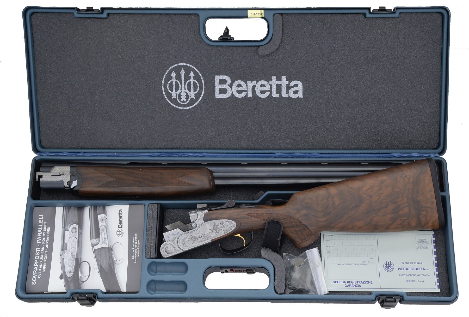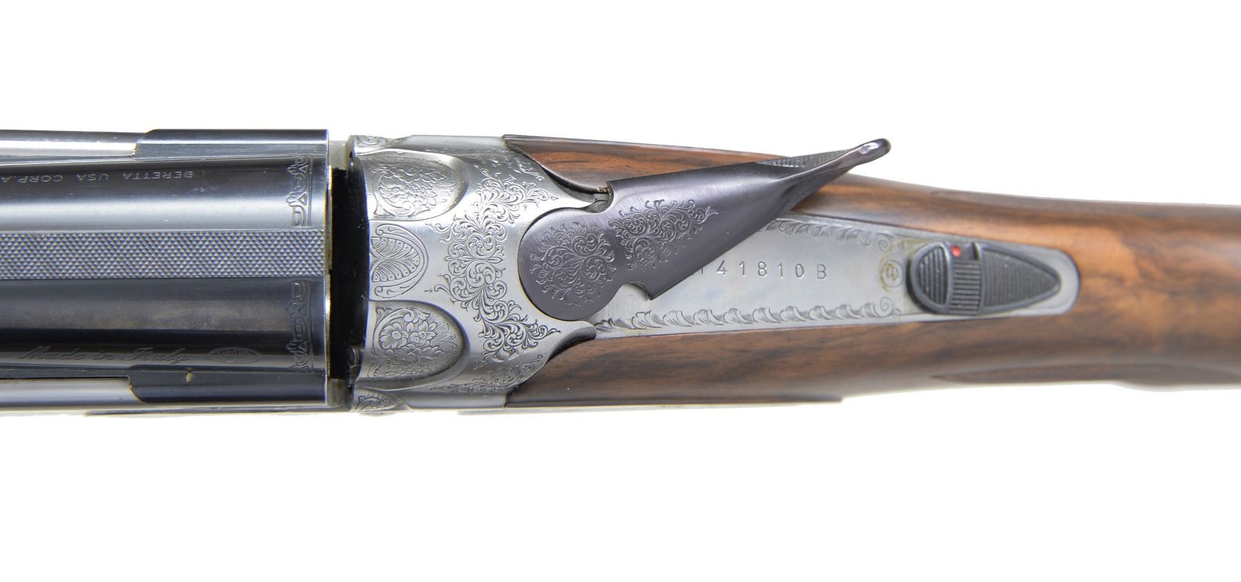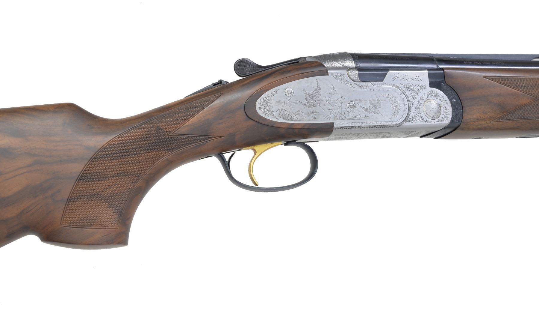 Cal. 12 Ga., 2 3/4". S# M41810B. Bbls. 28" VR of Excelsior High Strength Alloyed Steel. Fixed Fixed Mod. & Full chokes. Satin finished sideplated action w/ full coverage engraving signed by Botega C Giovanelli. Engraving feature game scenes of snipe on the right side plate, mallards on the left w/ a woodcock on the floorplate. Balance of action has generous coverage of vine type foliate scroll. Gold plated SST. Selective ejectors. Schnabel tipped forearm & field dimension pistol grip stock of satin finished Presentation grade walnut w/ point pattern hand checkering. Toe line of stock has gold name plate. LOP: 14 3/8" over thin solid black pad. UNATTACHED ACCESSORIES: molded blue case containing gun covers, owner's manual, registration card, case information & sling swivel set. Case exterior shows scuffs & light wear. CONDITION: near excellent retaining over 98% wood & metal finish. Near excellent bores. (20-1167/DS). MODERN. $3,000-5,000.