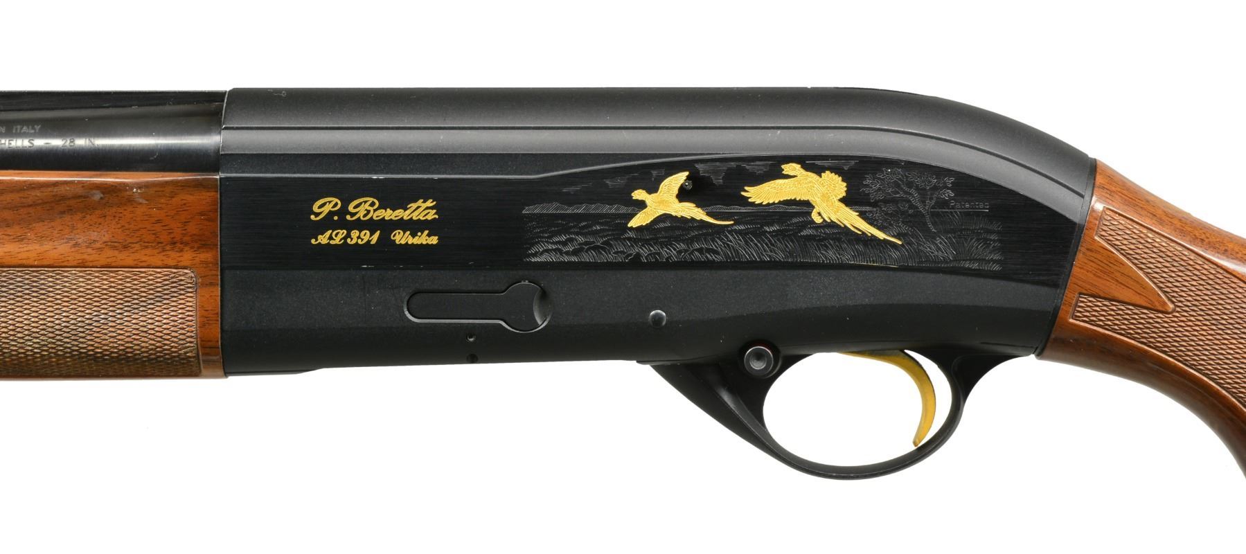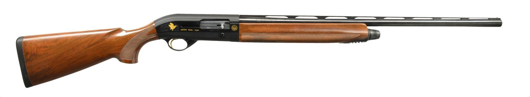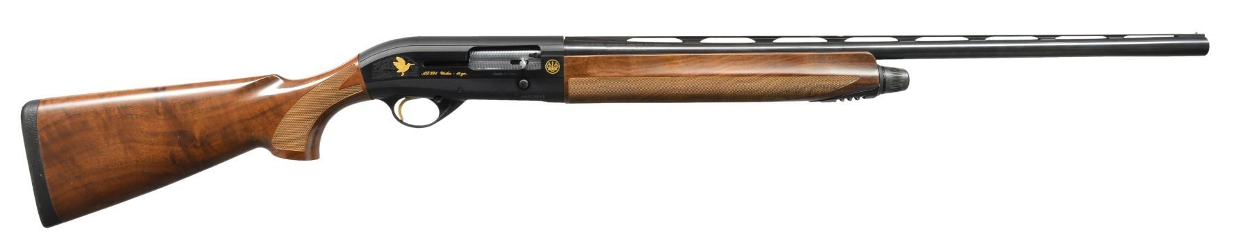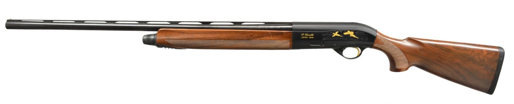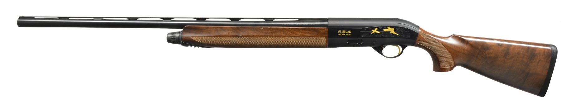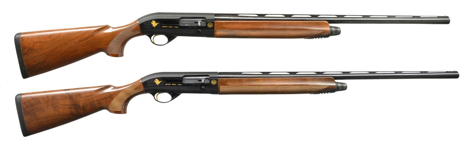 SHOTGUNS. 1) Cal. 12 Ga., 2 3/4" & 3". S# AA013544. Bbl. 28" VR w/ steel bead & fitted for Mobile chokes; full set of 5 tubes included. Matte black anodized alloy receiver w/ side panels having gold markings w/ game scenes having gold plated woodcock on right side & 2 flying pheasants on left side. Jeweled bolt & carrier. Gold finished trigger. Forearm & pistol grip buttstock of checkered nicely grained walnut . LOP: 14 3/8" over solid black Beretta pad. UNATTACHED ACCESSORIES: blue molded case containing spare chokes, choke wrench, Beretta oil, stock shims, sling swivels, buttplate, grip cap, plug, owner's manual & warranty information. CONDITION: bbl. & action retain 98% blue showing light scratches on left side of receiver. Stock & forearm show a few sm. marks. Clean bright bore. (20-1169/DS). 2) Cal. 12 Ga., 2 3/4" & 3". S# AA013543. Bbl. 28" VR w/ steel bead & fitted for Mobile chokes; full set of 5 tubes included. Matte black anodized alloy receiver w/ side panels having gold markings w/ game scenes having gold plated woodcock on right side & 2 flying pheasants on left side. Jeweled bolt & carrier. Gold finished trigger. Forearm & pistol grip buttstock of checkered fancy walnut. LOP: 14 3/8" over solid black Beretta pad. UNATTACHED ACCESSORIES: blue molded case containing spare chokes, choke wrench, Beretta oil, stock shims, sling swivels, buttplate, grip cap, plug, owner's manual & warranty information. CONDITION: bbl. & action retain over 98% finish w// sm. handling marks. Stocks show scattered sm. dents & marks. Clean bright bore. (20-1170/DS). BOTH MODERN. $1,200-1,800.