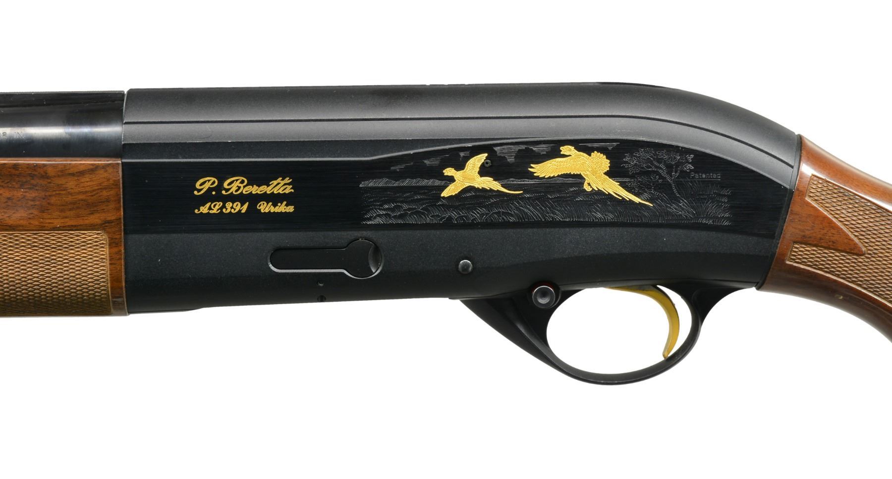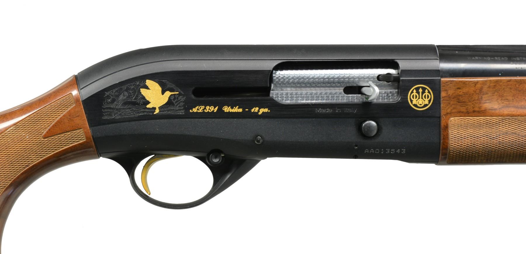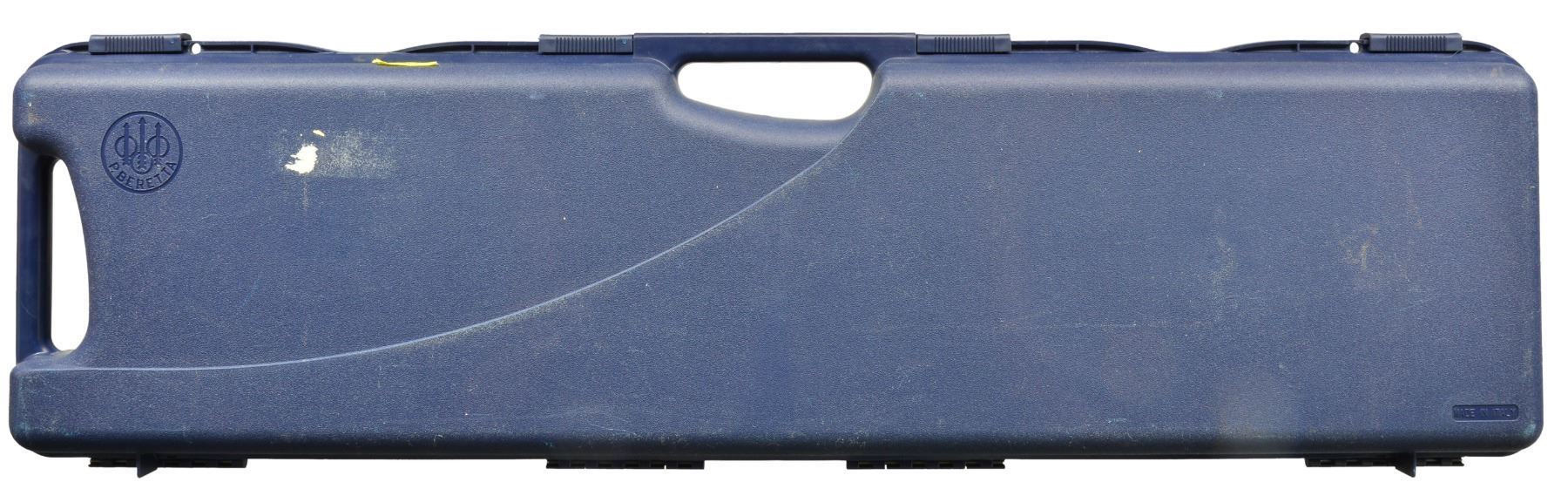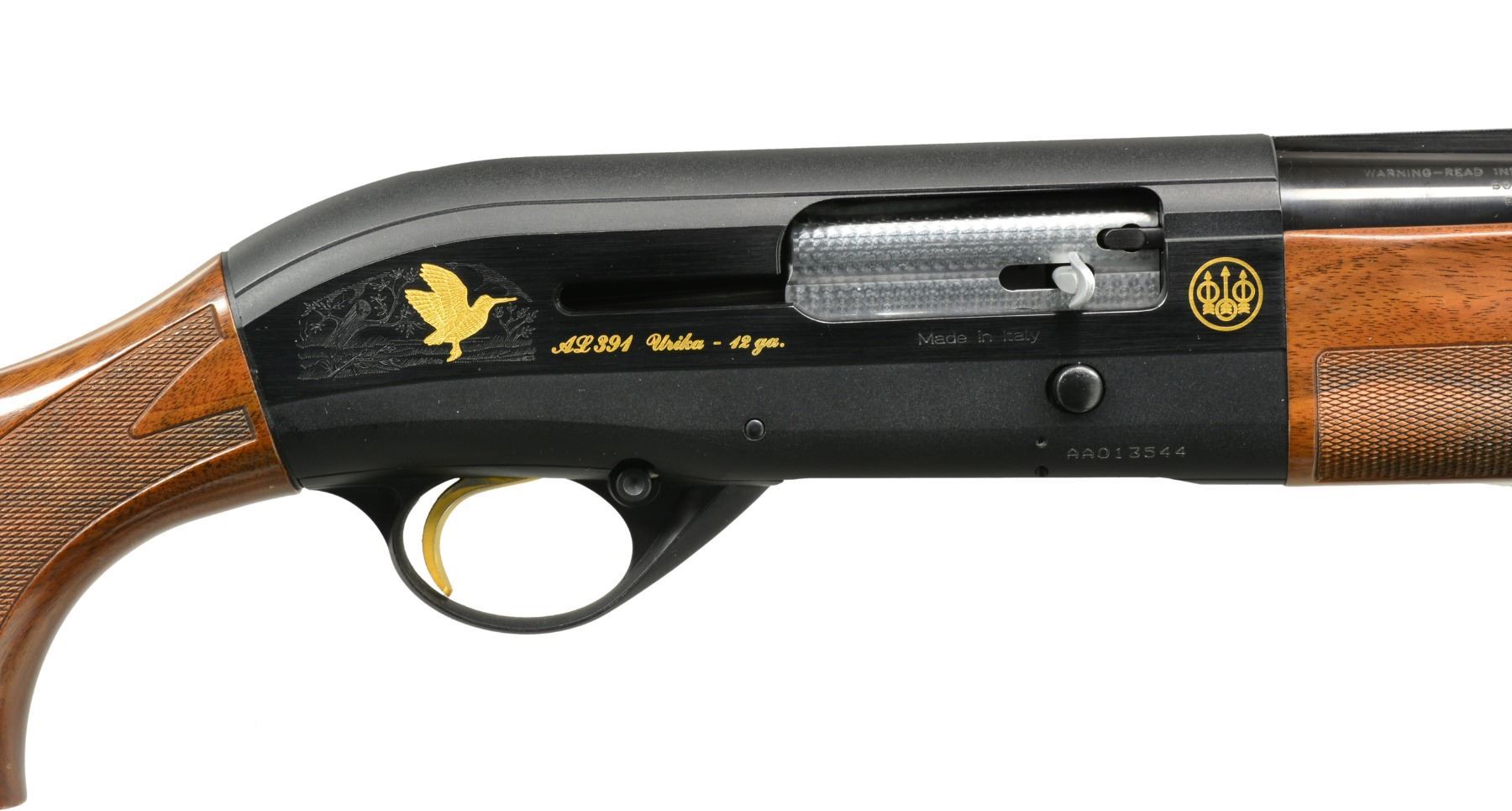 SHOTGUNS. 1) Cal. 12 Ga., 2 3/4" & 3". S# AA013544. Bbl. 28" VR w/ steel bead & fitted for Mobile chokes; full set of 5 tubes included. Matte black anodized alloy receiver w/ side panels having gold markings w/ game scenes having gold plated woodcock on right side & 2 flying pheasants on left side. Jeweled bolt & carrier. Gold finished trigger. Forearm & pistol grip buttstock of checkered nicely grained walnut . LOP: 14 3/8" over solid black Beretta pad. UNATTACHED ACCESSORIES: blue molded case containing spare chokes, choke wrench, Beretta oil, stock shims, sling swivels, buttplate, grip cap, plug, owner's manual & warranty information. CONDITION: bbl. & action retain 98% blue showing light scratches on left side of receiver. Stock & forearm show a few sm. marks. Clean bright bore. (20-1169/DS). 2) Cal. 12 Ga., 2 3/4" & 3". S# AA013543. Bbl. 28" VR w/ steel bead & fitted for Mobile chokes; full set of 5 tubes included. Matte black anodized alloy receiver w/ side panels having gold markings w/ game scenes having gold plated woodcock on right side & 2 flying pheasants on left side. Jeweled bolt & carrier. Gold finished trigger. Forearm & pistol grip buttstock of checkered fancy walnut. LOP: 14 3/8" over solid black Beretta pad. UNATTACHED ACCESSORIES: blue molded case containing spare chokes, choke wrench, Beretta oil, stock shims, sling swivels, buttplate, grip cap, plug, owner's manual & warranty information. CONDITION: bbl. & action retain over 98% finish w// sm. handling marks. Stocks show scattered sm. dents & marks. Clean bright bore. (20-1170/DS). BOTH MODERN. $1,200-1,800.