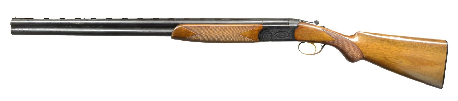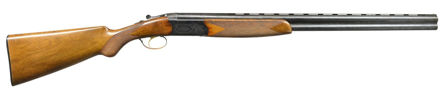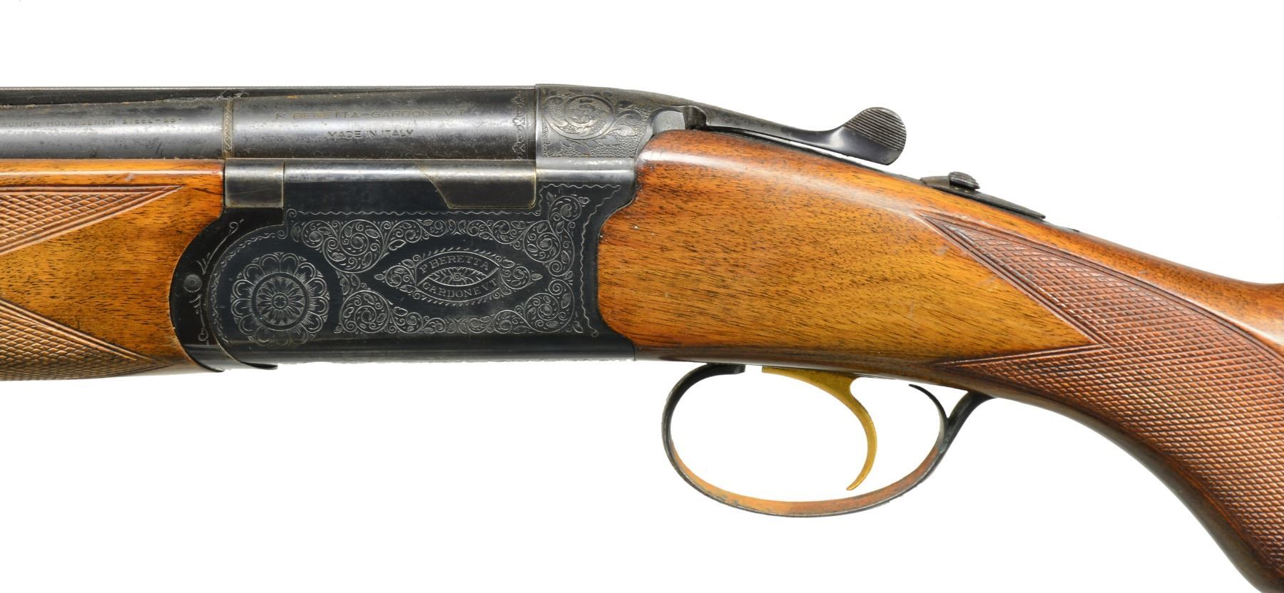 Cal. 12 Ga. S# P01449. Bbls. 28" Mono-bloc w/ narrow, ventilated rib are choked "mod" & "full". Usual markings are on bbls. including 1968 Italian nitro proofs for 2 3/4" chambers. Blued low profile O/U action features automatic safety & gold plated single selective trigger. Action engraved w/ 80% coverage varying sized open scroll. Relatively plain American walnut rnd. knob pistol grip stock measures 14 1/4" over Beretta buttplate. Matching one piece forend has knurled roll release. DAH: 2 5/16". DAC: 1 3/8". WEIGHT: 7 lbs. 4oz. CONDITION: fine, but dirty. Metal parts retain over 85% original blue but considerably gummed w/ congealed oil. There is active rust on the inside of trigger guard & on safety button. Stocks retain over 90% original varnish w/ a fair number of marks & scratches. Checkering has very light wear. Bright shiny bores. Mechanically good. A good cleaning would make this gun much more attractive. (20-779/MGM147). CURIO. $500-700.