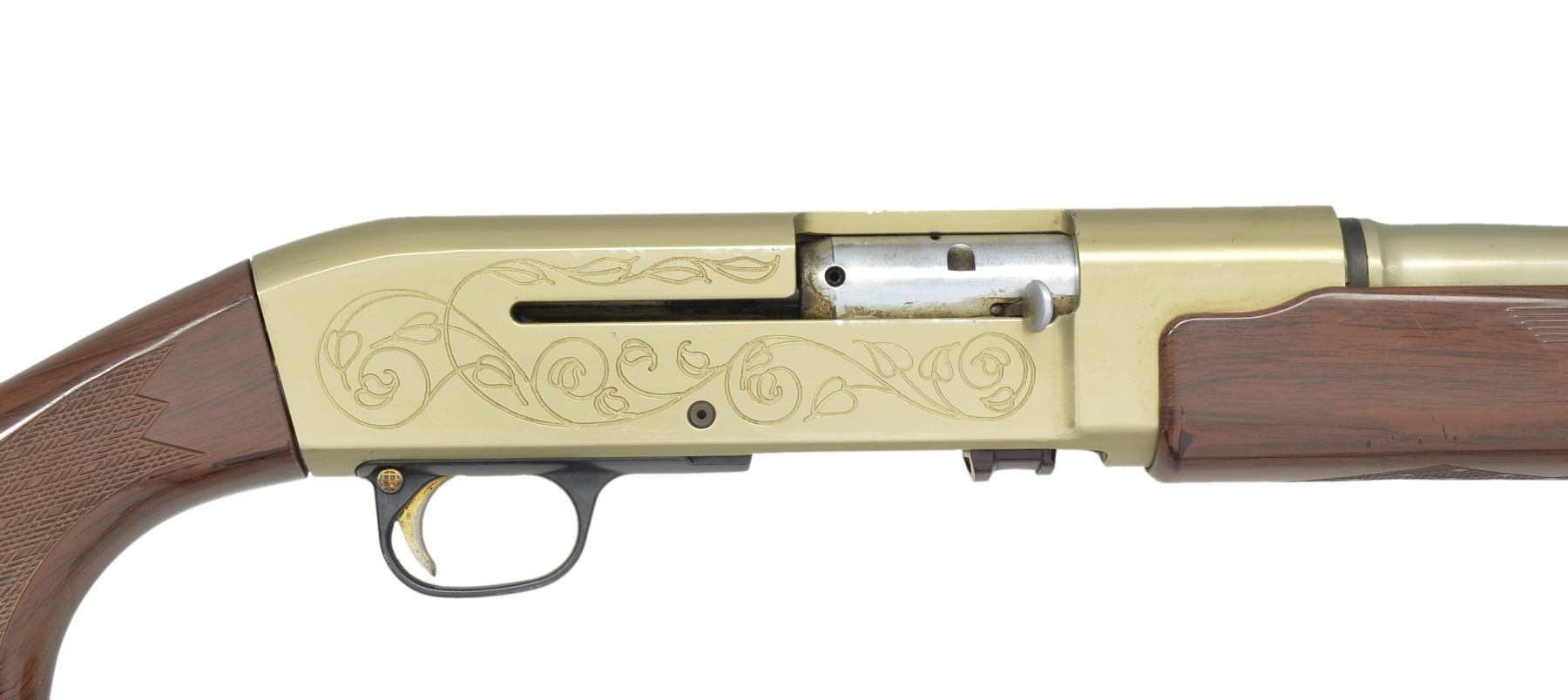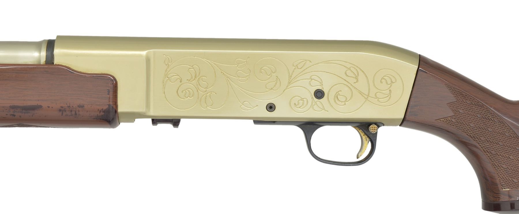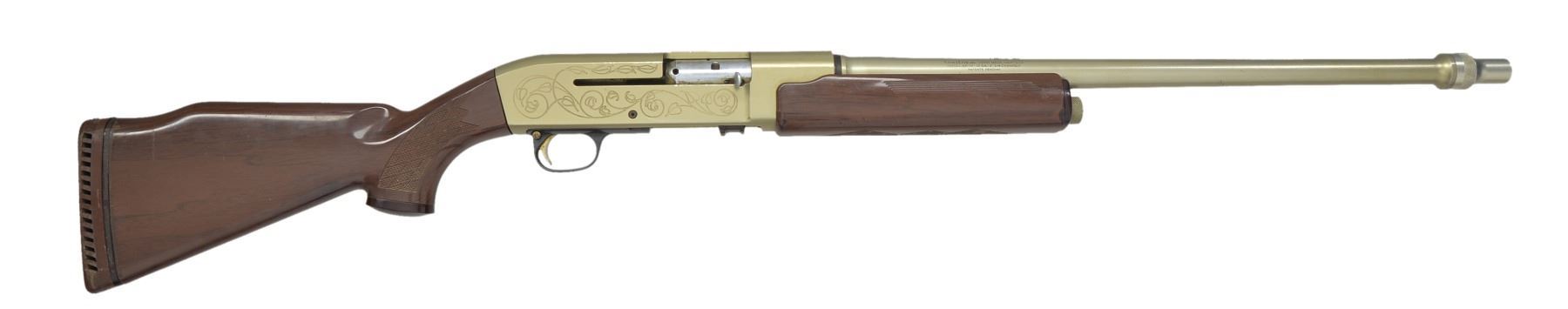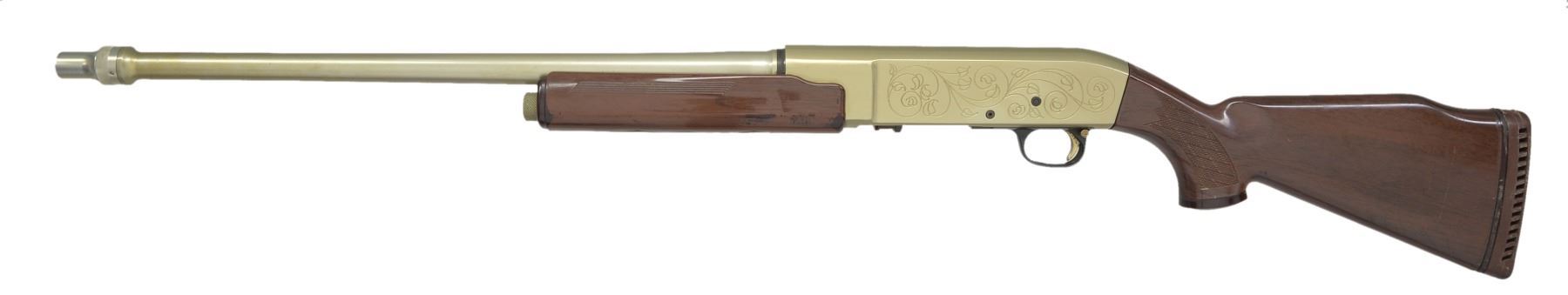 Cal. 12 Ga., 2 3/4". S# NSN. Bbl. 24" w/ interchangeable choke, mod tube included. Recoil operated shotgun w/ high strength aluminum bbl. & receiver having gold anodized finish. Receiver has open pattern scroll ornamentation. Plastic trigger guard. Gold finished trigger & safety. Wood grain Monte Carlo stock & plastic forearm w/ skip line checkering. LOP 14 3/8" over original pad. WEIGHT: 5 lbs. 8.3 oz. Only 2000 mfg. 1964-65. CONDITION: bbl. & action retain over 90% fading gold finish showing sm. handling marks. Stocks show scuffs & scratches. Very good bright bore. (20-13/DS). CURIO. $800-1,200.
