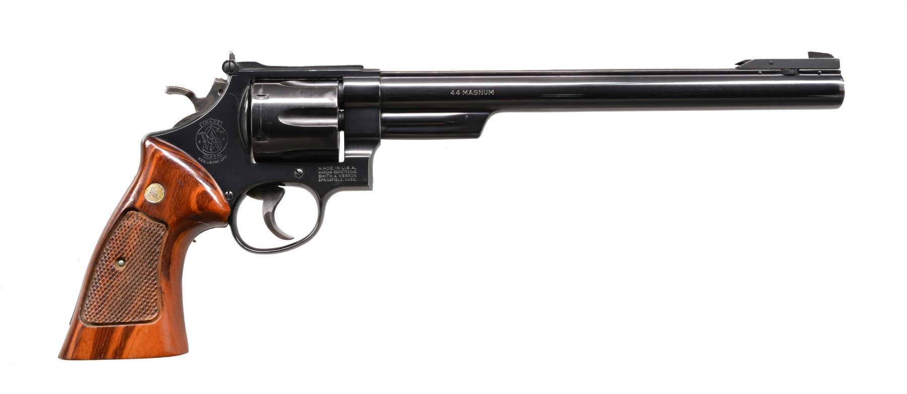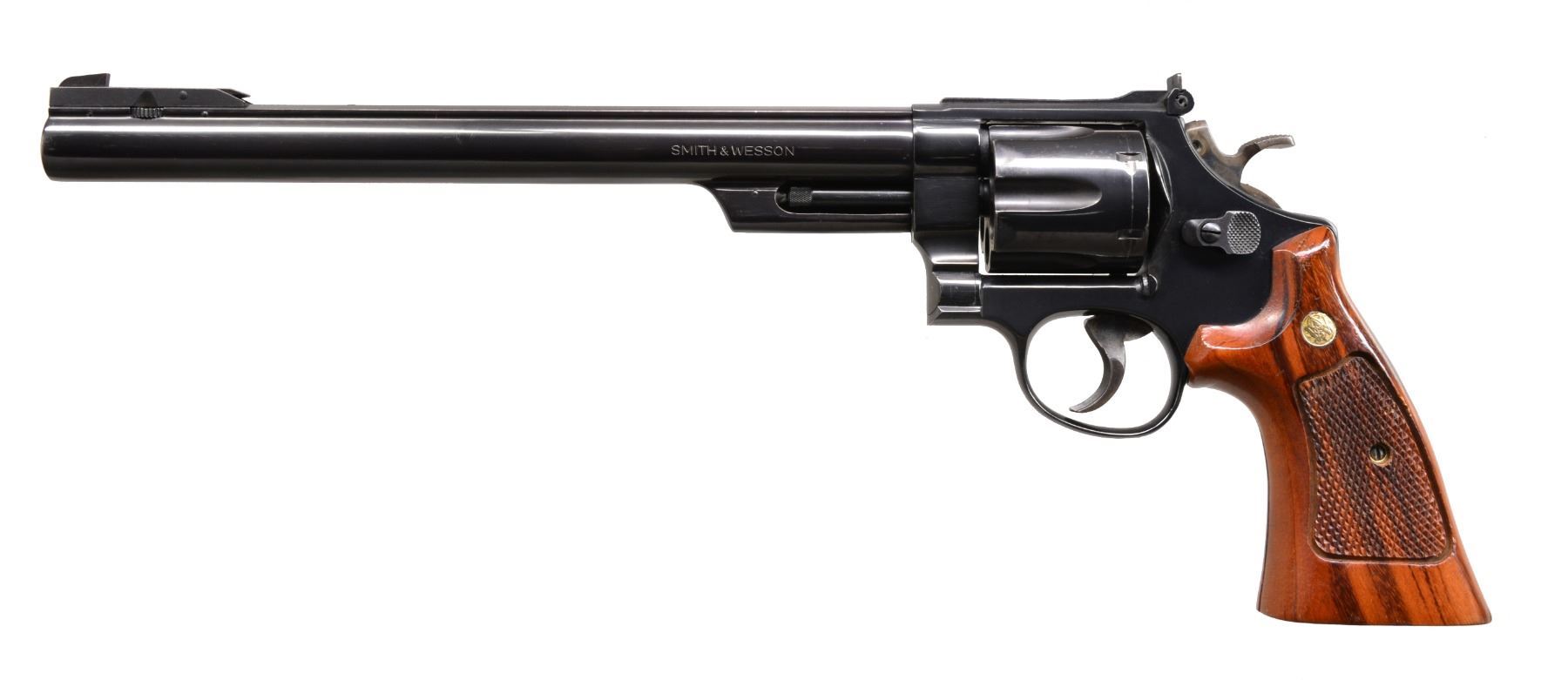 Cal. 44 Mag. S# AFE2585. Bbl. 10 5/8" w/ rib. Wheel adj. Patridge Silhouette front sight w/ square notch adj. rear sight. 6 Shot fluted cyl. Blue finish 3 screw action. Case colored target hammer & grooved target trigger. 2 Piece checkered Goncalo Alves grips w/ extractor cutout & silver S&W medallions. The Silhouette Model was mfg. 1983-1991. CONDITION: 90% blue showing light muzzle wear & cyl. drag line. Grips show light wear. Bore is bright w/ strong rifling. (20-22/DS). MODERN. $1,250-1,750.