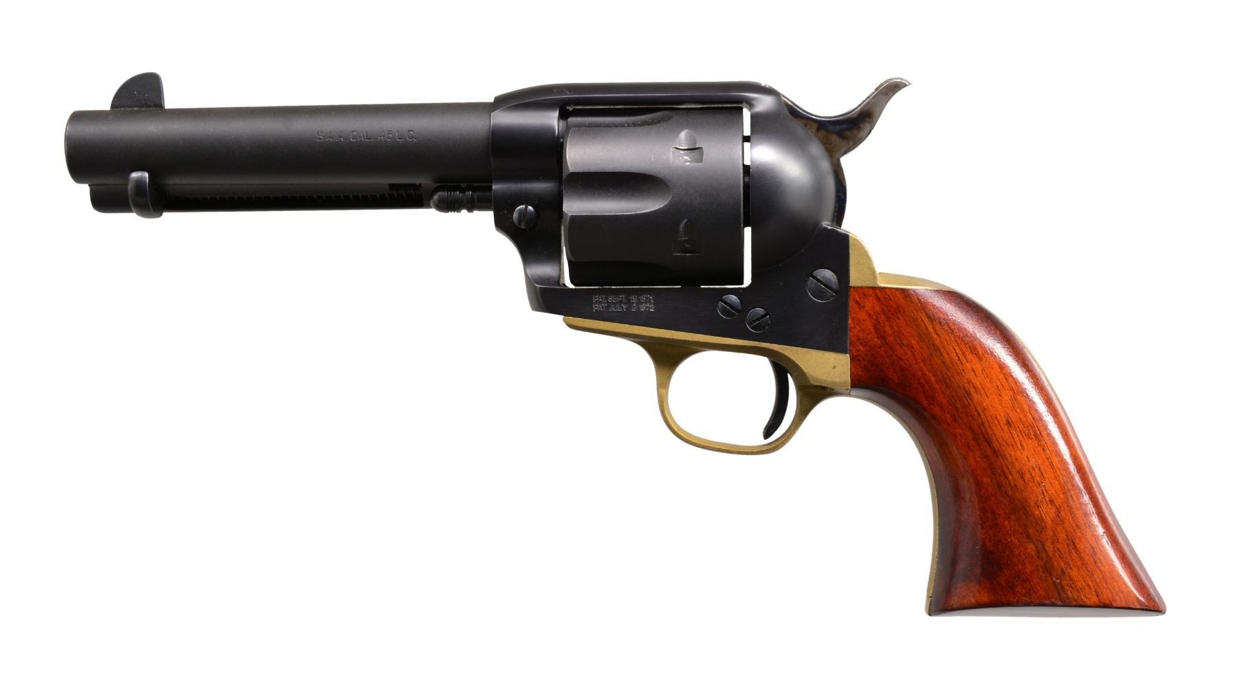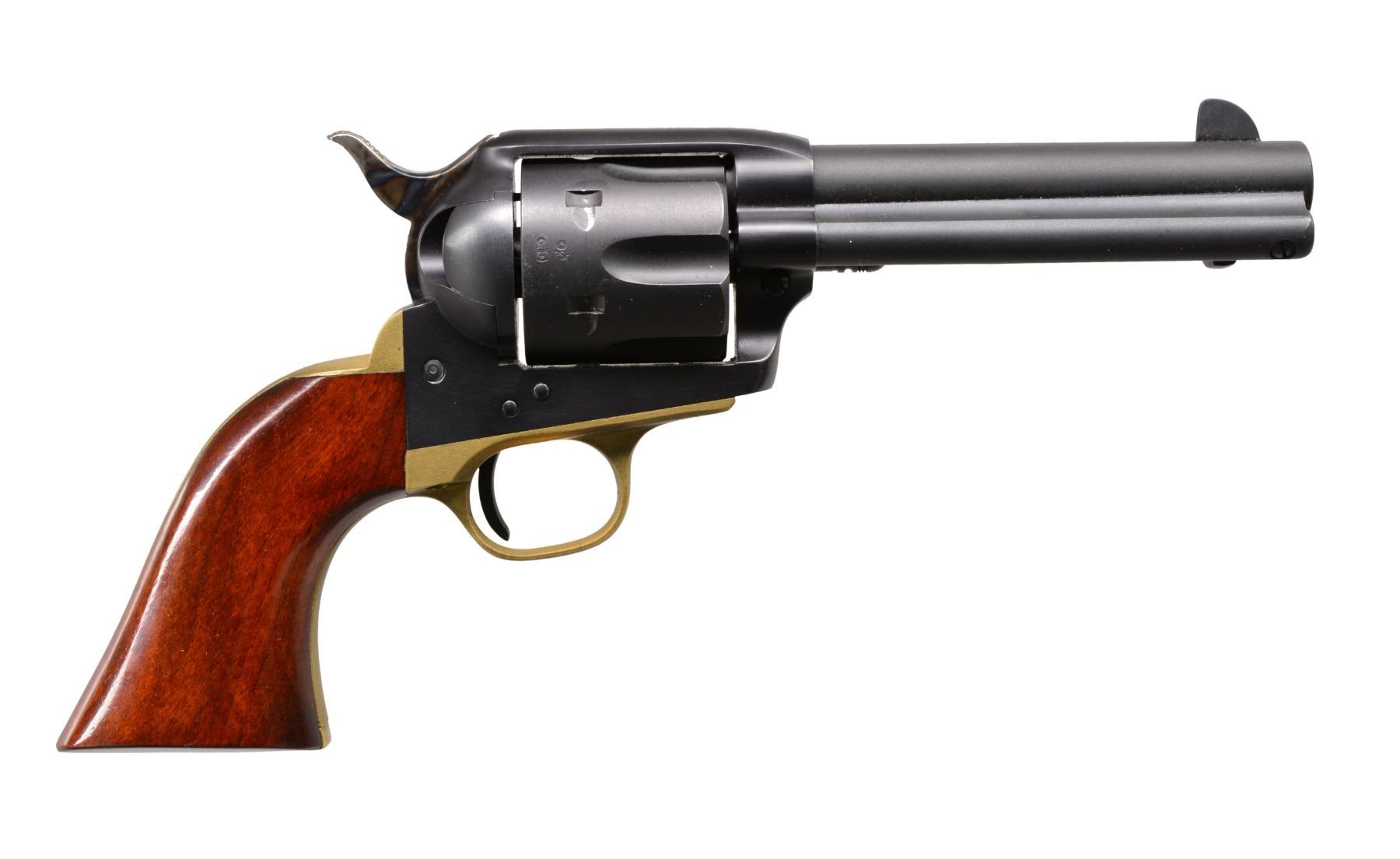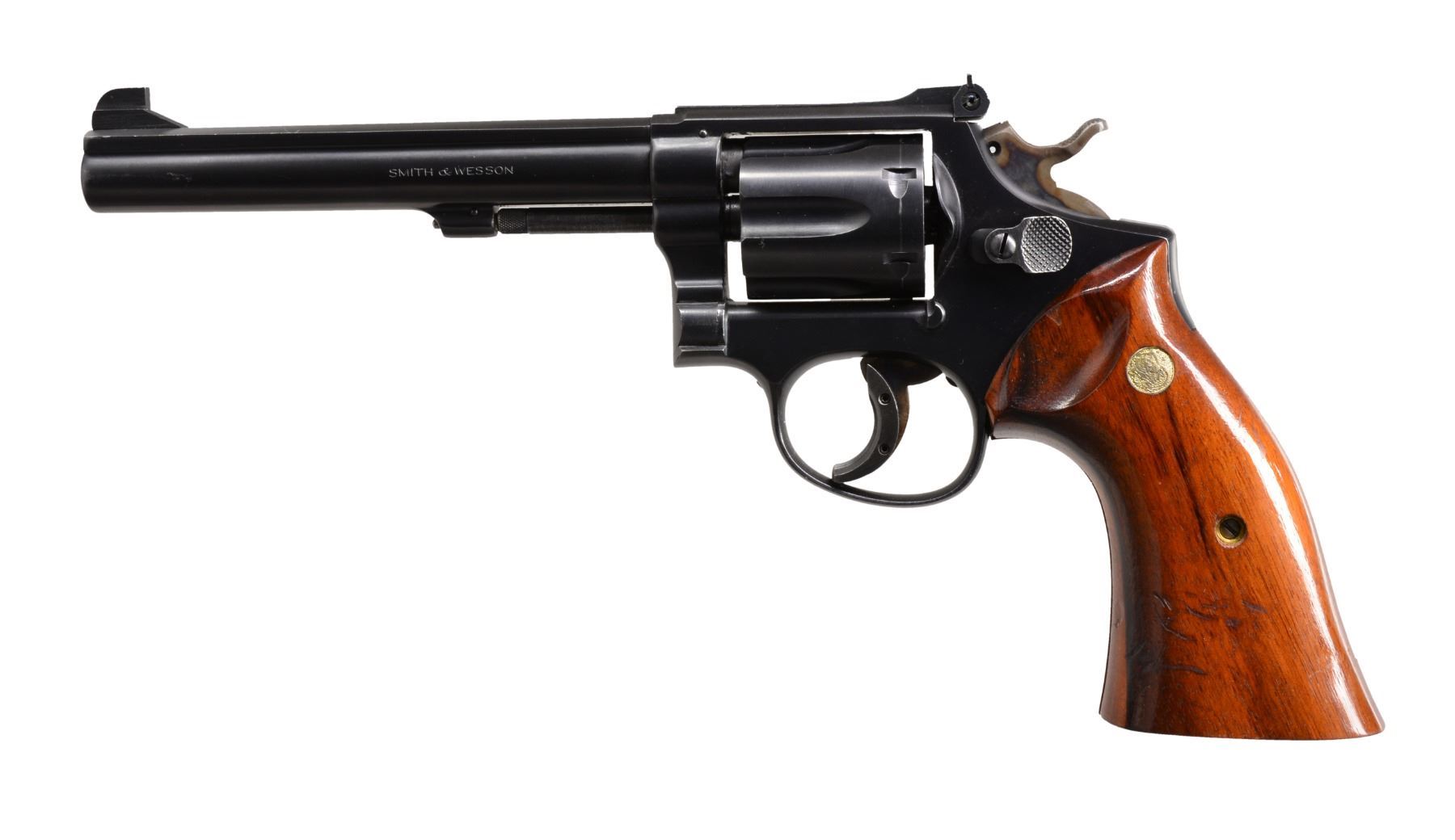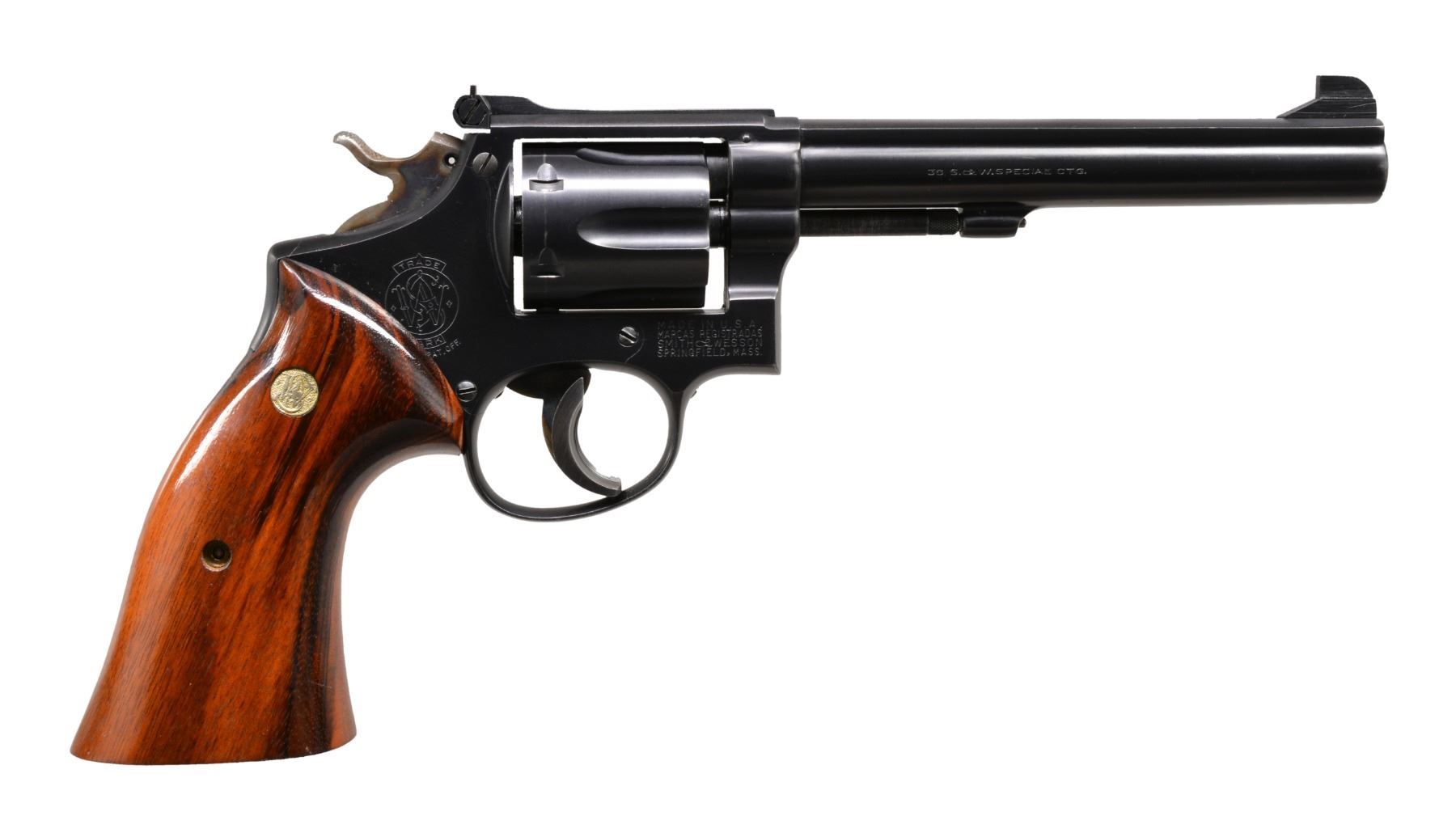 1) SMITH & WESSON K38 PRE MODEL 14 DA. Cal. 38 Spl. S# K218911. Bbl. 6" w/ rib. Patridge front sight w/ square notch adj. rear sight. 6 Shot fluted cyl. 5 Screw action w/ pinned bbl. Case colored trigger & .375" hammer. Aftermarket wide trigger shoe. 2 Piece Goncalo Alves smooth target grips w/ silver S&W medallions. CONDITION: over 95% blue showing light muzzle wear & cyl. drag line. Some action screws show screwdriver distortion or appear to be replaced. Grips show some heavy scratches. Bright bore w/ strong rifling. (20-152/DS). CURIO. 2) CABELAS / UBERTI MILLENIUM SA. Cal. 45 Colt. S# J07931. Bbl. 4 3/4" w/ blade front sight. 6 Shot fluted cyl. Matte black finish w/ case colored hammer & brass grip straps. 1 Piece walnut grips. Introduced in 1999. CONDITION: over 95% metal finish showing cyl. drag line. Grips show a few handling marks. Bore is bright w/ sound rifling. (20-161/DS). MODERN. $700-1,100.