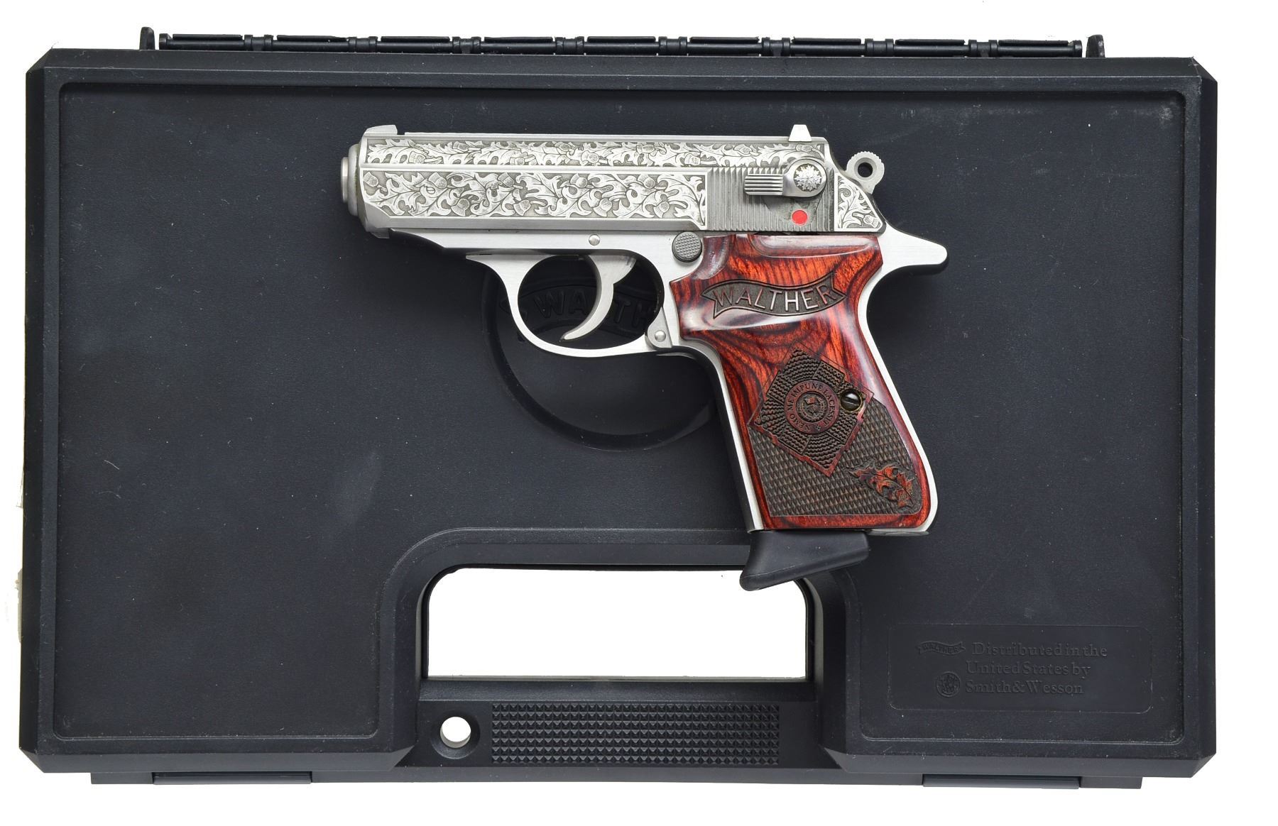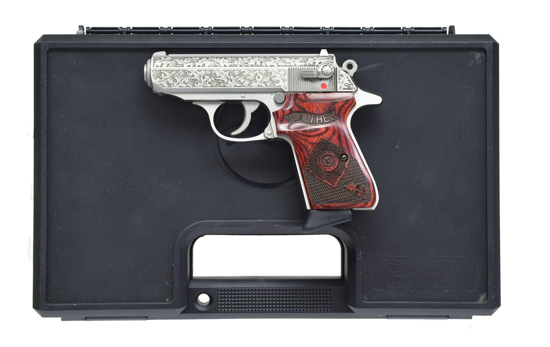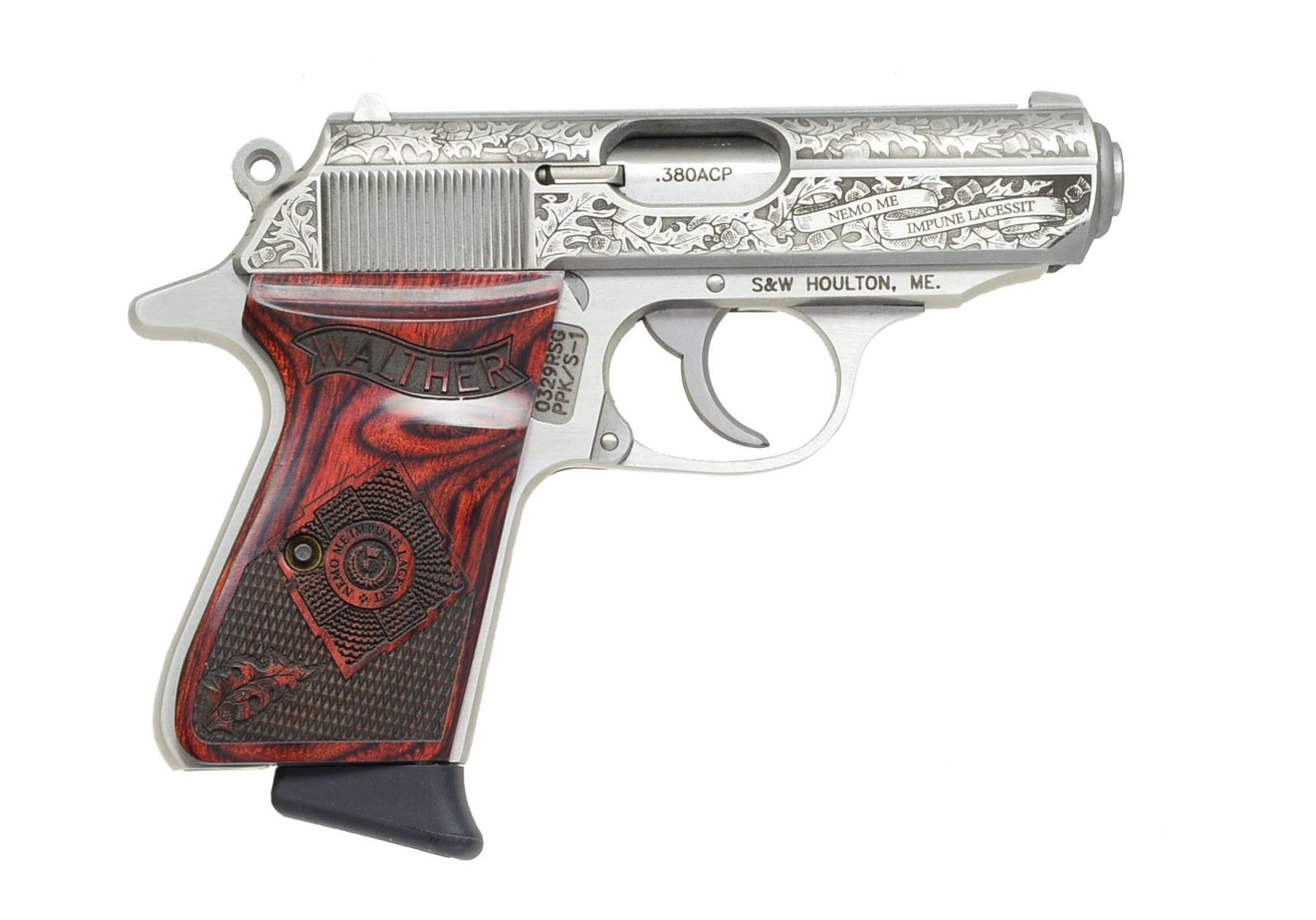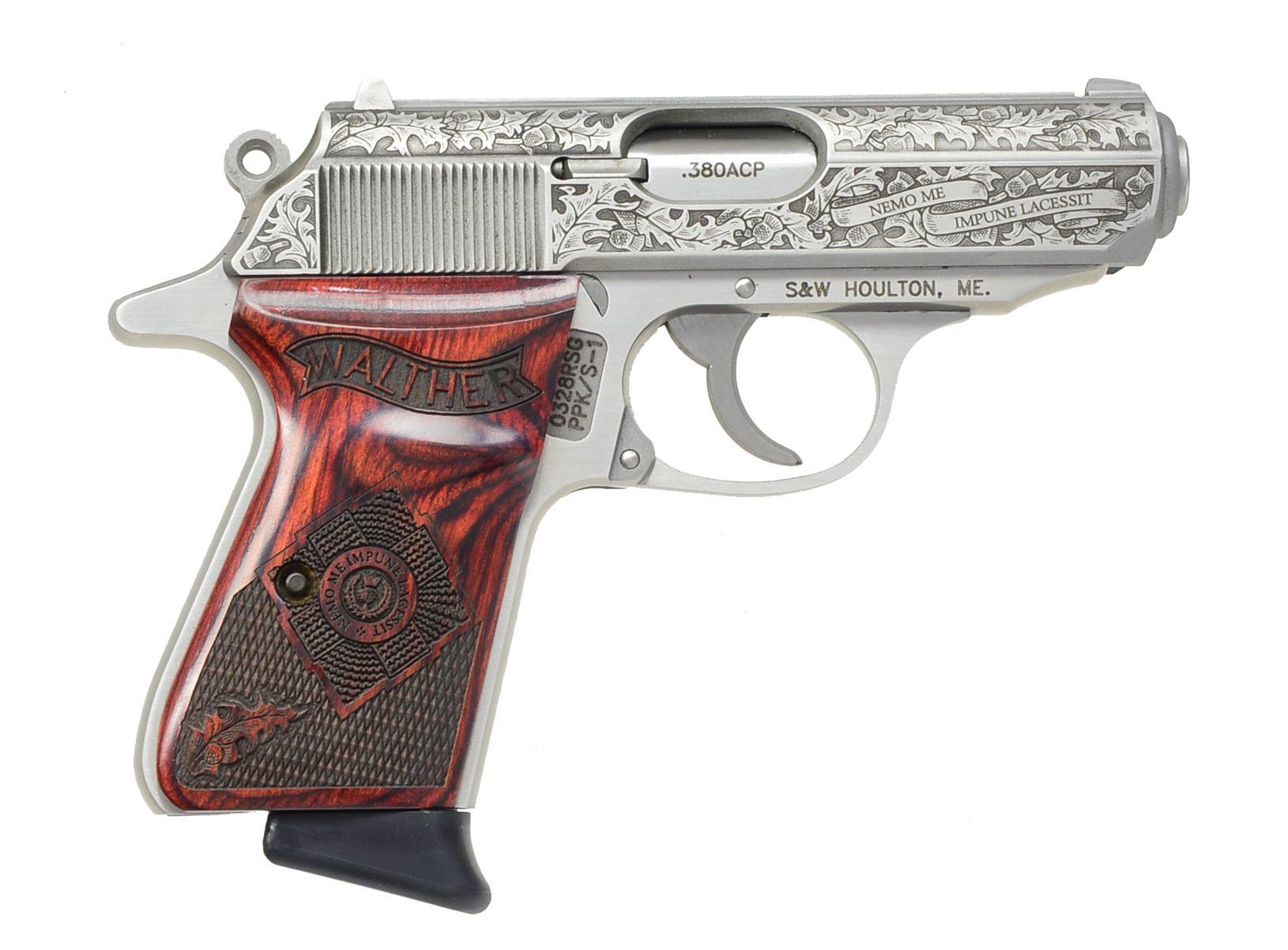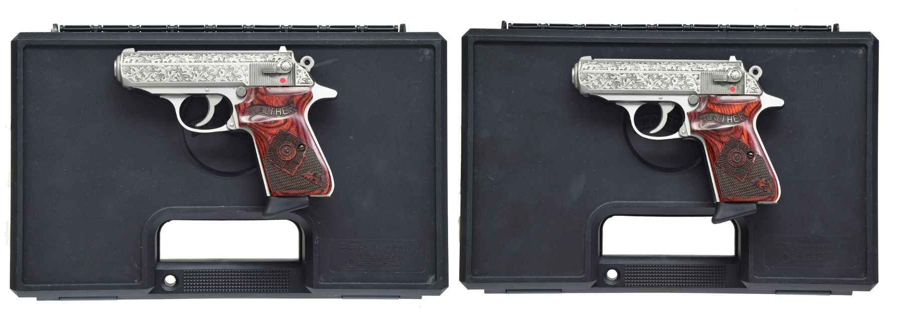 GUARD SEMI-AUTO PISTOLS. BOTH: cal. 380 ACP. Bbls. 3 1/4". Mfg. by S&W in Houlton, Maine for Talo group of distributors. Only 400 made in Fall of 2010 honoring Royal Scot Guard. Stainless w/ laser engraved slides of classic oak leaf design having shaded backgrounds. Two banners on on right front of slides has "NEMO ME" & "IMPUNE LACESSIT" meaning "No one attacks me with impunity" or "No one can harm me unpunished". This motto used also by British military & on US currency as early as 1778. Seldom (if ever) offered as consecutive pair. Grips are deluxe laser engraved ambidextrous finger / thumb rest laminated rosewood w/ checkering, oak leaf, Walther banner & RSG coat of arms having same inscription as slide. Frames are standard production w/out embellishment. MAGS: 4 Total; stainless ribbed 7 rd.; 2 w/ black plastic finger extensions & 2 w/ flat bases (1 of each type for each pistol). UNATTACHED ACCESSORIES: 2 black plastic padded cases w/ informative Talo labels & packaging (1 for each). CONDITION: all aspects of both near excellent appearing new, test fired only. 1) S# 0329RSG. (20-1312/NW). 2) S# 0328RSG. (20-1313/NW). BOTH MODERN. $1,500-2,200).