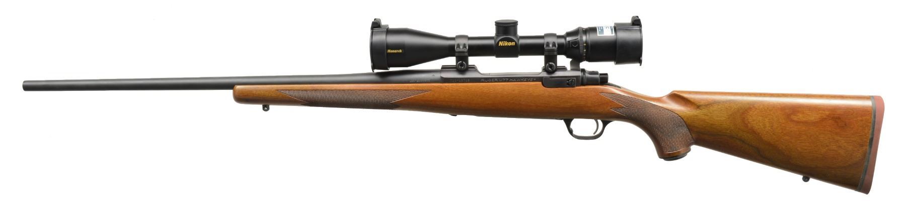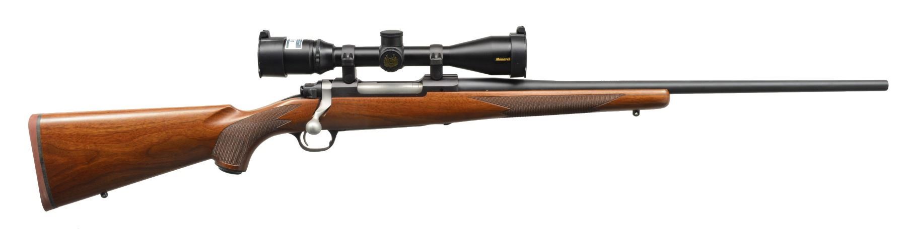 Cal. 257 Roberts. S# 710-13708. Bbl. 22" w/out provision for sights. Mfg. 2007 w/ newly designed slim checkered (wrap around pattern on forend) walnut stock having grip cap, QD sling studs & red pad. Matte finished including all stainless bolt & trigger. Incorporates new LC6 trigger & redesigned floorplate (laser engraved w/ SR eagle & RUGER) release. High matte finished Ruger rings w/ Nikon Monarch matte finished 2.5-10 scope having BDC Long Range Hunting reticle plus Euro fast focus. UNATTACHED ACCESSORIES: factory 257 box for light weight w/ different S#. CONDITION: all aspects near excellent including bore & scope set. (20-702/NW). MODERN. $500-750.