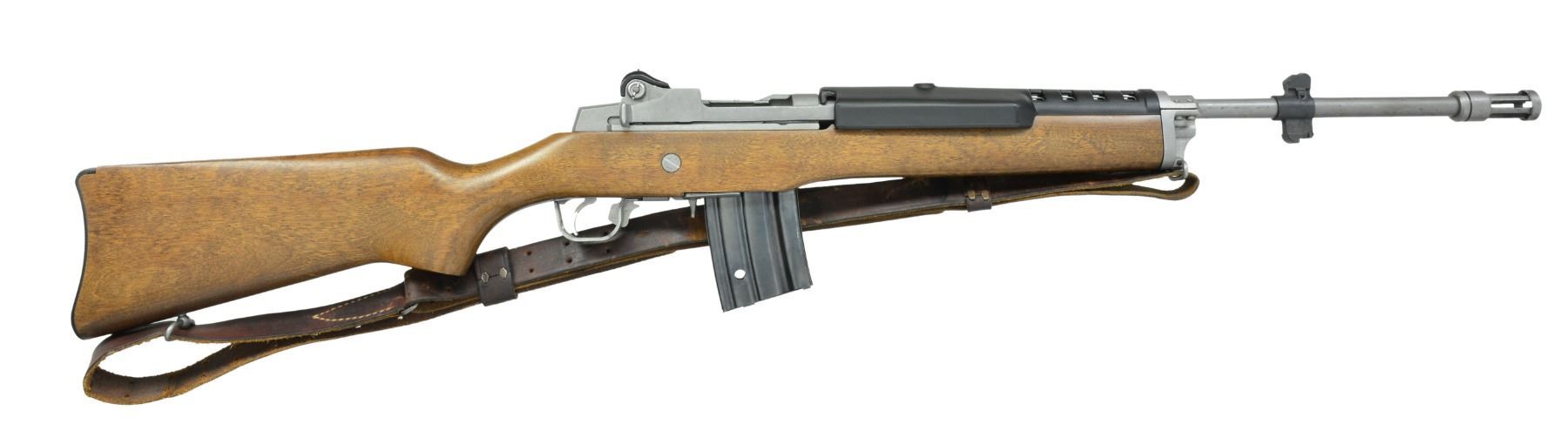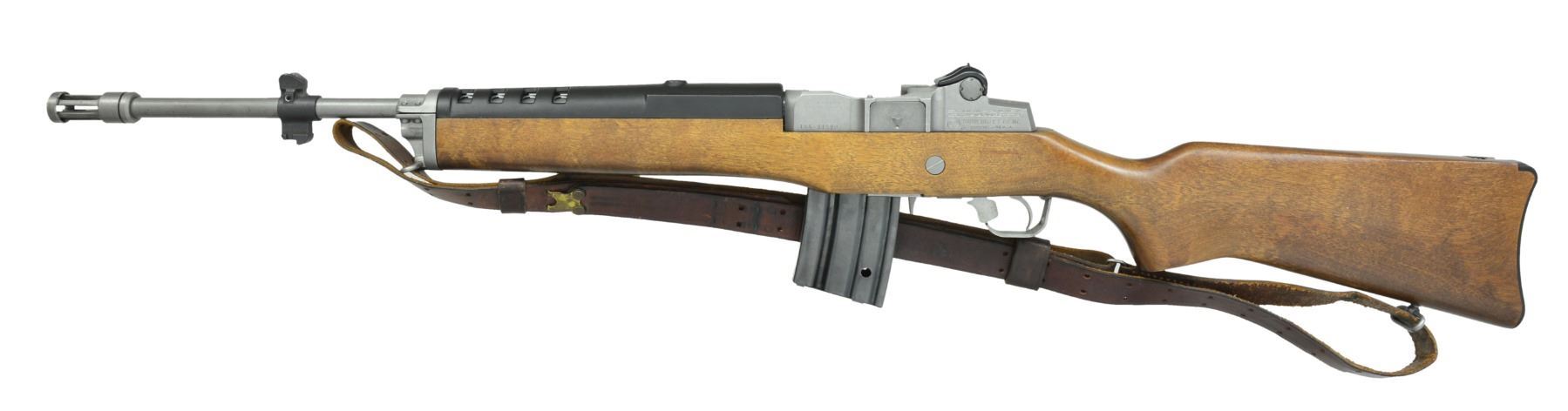 Cal. 223 Rem. S# 186-81590 Bbl. 20" over factory"GB" style flash hider. Stainless steel bbl. & action w/ hardwood stock. Plastic ventilated forend. "GB" style front sight & bayonet. Elevation & windage adj. peep sight. Left side of receiver above S# marked"RESTRICTED LAW ENFORCEMENT/GOVERNMENT USE ONLY". Beaver Bros. leather sling. MAGS: 1 aftermarket steel 20 rd. CONDITION: bbl. exhibits very light staining. Stock very good to near excellent. Fire control mechanism appears to function properly when cycled by hand. Clean bore w/ strong rifling. (20-368/JZ). MODERN. $500-800.