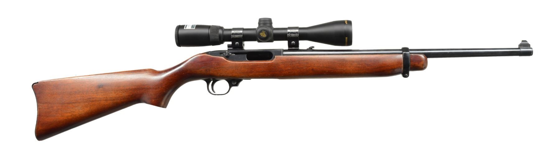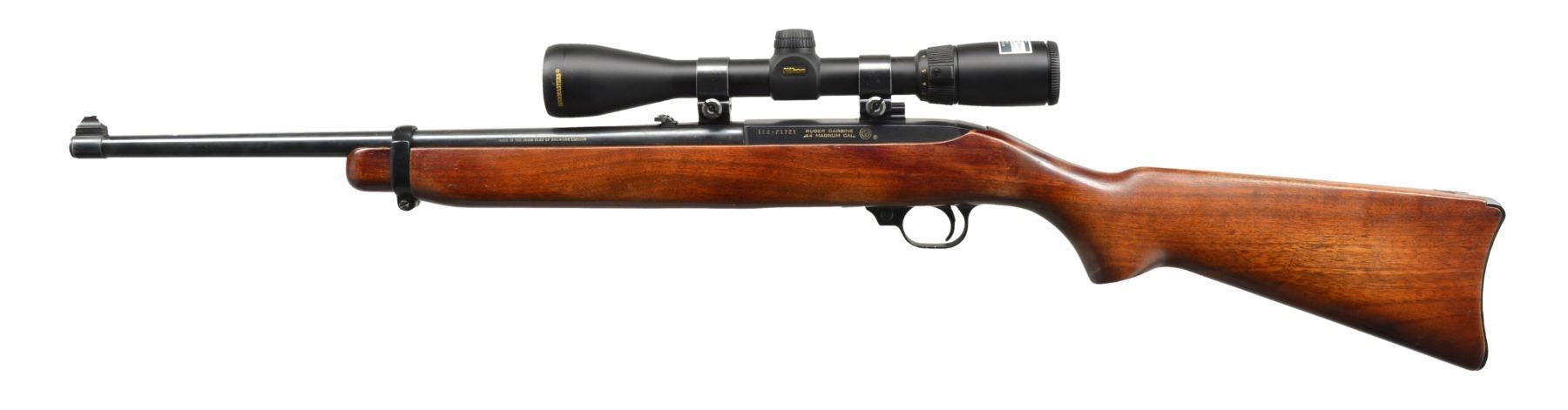 Cal. 44 Mag. S# 102-21721. Bbl. 18 1/2" w/ band mounted bead front sight & folding leaf rear sight. Nikon Buckmasters 3-9x matte finished scope w/ BDC long range hunting reticle on Weaver mts. Tubular mag. in forearm. Bbl. & action markings have gold fill. Walnut carbine stock w/ aluminum buttplate. CONDITION: over 95% blue. Original wood finish shows a few sm. marks. Bright near excellent bore. Scope has clear optics. (20-1324/DS). MODERN. $500-700.