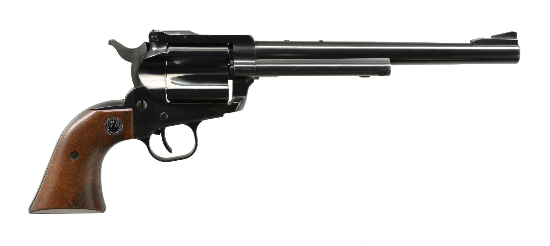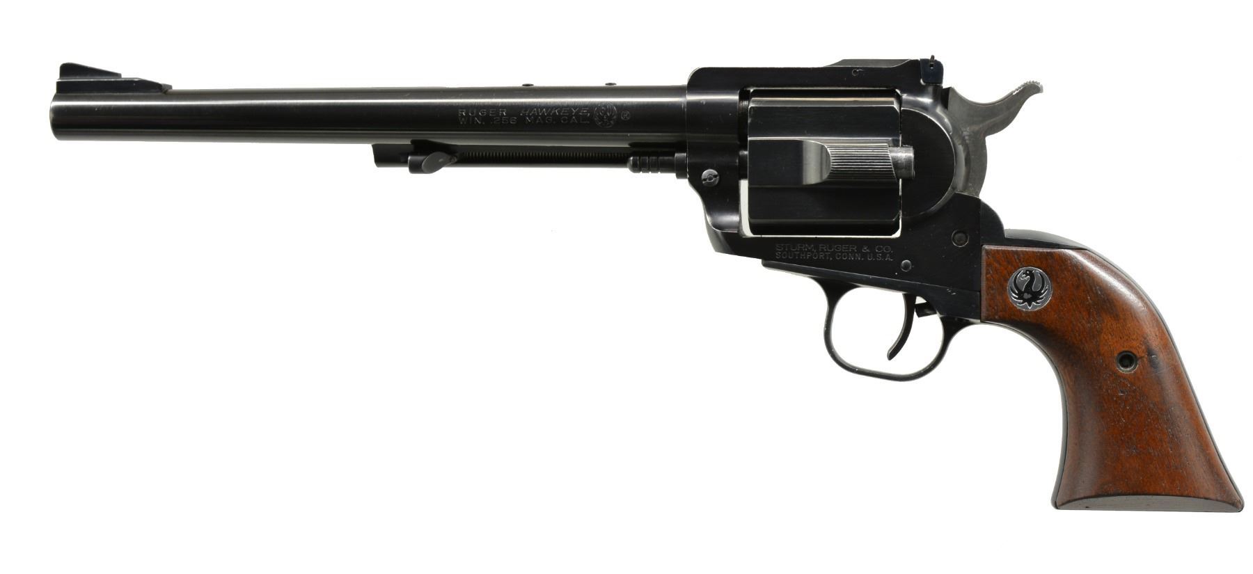 Cal. 256 Mag. S# 742. Bbl. 8 1/2" w/ standard ramped front blade plus 2 factory drilled & tapped holes for scope mt.; plug screws installed. Standard adj. unmarked frame mounted alloy rear sight. Modification of popular Blackhawk designed for long range varmint shooting. Mfg 1963 (1963-1964; approx. 3.300 units) as RH28 w/ rotating breech block replacing cyl. allowing cartridge to be inserted into rear of bbl. Factory experimented w/ 221 Rem. Fireball & 357 Rem. Maximum. Standard XR3-RED grip frame fitted w/ wide Super Blackhawk style trigger (hammer resembles Old Army model); walnut grips having black eagle medallions. Early spring loaded breech block stop pin (up to S# 975) & steel ejector housing (up to S# 862). CONDITION: very good early example w/ minimal marks & some slight high point wear. Top of breech block at rear scratched due to over turned sight elevation screw. Nice early example w/ near excellent bore & grips. (20-1311/NW). CURIO. $1,500-2,000.