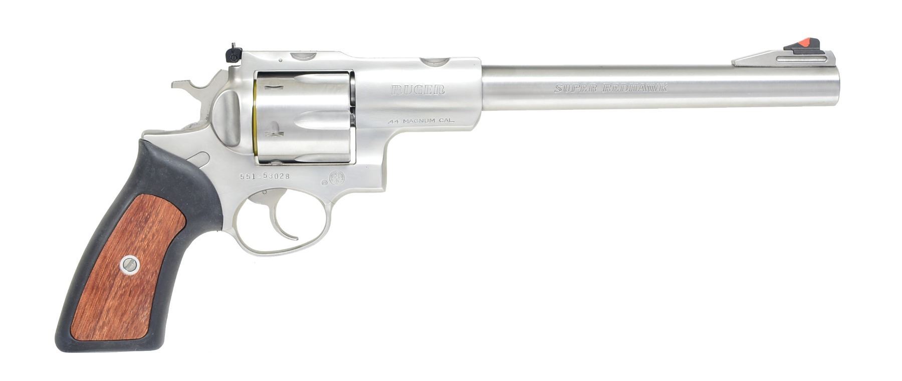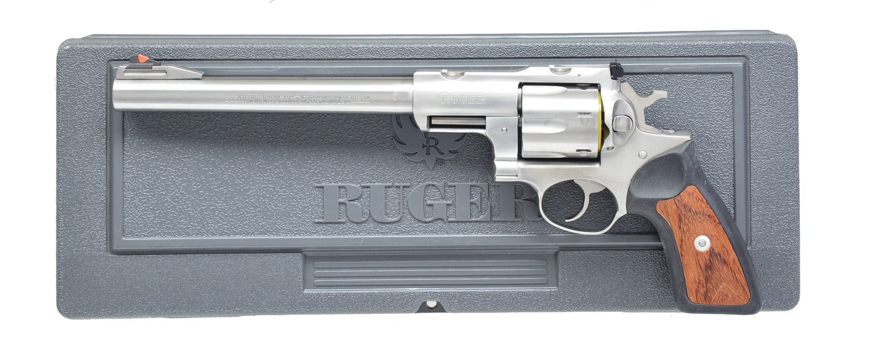 Cal. 44 Mag. S# 551-53028. Bbl. 9 1/2". Mfg. 1999 as stainless w/ rubber grip having wood insert panels. Extended frame machined for Ruger rings. Quick interchangeable red insert front sight & white outline adj. rear. UNATTACHED ACCESSORIES: 1� Ruger scope rings & factory gray plastic case w/ packaging. CONDITION: all aspects near excellent appearing new & unfired. (20-1340/NW). MODERN. $500-750.