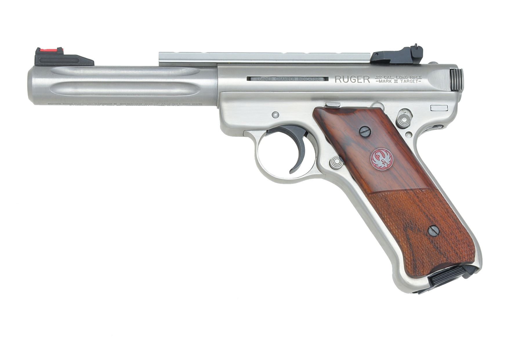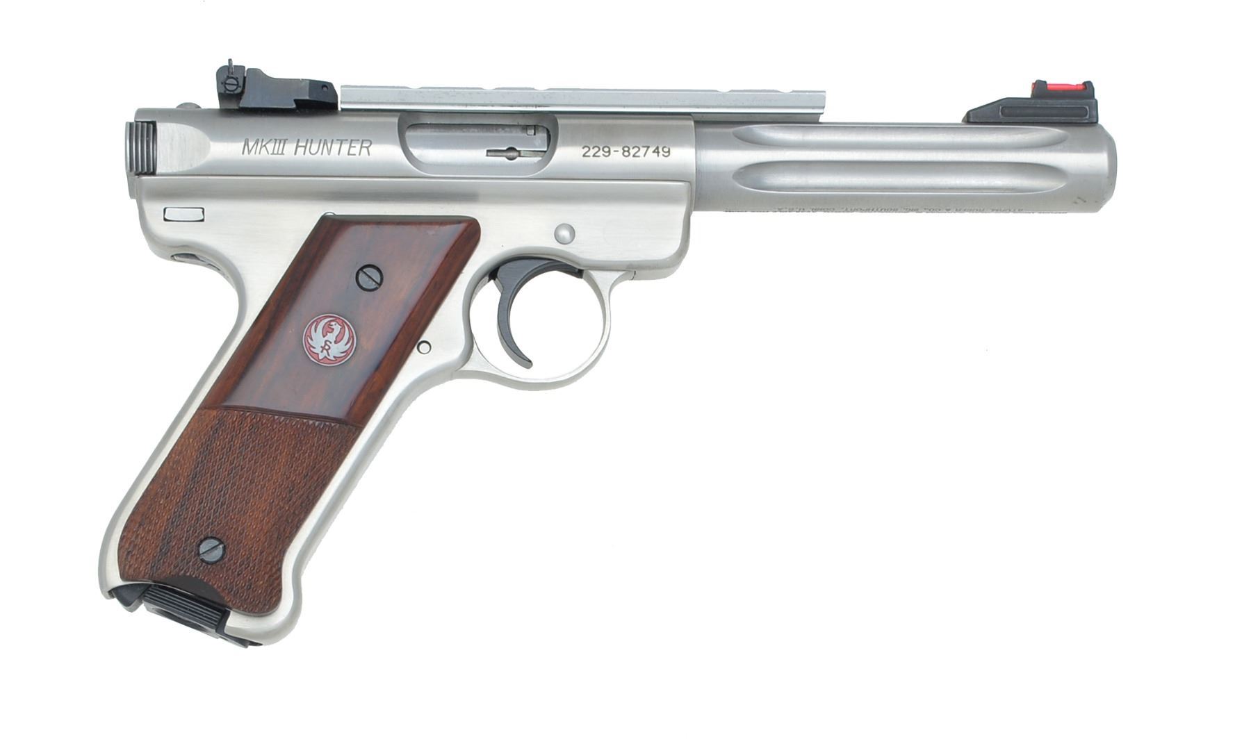 Cal. 22 LR. S# 229-82749. Bbl. 5 1/2" fluted bull w/ ramp red fiber optic front sight & adj. rear having V notch plus vertical line. Mfg. 2010. Attached silver Ruger scope base. Checkered rosewood grips w/ red eagle medallions. MAGS: 1 factory 10 rd. CONDITION: all aspects near excellent including bore. (19-5992/NW). MODERN. $300-450.