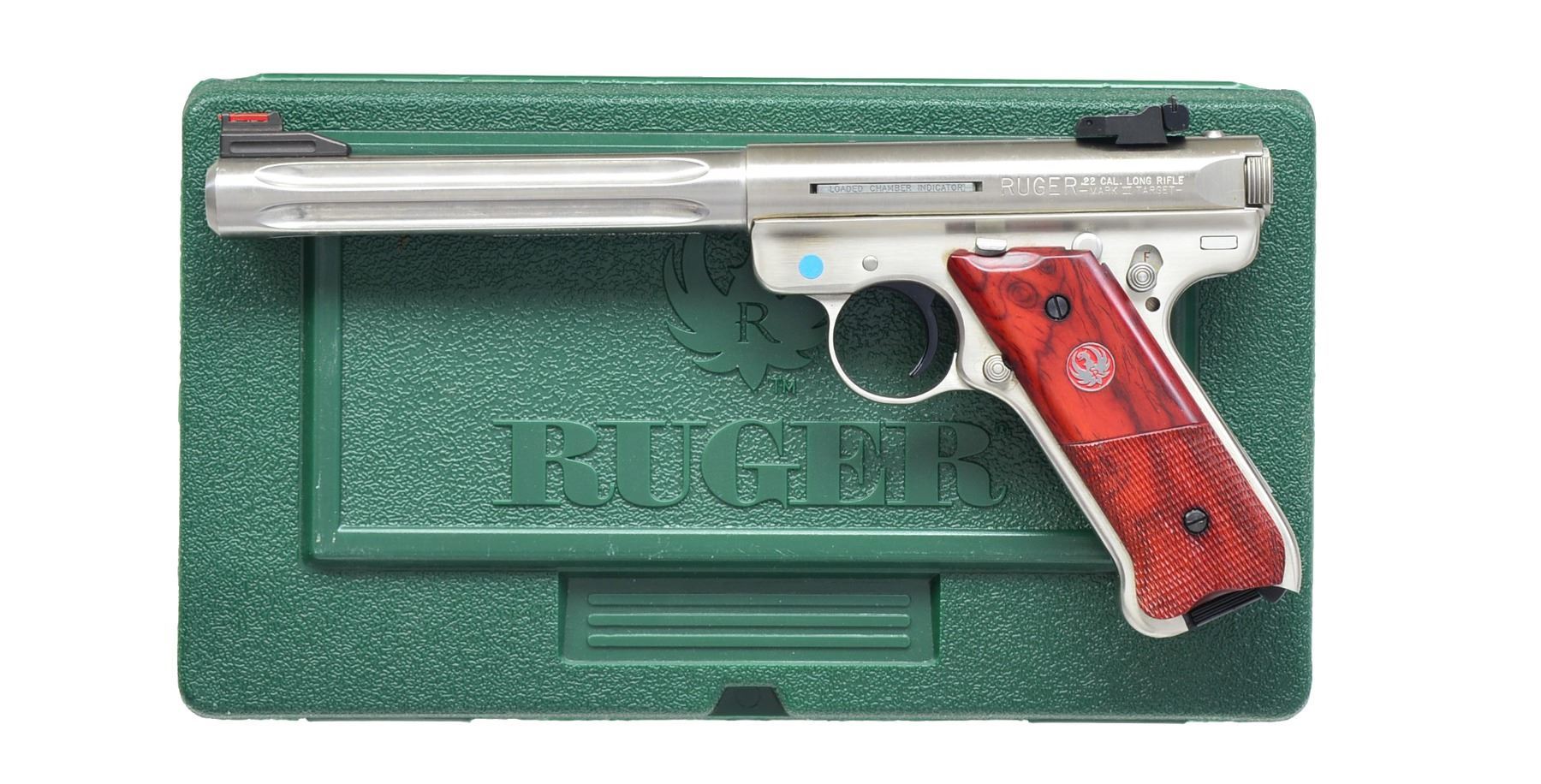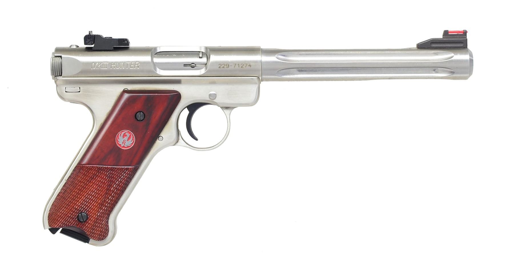 Cal. 22 LR. S# 229-71274. Bbl. 6 7/8" fluted bull bbl. w/ red fiber optic front sight allowing interchangeable LitePipes; receiver mounted adj. rear sight w/ hunter V notch & white vertical line. Receiver factory drilled & tapped for scope base. Left side loaded chamber indicator. Mfg. 2009 as KMKIII678H w/ steel frame having internal lock, grooved black trigger, push button mag. release & checkered rosewood grips; red background eagle medallions. MAGS: 3 blued factory 10 rd. UNATTACHED ACCESSORIES: factory hunter green plastic case w/ extra LitePipes, internal lock keys, scope base & general packaging. CONDITION: all aspects near excellent including bore; appears new including blue inspection sticker on frame. (20-1334/NW). MODERN. $350-500.