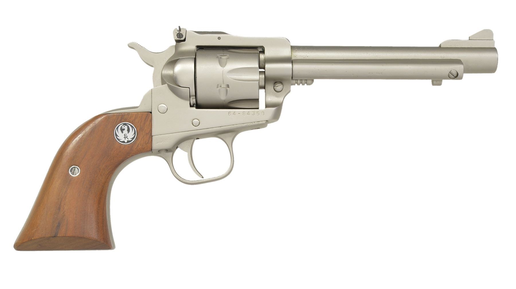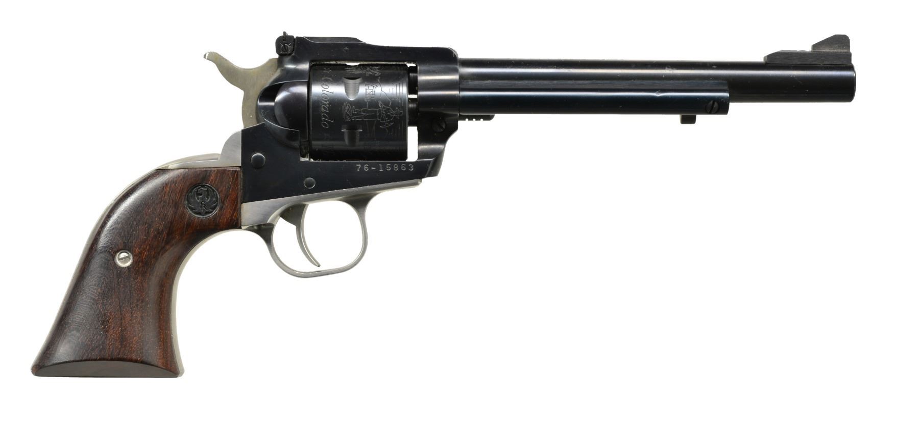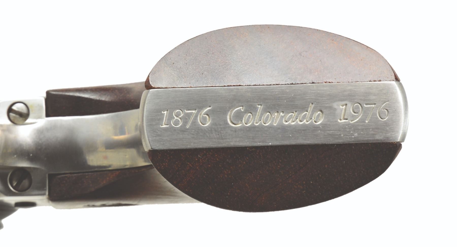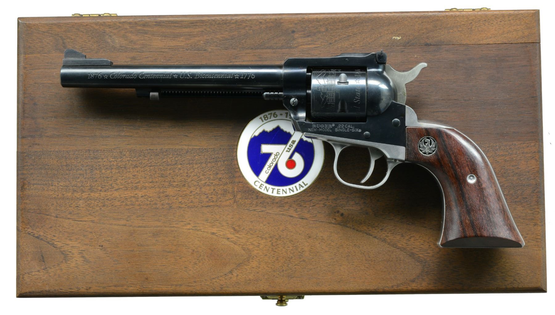 1) COLORADO CENTENNIAL. Cal. 22 LR / 22 Mag. S# 76-15863. Bbl. 6 1/2" w/ ramp front sight & adj. square notch rear sight. 6 Shot rnd. cyl. w/ special Colorado theme roll engraving & inscription. Bbl., cyl., loading gate & frame have blue finish. Stainless steel grip frame, butt marked "1876 COLORADO 1976". 2 Piece rosewood grips w/ black eagle medallions. Limited edition of 15,000 mfg. in 1975. UNATTACHED ACCESSORIES: walnut presentation box w/ blue interior containing spare cyl. CONDITION: near excellent in the box, appears unfired. (20-46/DS). 2) NEW MODEL SINGLE SIX REVOLVER. Cal. 22 LR. S# 64-84350. Bbl. 5 1/2". Top of bbl. is marked "MADE IN THE 200th YEAR OF AMERICAN LIBERTY". Ramp front sight w/ square notch adj. rear sight. 6 Shot fluted cyl. Added full coverage Cadmium finish. 2 Piece walnut grips. CONDITION: 98% Cadmium finish over scattered spots of remaining pitting showing cyl. drag line. Grips have very good finish. Bore shows light pitting. (20-83/DS). BOTH MODERN. $800-1,200.