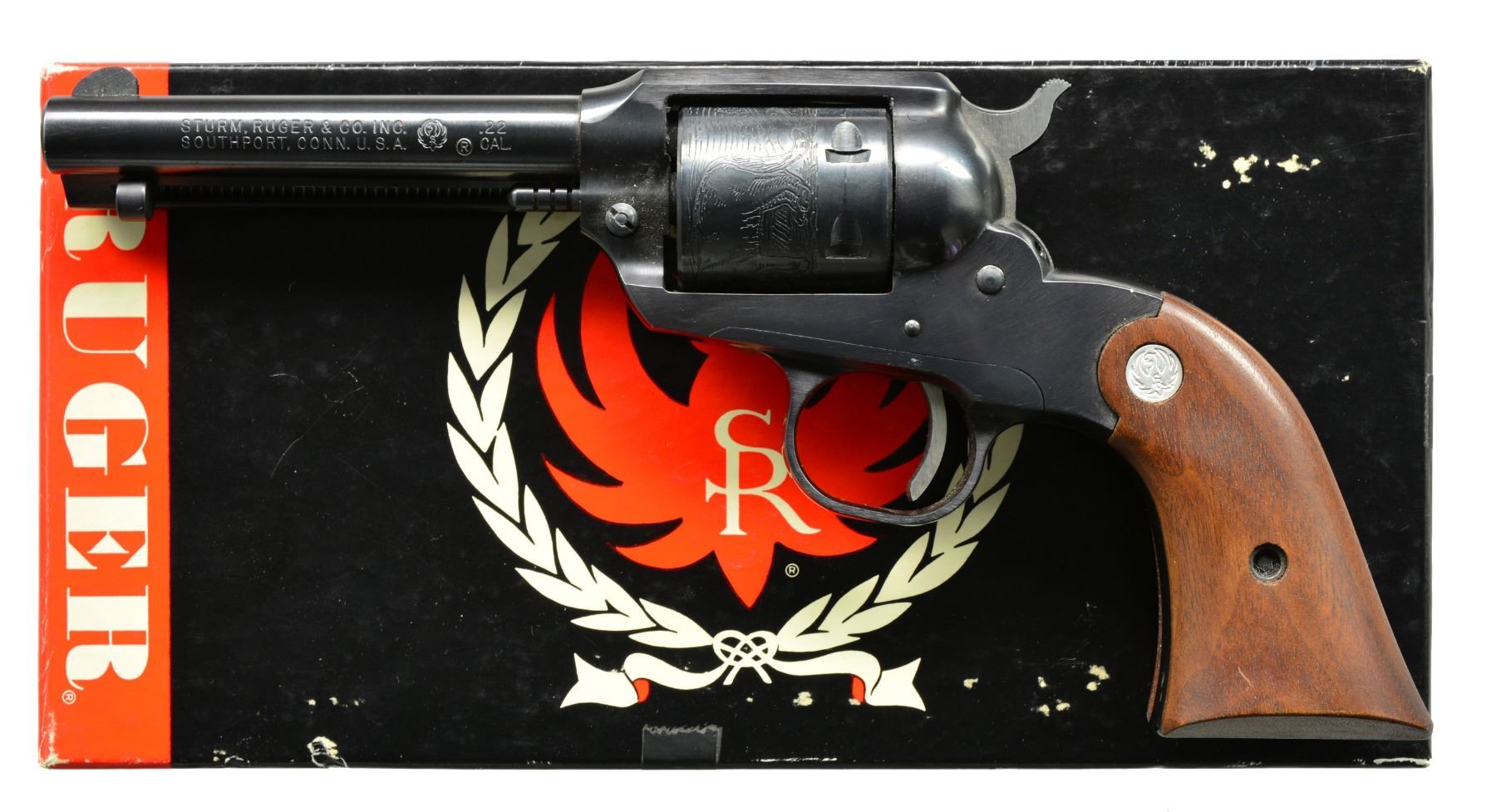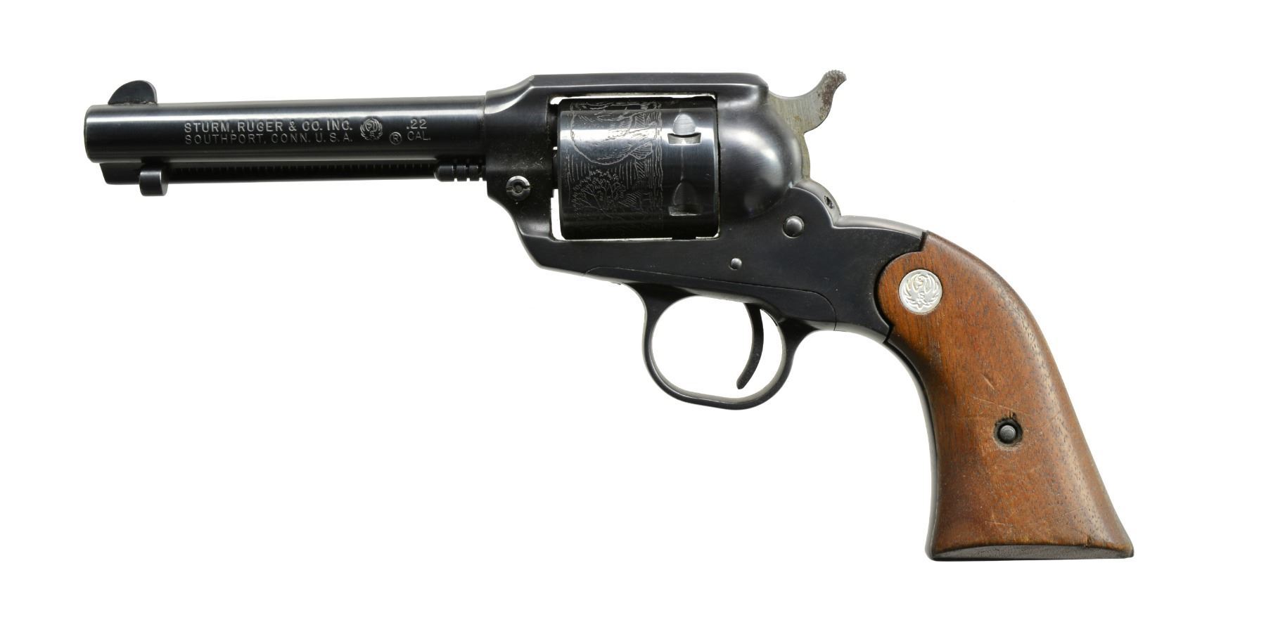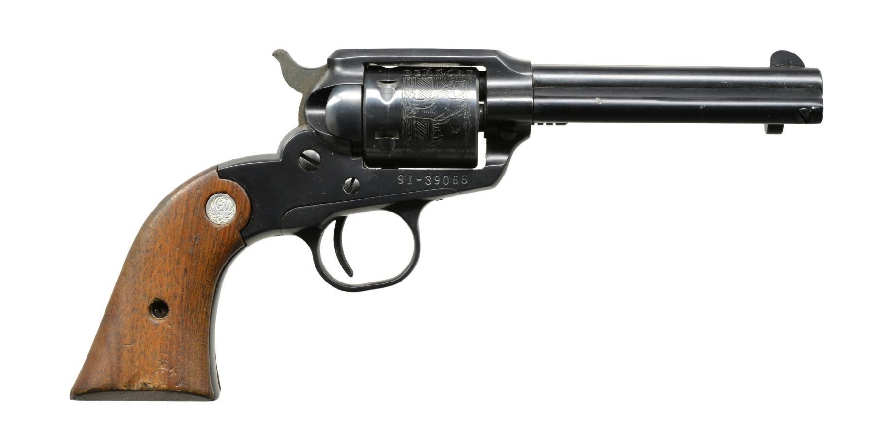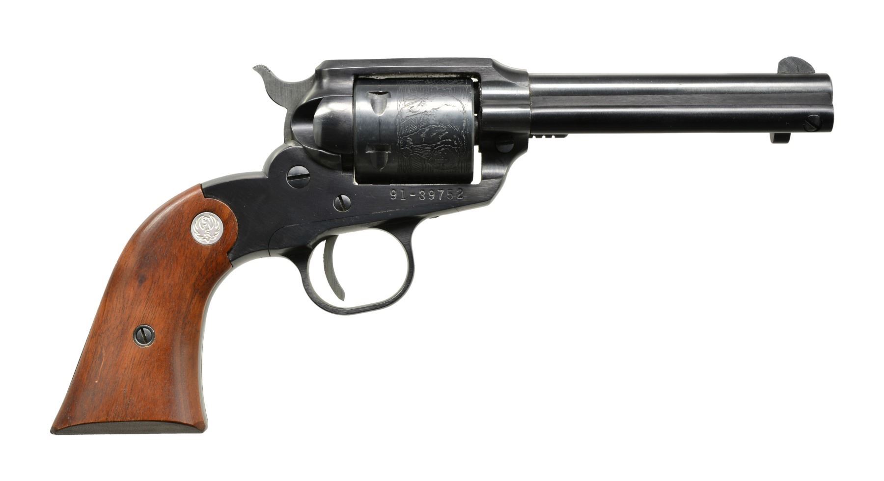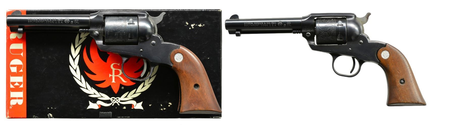BOTH: cal. 22 LR. Bbls. 4" w/ blade front sights & fixed square notch rear sights. 6 Shot roll engraved cyls. Blue finish w/ steel frames & trigger guards. 2 Piece walnut grips w/ silver eagle medallions. Mfg. 1972. 1) S# 91-39752. UNATTACHED ACCESSORIES: 2 piece red & black box containing instructions, registration card. Box has 1 torn corner. CONDITION: 98% blue w/ light cyl. drag line & muzzle wear. Very good grips. Bright bore w/ sound rifling. (20-56/DS). 2) S# 91-39066. CONDITION: 97% original blue showing light muzzle wear & drag line. Polished sides of hammer show spots of corrosion. Grips have worn finish w/ sm. chips at butt. Bright bore w/ sound rifling. (20-59/DS). BOTH MODERN. $900-1,200.