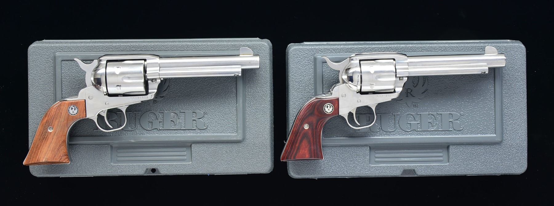 BOTH: cal. 45 Colt. Bbls. 5 1/2" w/ blade front sights plus frame notched rears. Polished finishes w/ 6 rd. fluted cyls. Silver eagle grip medallions. UNATTACHED ACCESSORIES: factory matching gray plastic case w/ packaging for each. CONDITION: very faint cyl. turn lines & cleaned firing residue showing mainly on cyl. faces. 1) VAQUERO. S# 56-78828. Original lg. frame model. Mfg. 1998 w/ rosewood grips. (20-1342/NW). 2) NEW VAQUERO. S# 512-71788. Smaller frame size like original Flat Tops w/ contoured laminated rosewood grips. Mfg. 2014. (20-1356/NW). BOTH MODERN. $650-900.