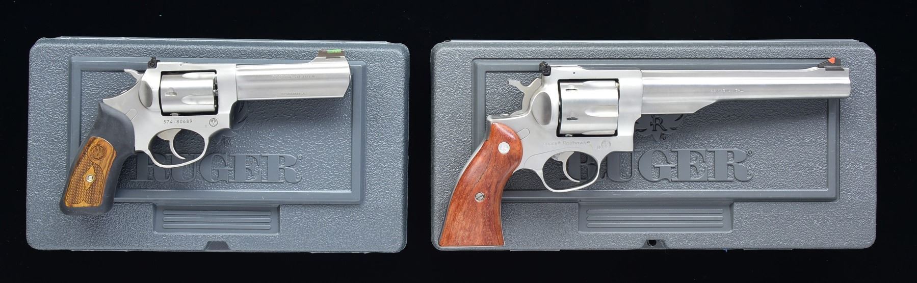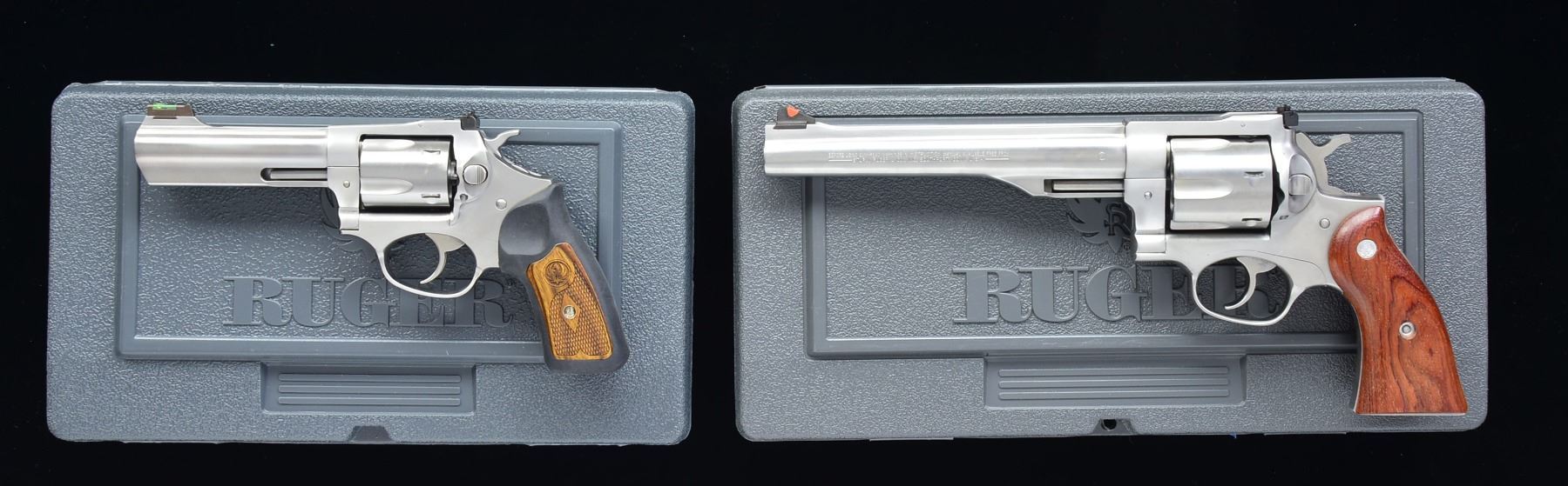 BOTH: UNATTACHED ACCESSORIES: factory gray plastic box w/ packaging for each. 1) SP101. Cal. 357 Mag. S# 574-80689. Bbl. 4.2" w/ green fiber optic front sight & adj. rear. Mfg. 2011 w/ rubber grip having diamond center checkered laser engraved Ruger logo wood inserts. 5 Rd. fluted cyl. CONDITION: all aspects near excellent including bore; appears new unfired. (20-1332/NW). 2) REDHAWK. Cal. 44 Mag. S# 503-17145. Bbl. 7 1/2" ribbed w/ quick change red insert front sight & white outline adj. rear. Mfg. 1996 w/ service style rosewood grips having silver medallions. 6 Rd. fluted cyl. CONDITION: very faint trace of cyl. turn line plus cleaned firing residue showing mainly on cyl. face. All other aspects near excellent including bore & grips. (20-1339/NW). BOTH MODERN. $650-900.